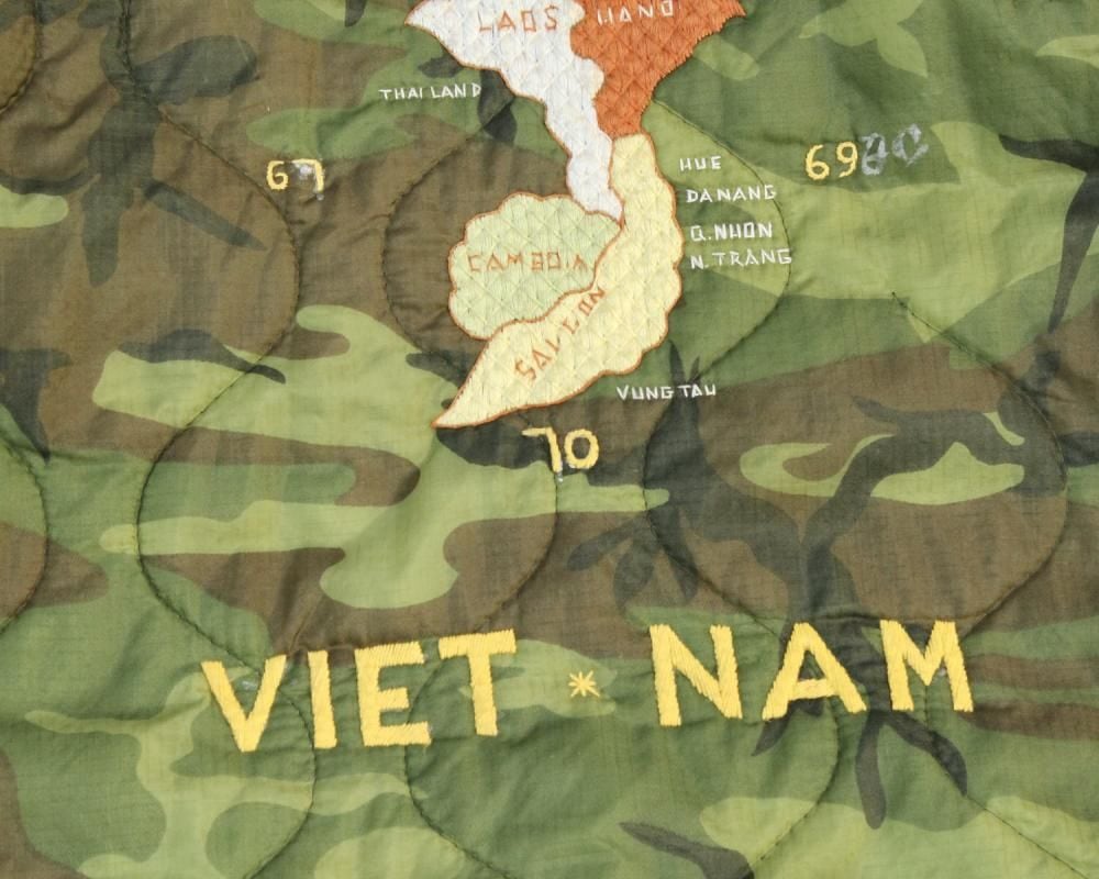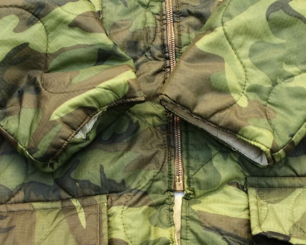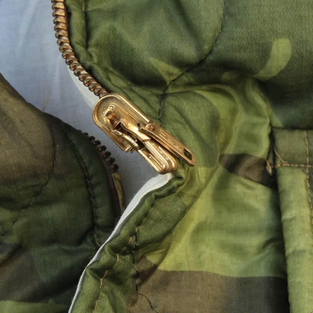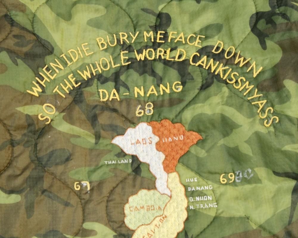 This souvenir jacket was made by the U.S. Marine Corps stationed at Da Nang Air Base during the Vietnam War. Crafted from ripstop polyester and quilted woodland camouflage fabric, it offers a distinctive military look, unique to this era. The back features the words WHEN I DIE BURY ME FACE DOWN THE WHOLE WORLD CAN KISS MY ASS embroidered by hand, rather than machine-sewn, for a soft, distinctive look. This rare size offers a comfortable, roomy fit, even among the many smaller items. While there are some loose quilting stitching, primarily around the shoulders, stains on the lining, and vertical shrinkage of the lining, these are typical signs of vintage aging for this item. *Measurements were taken without stretching. As this is an old item, there may be occasional fading due to age. Please review the photos and understand the characteristics of vintage items before purchasing.
