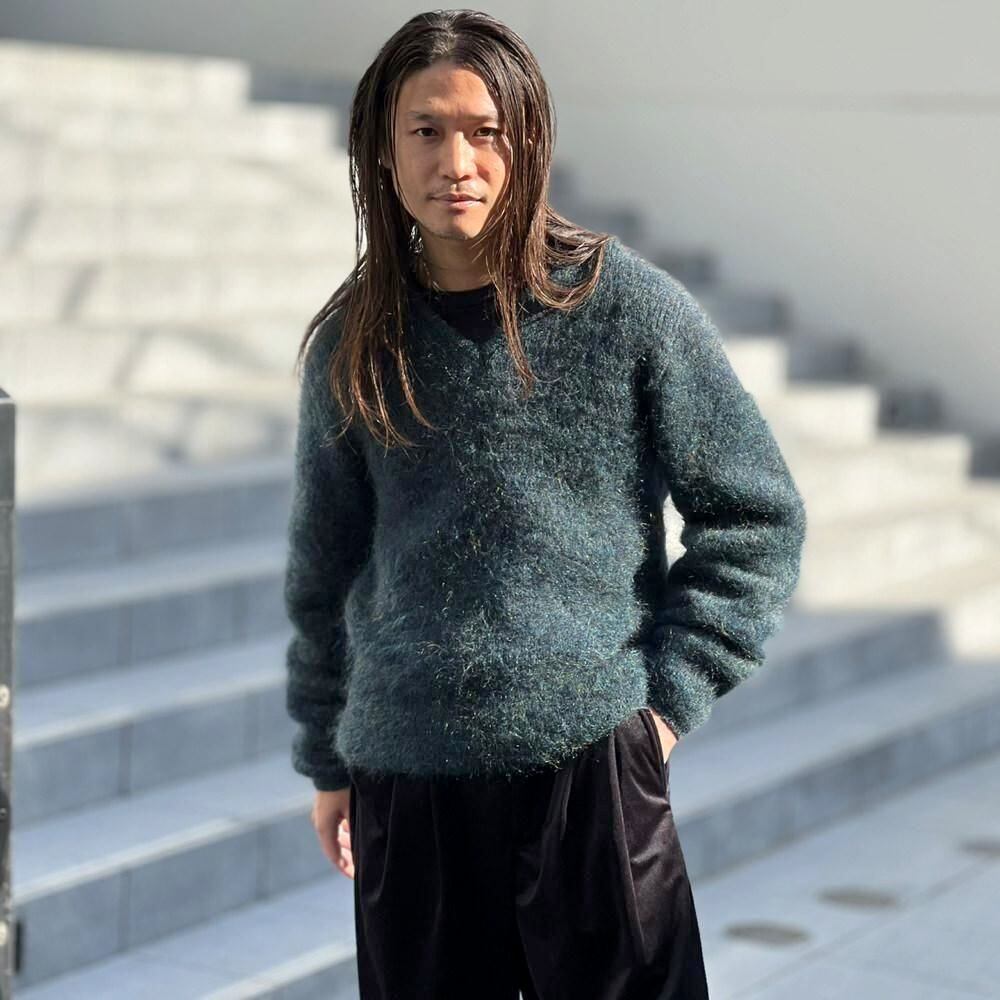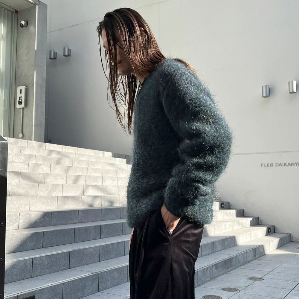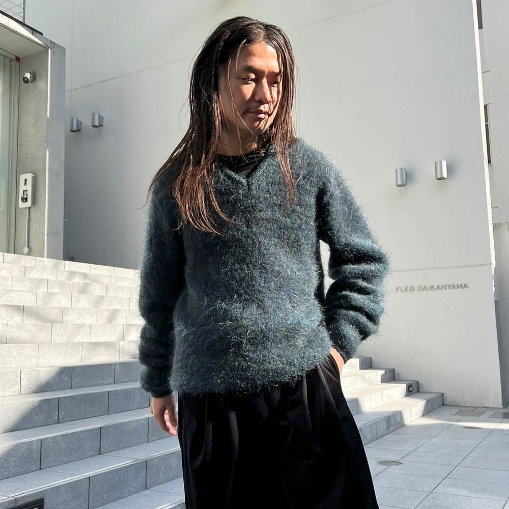 This is a 1960s mohair sweater. It has a very nice dark blue hue with khaki and gray accents. There is no quality label, so its hard to say for sure, but I think it has a fairly high percentage of mohair blended in with the fluffy, long hair.