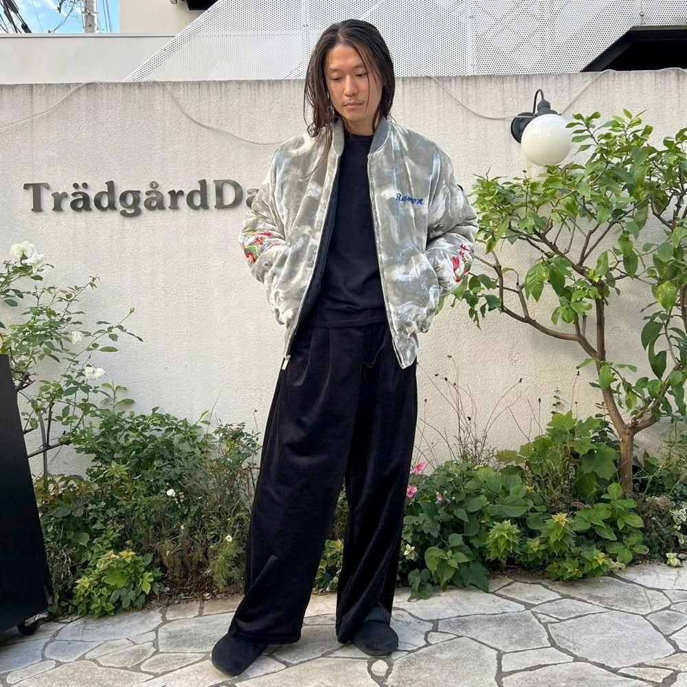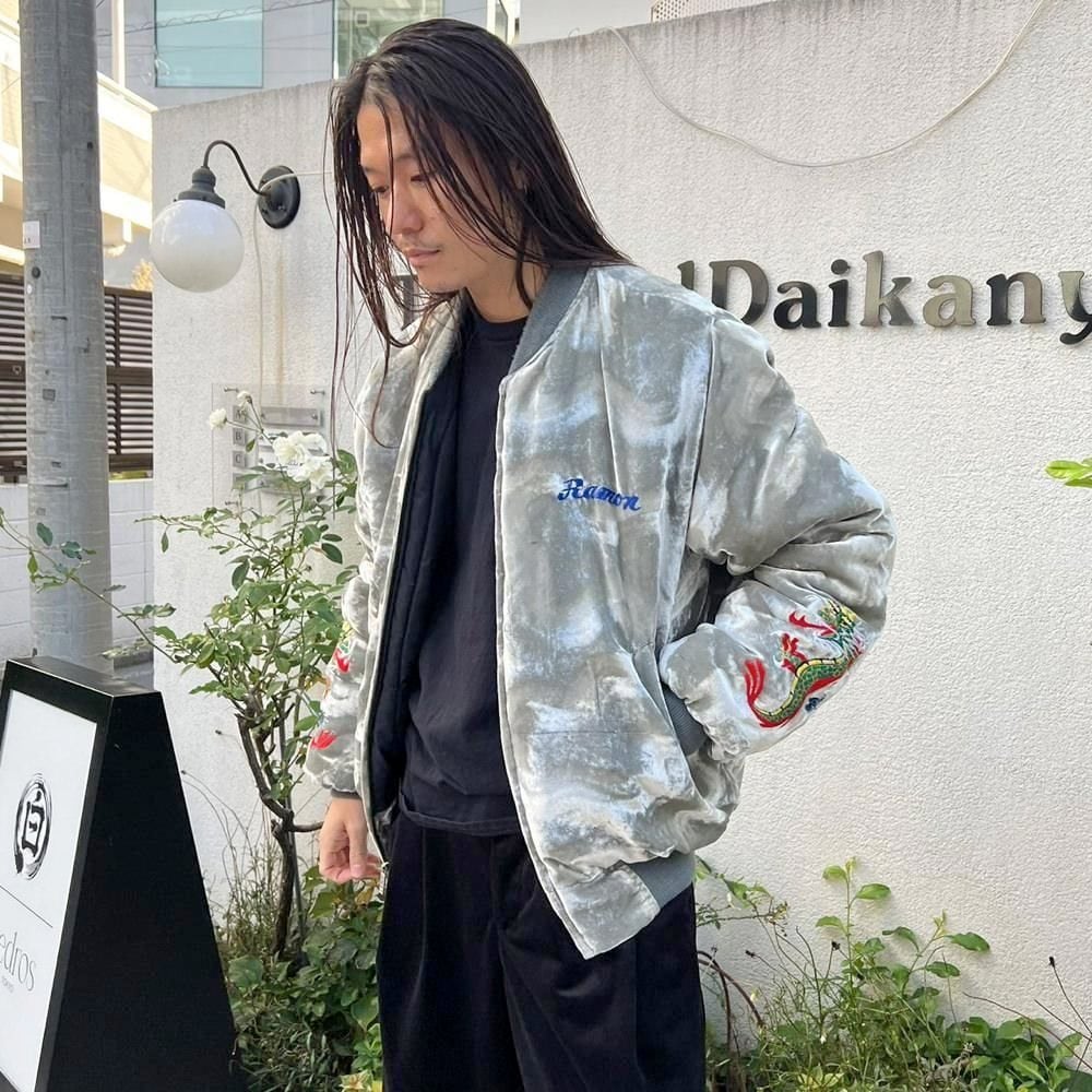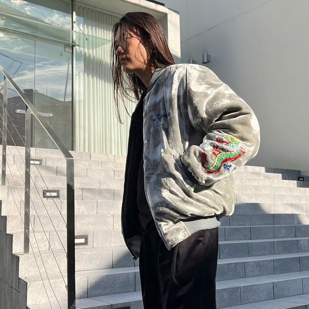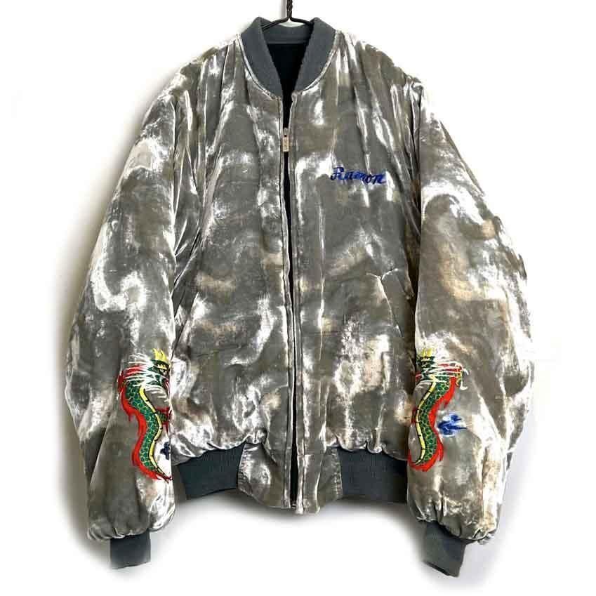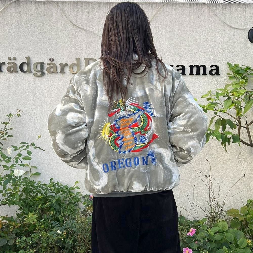 This 1980s Oregon velvet souvenir jacket features a striking silver-gray color and dragon embroidery on both sleeves and back. Its relaxed fit makes it a vintage souvenir jacket.