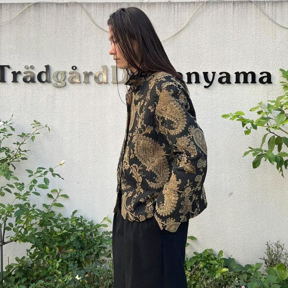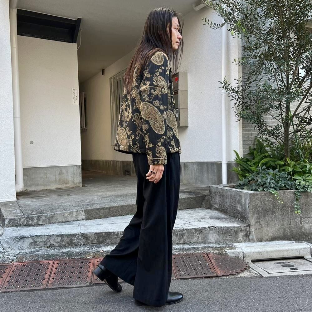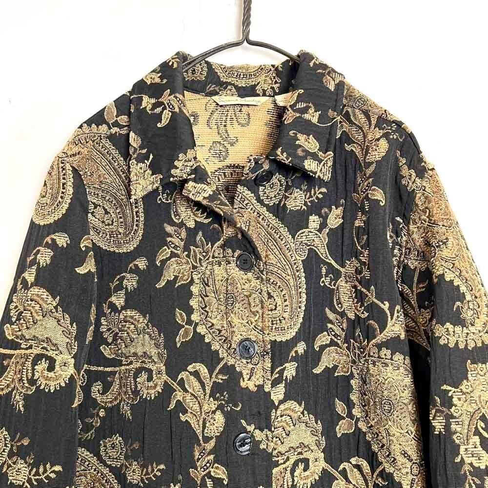 This 90s Gobelin jacket features a luxurious black and khaki paisley pattern.