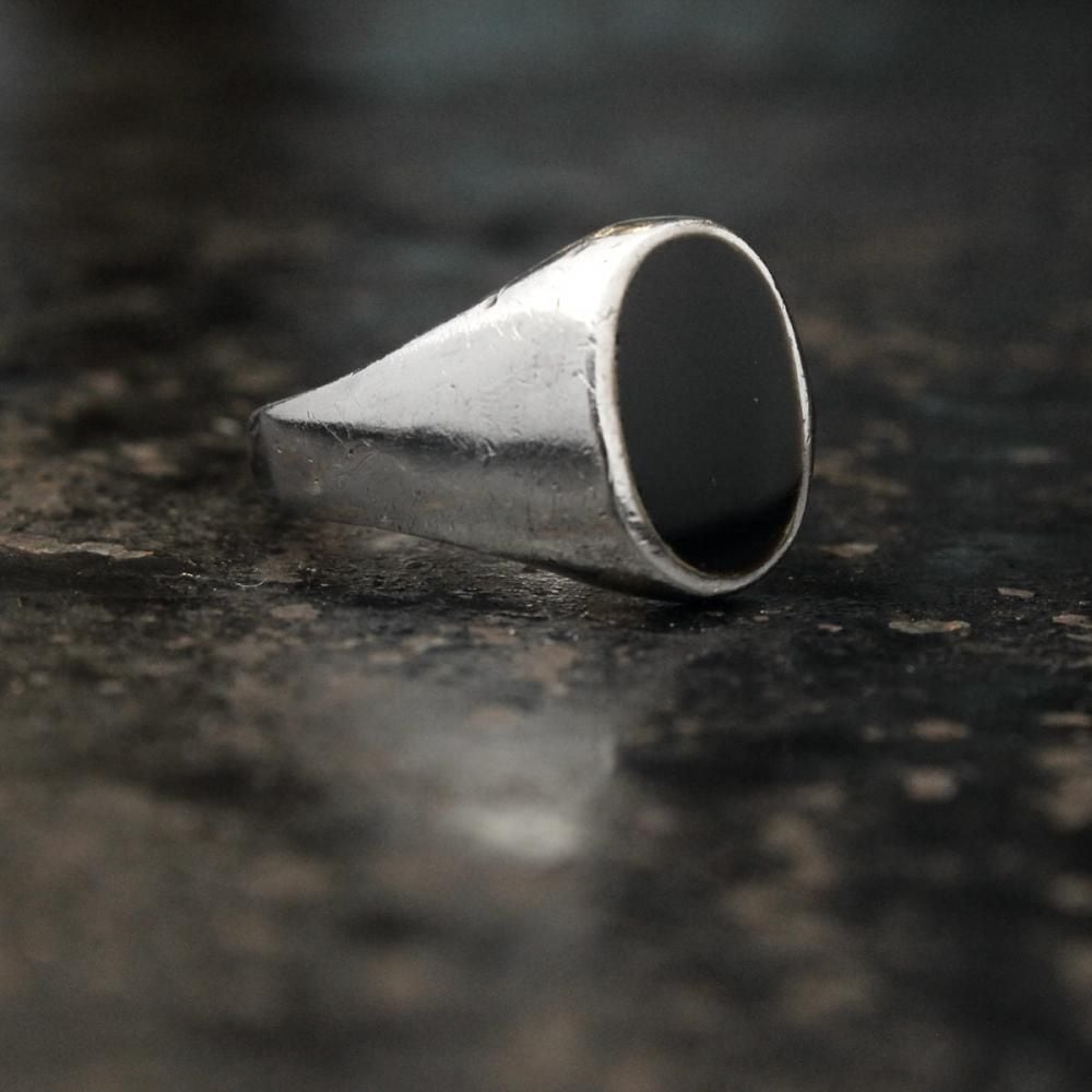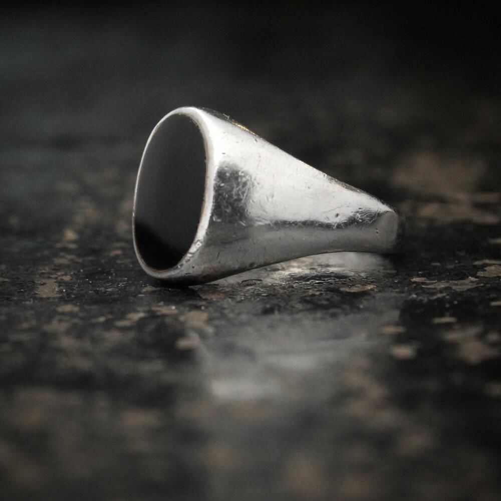 This signet ring is made in the USA. It features a simple design with a softly curved gold body and an onyx top. This is a rare find with a solid design. Its medium size creates a striking and well-balanced silhouette. It is stamped 925. Please review the photos to confirm the condition and be aware of the unique characteristics of vintage jewelry before purchasing.
