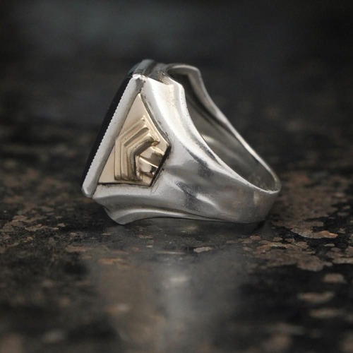 This signet ring is made in the United States, dating from the 1930s to 1940s. Its minimalist design, featuring a large onyx in a square shape reminiscent of the older era, exudes an Art Deco feel, while the hoop, likely gold-plated on the sides, adds a touch of elegance. The silhouette is well-balanced, not too large, yet still striking. It is stamped STERLING and was made by Ostby Barton, an American jeweler founded in the late 19th century. After the founders death aboard the Titanic, the brand continued to produce jewelry until the 1950s, making it a popular manufacturer of high-quality vintage jewelry. Please check the photos for the condition and be aware of the unique characteristics of vintage jewelry before purchasing.