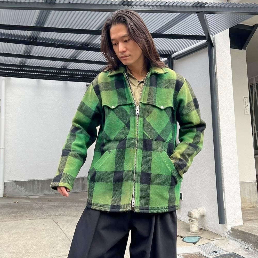 This 70s cruiser jacket features a buffalo check pattern that has faded to an olive hue in parts, creating a truly vintage outdoor look. While there is no size tag, it fits between L and XL. Its lighter and more comfortable than it looks.