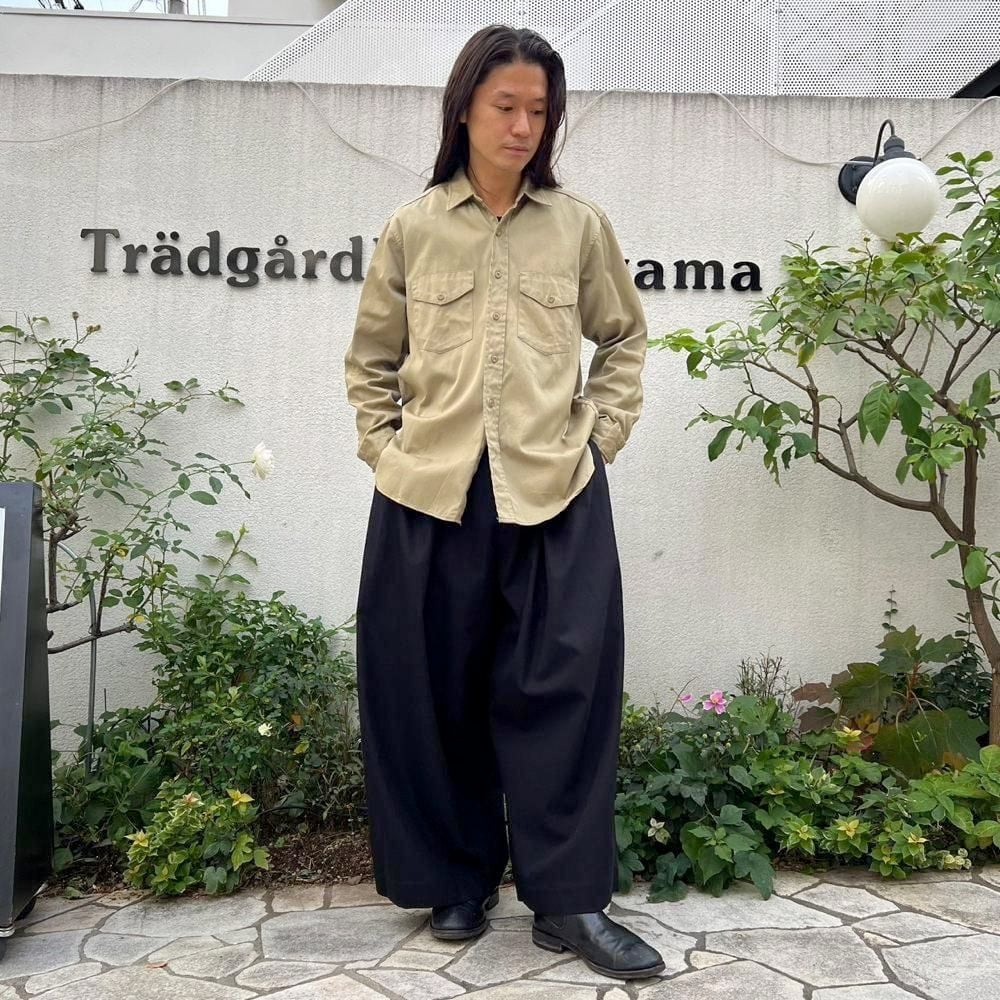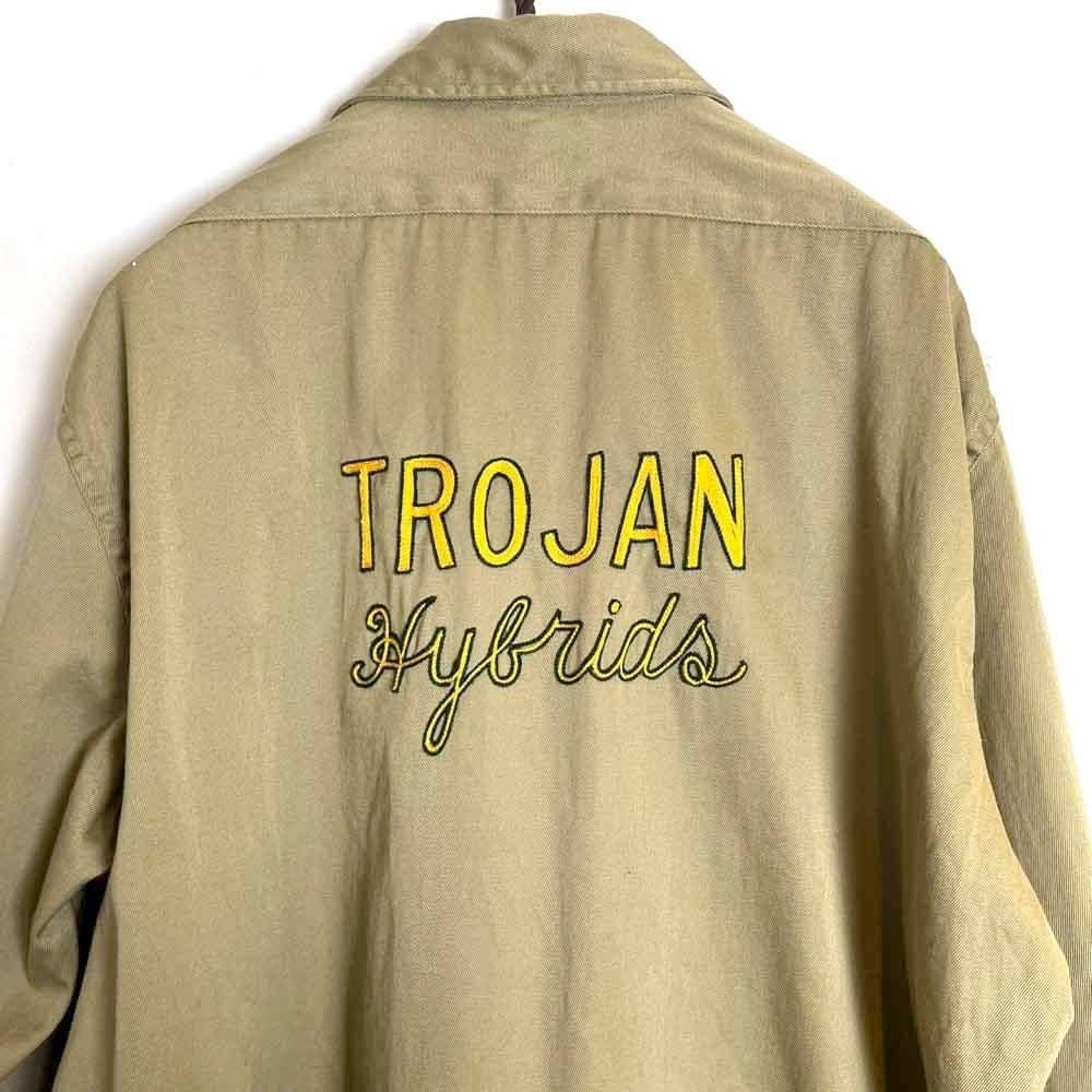 This 1960s Big Smith work shirt is crafted from US Army cotton twill. Its military khaki color and chainstitch embroidered lettering on the back create a stylish look. Its sized 16.5, and fits comfortably in a comfortable L-XL size.