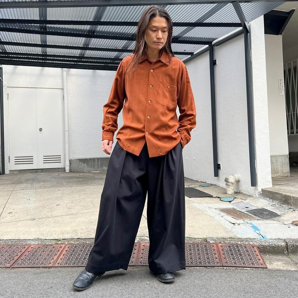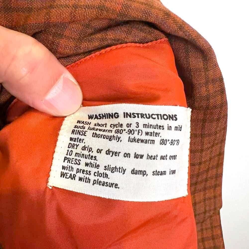 The tag is missing, but this is a Sir Pendleton 1960s loop collar wool shirt from Pendletons premium line. Its thinner and smoother than regular Pendleton wool, making it suitable for a wide range of seasons. The terracotta brown check pattern creates a stylish look. The fit is excellent, maintaining a relaxed silhouette without shrinking.