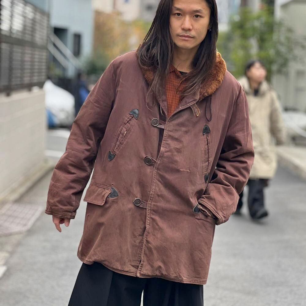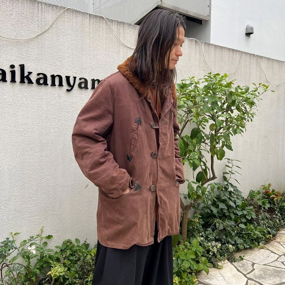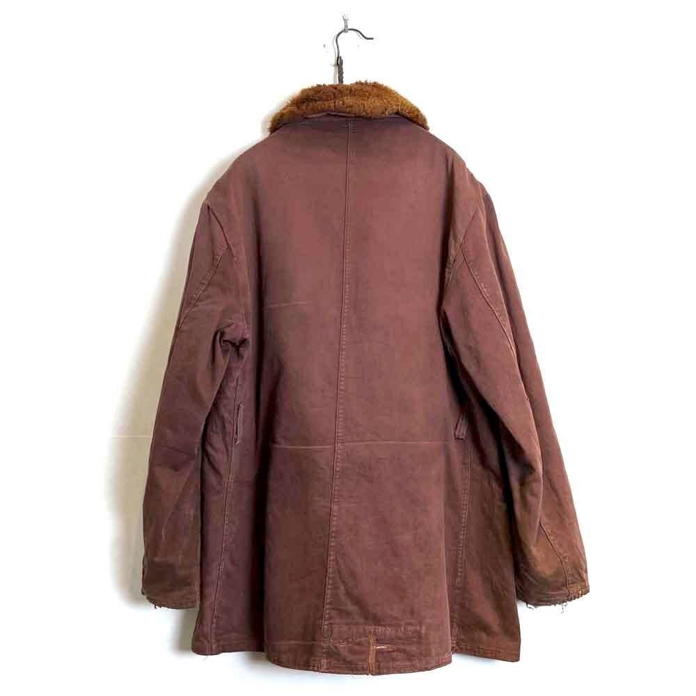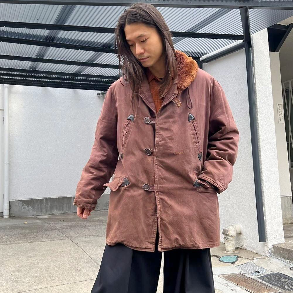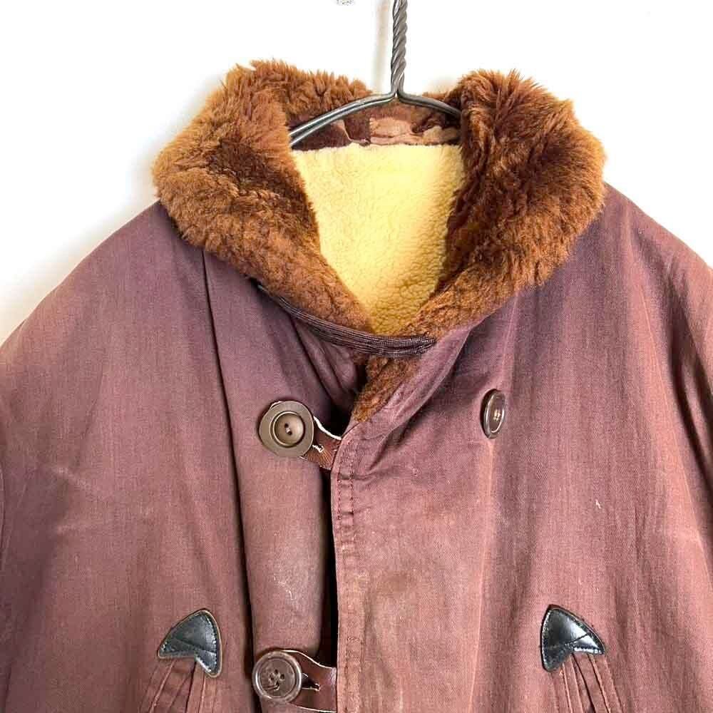 This 1950s Sears Mackinaw coat has faded to a russet brown over time, creating a sophisticated, understated look. The boa collar and lining are made of 100% real sheepskin, providing excellent protection against the cold. Its lighter than it looks, making it comfortable to wear. Its rare to find such a lightweight, warm coat from the 1950s. It has a comfortable, relaxed fit and a beautiful silhouette with naturally dropped shoulders.