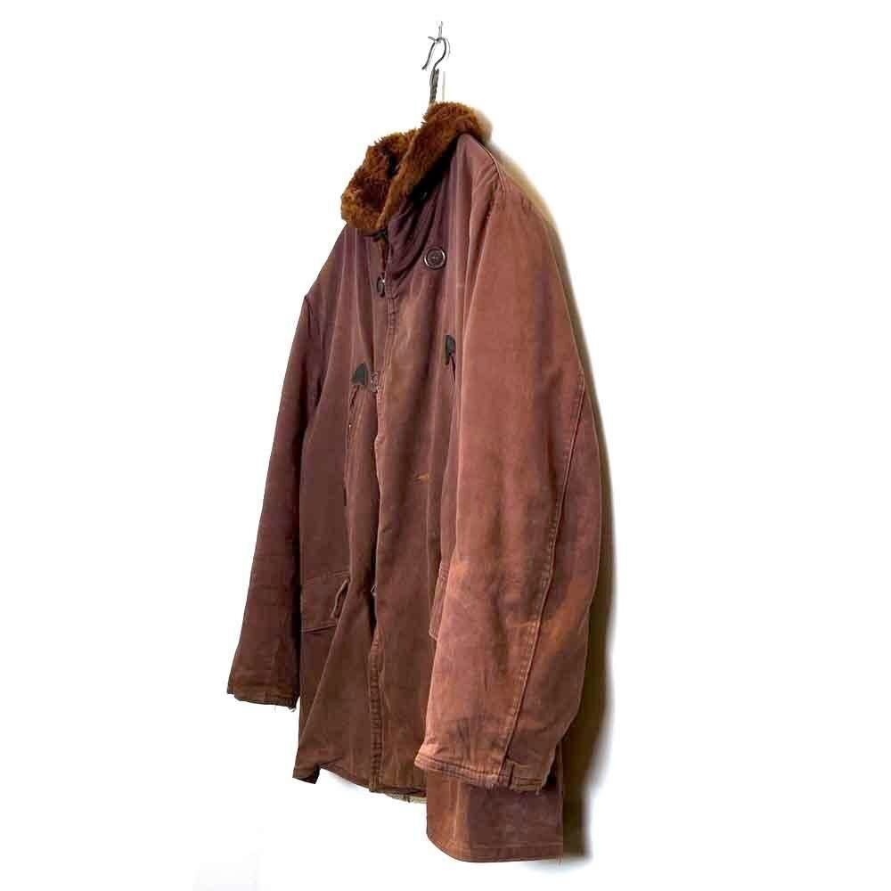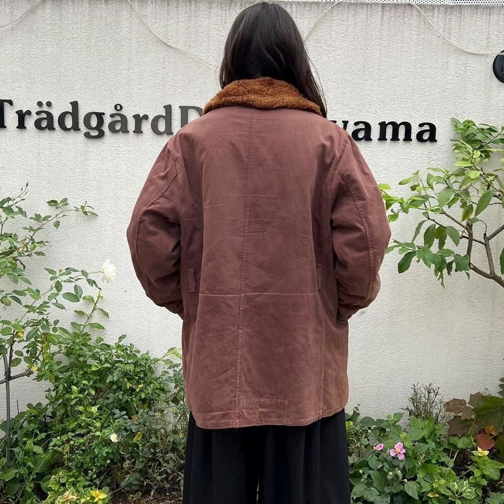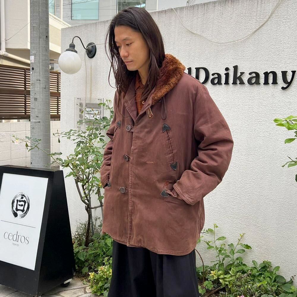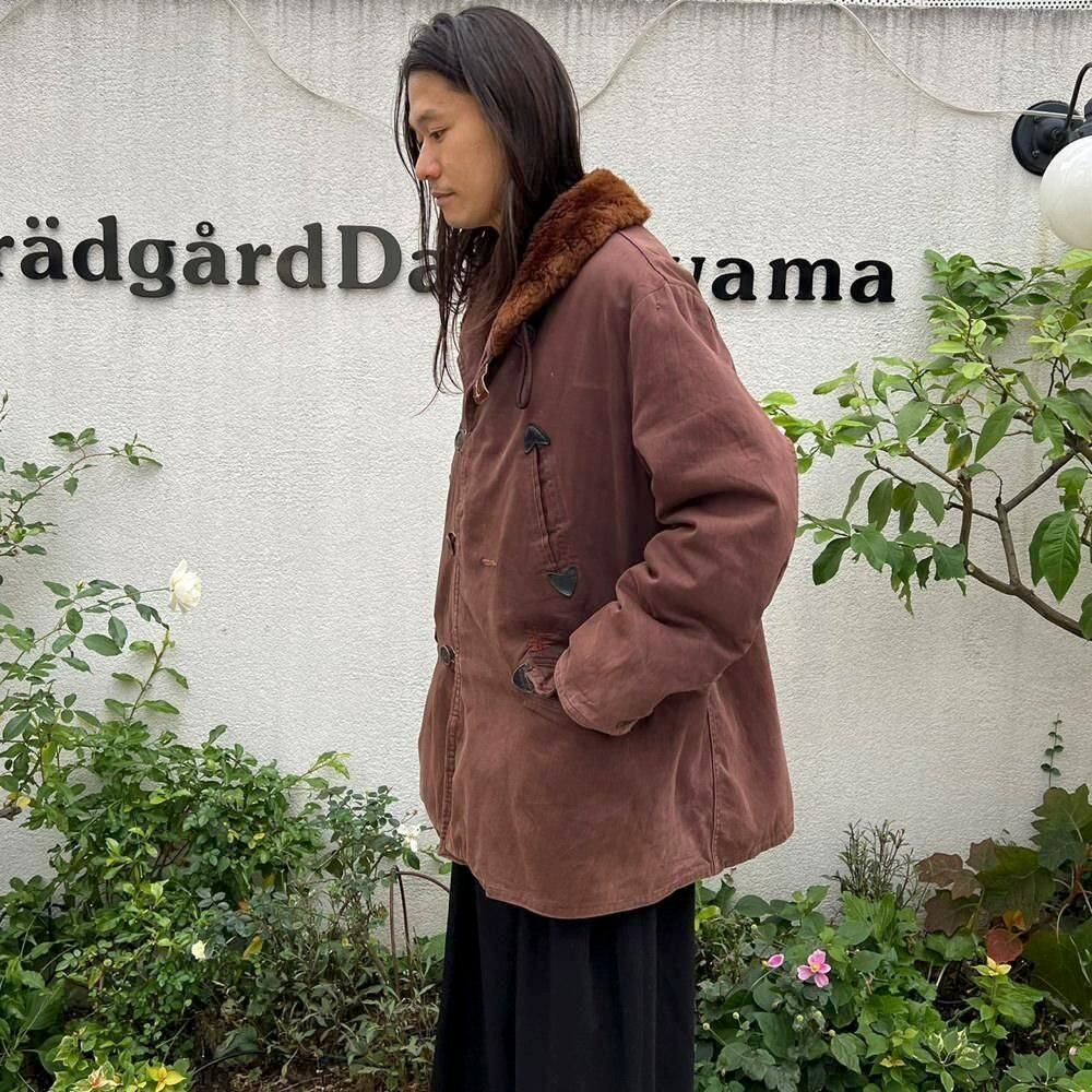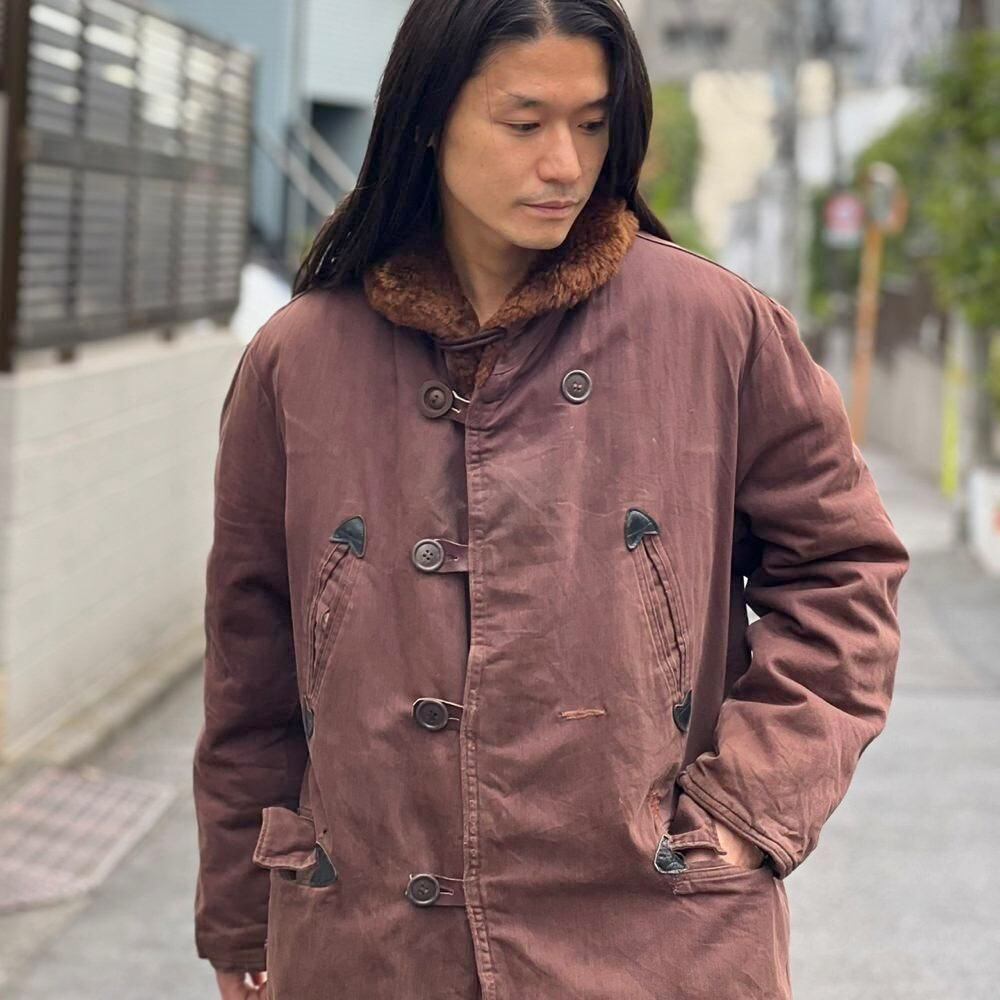 This 1950s Sears Mackinaw coat has faded to a russet brown over time, creating a sophisticated, understated look. The boa collar and lining are made of 100% real sheepskin, providing excellent protection against the cold. Its lighter than it looks, making it comfortable to wear. Its rare to find such a lightweight, warm coat from the 1950s. It has a comfortable, relaxed fit and a beautiful silhouette with naturally dropped shoulders.