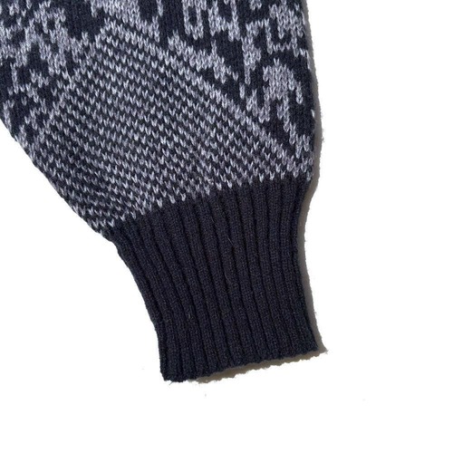 A playful design reminiscent of the 80s, with various ethnic patterns and leather patchwork created through interwoven knitting.