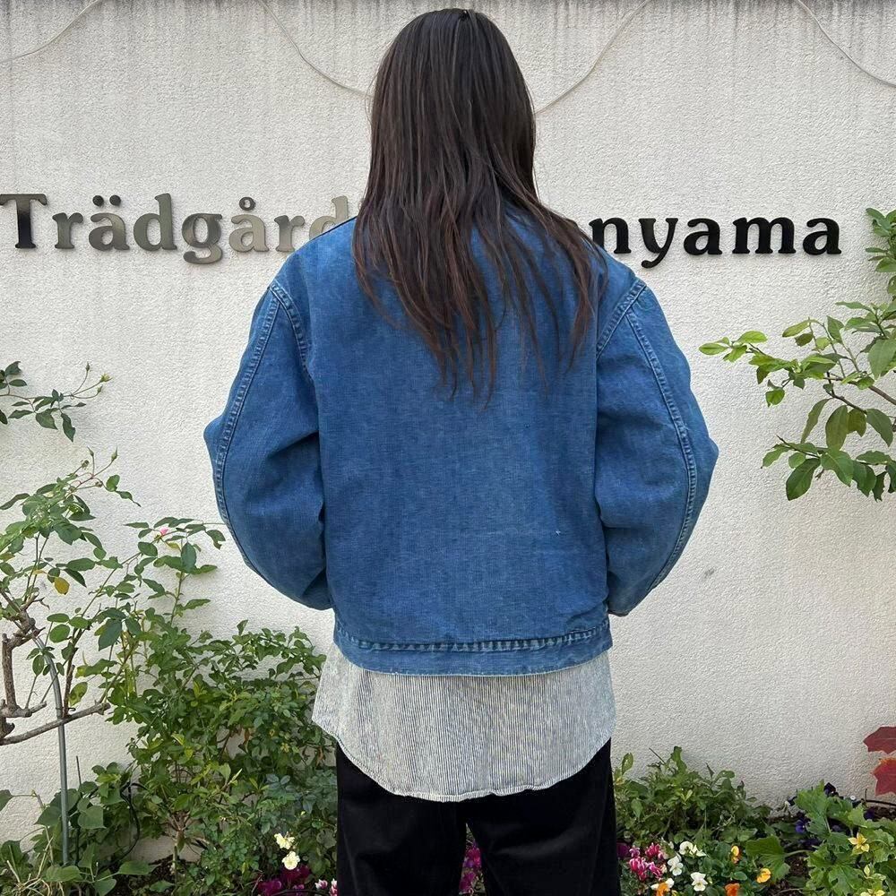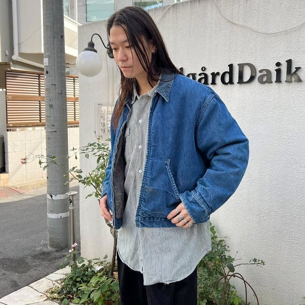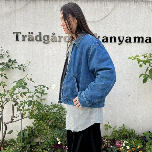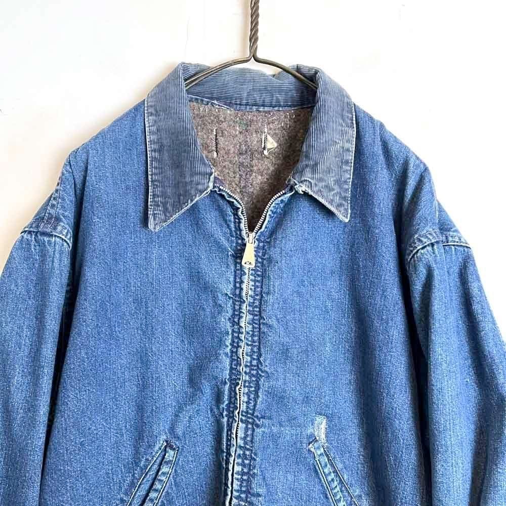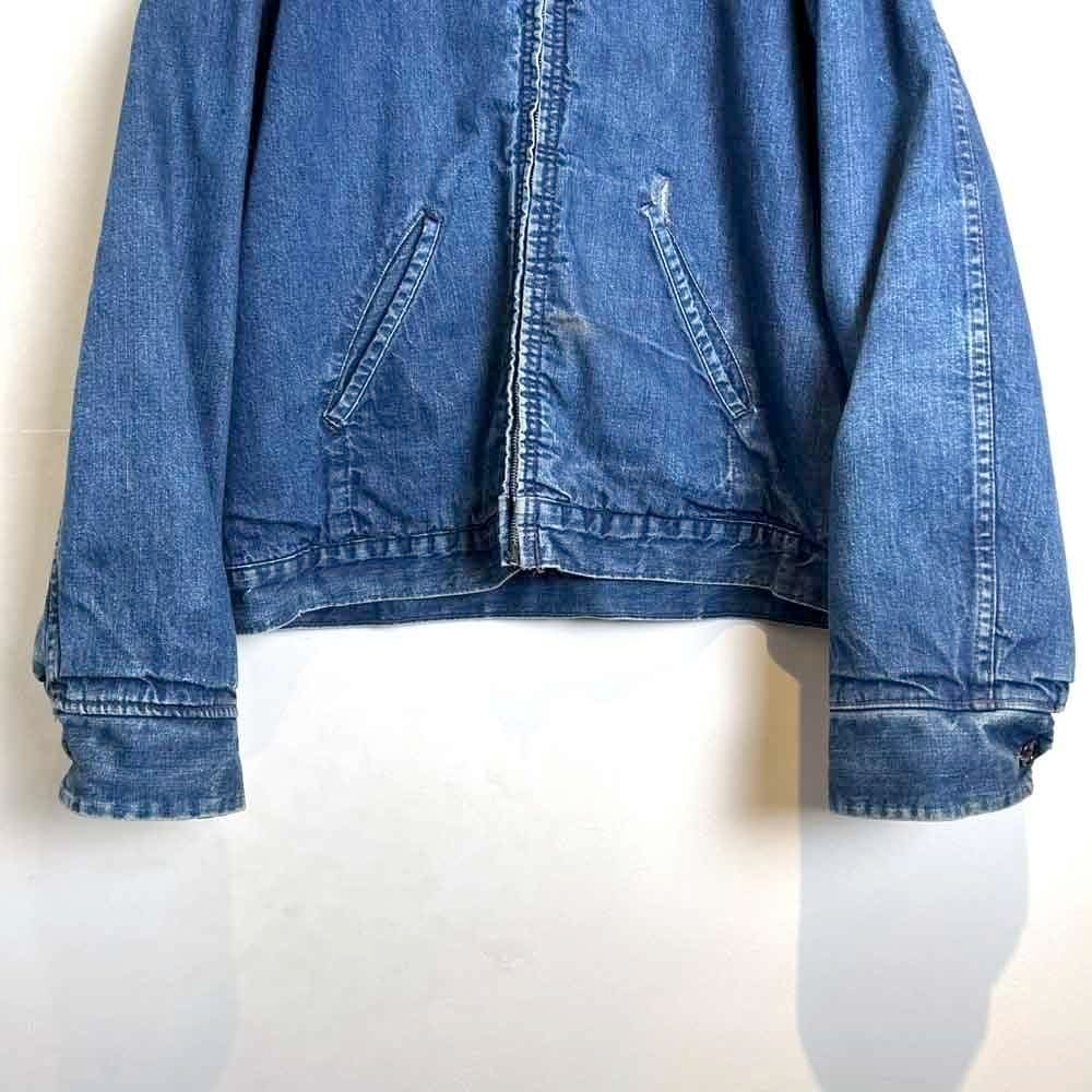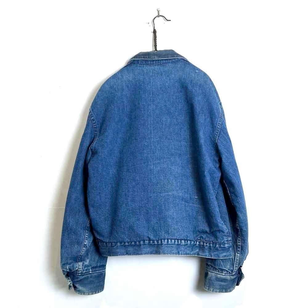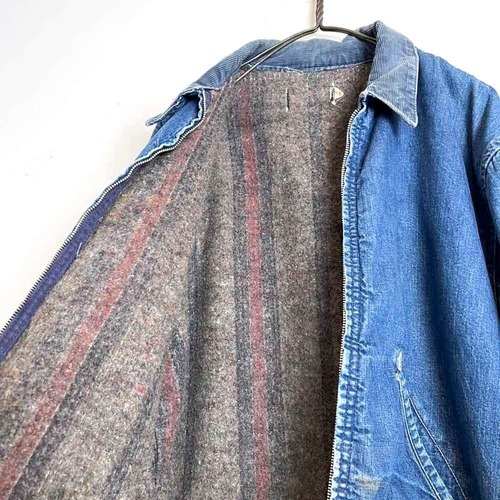 This 1960s blanket-lined denim jacket is indigo blue with a good color fading and a blanket lining in good condition. Its a versatile drapery jacket. I cant confirm the size, but it fits comfortably in a size 46.