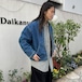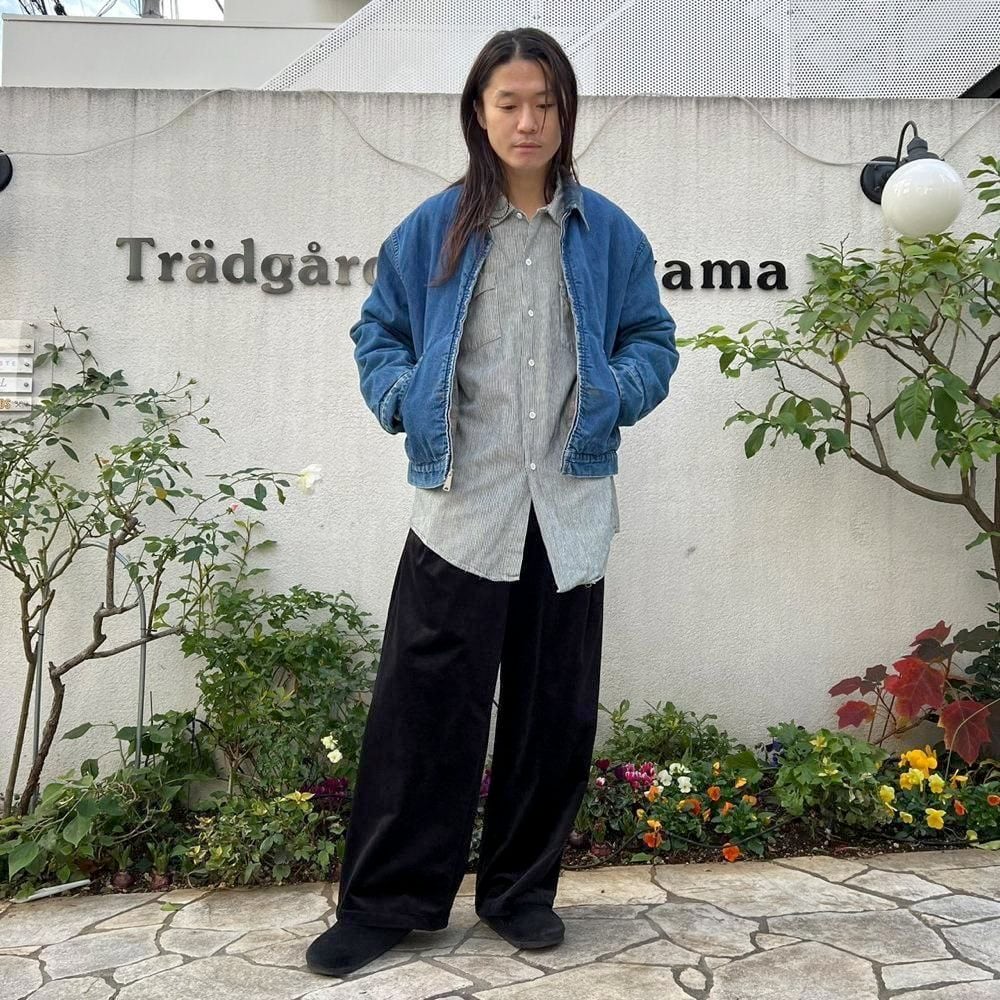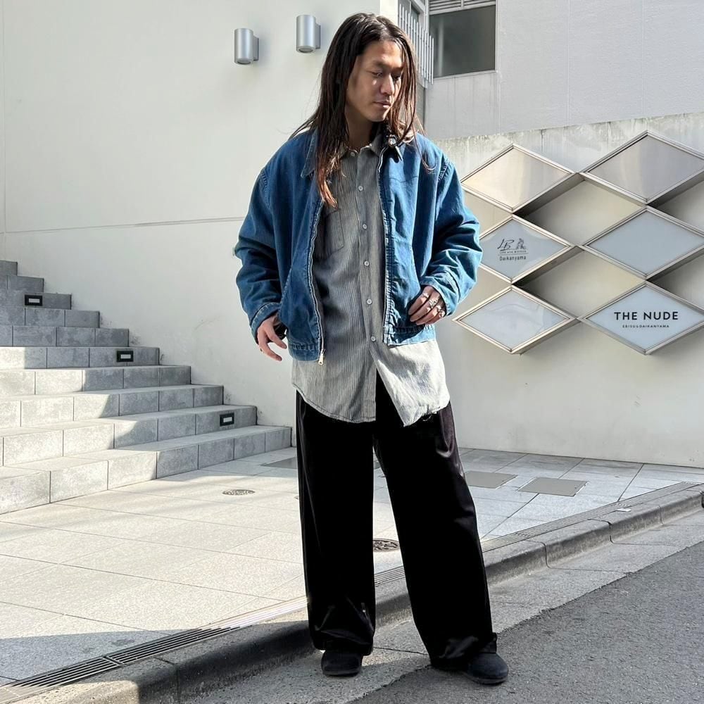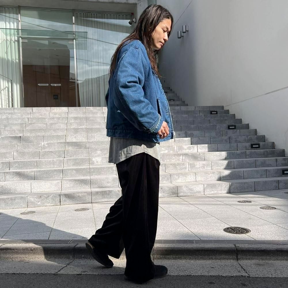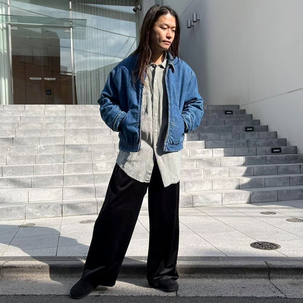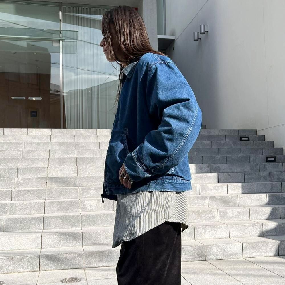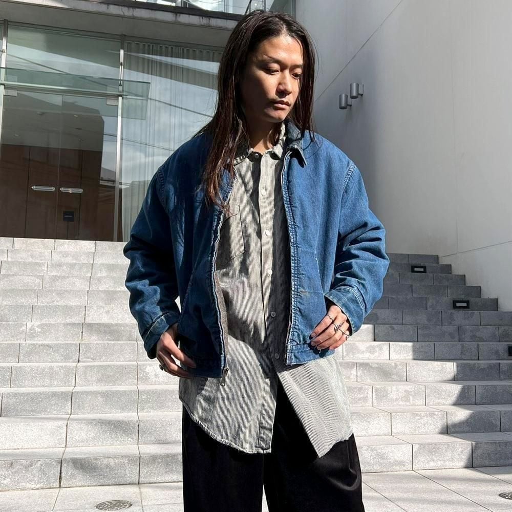 This 1960s blanket-lined denim jacket is indigo blue with a good color fading and a blanket lining in good condition. Its a versatile drapery jacket. I cant confirm the size, but it fits comfortably in a size 46.