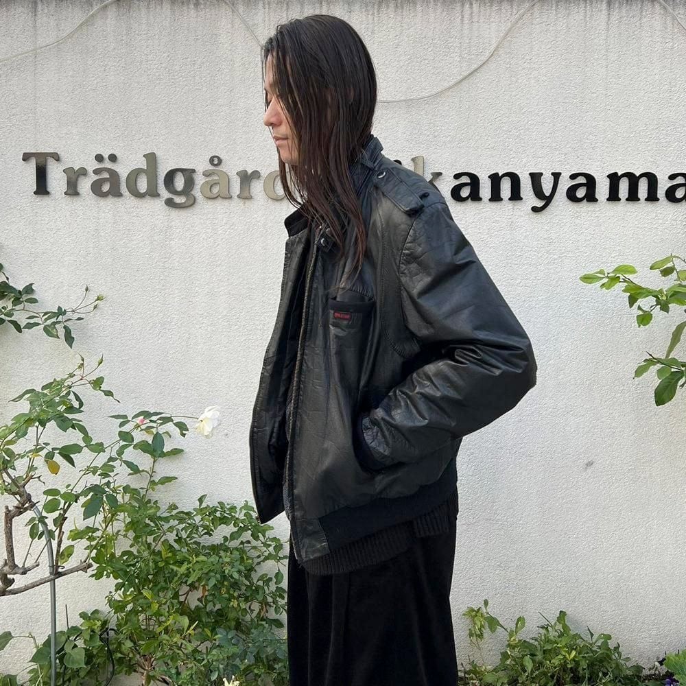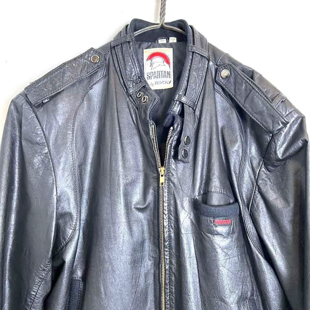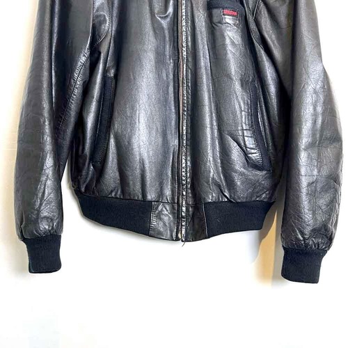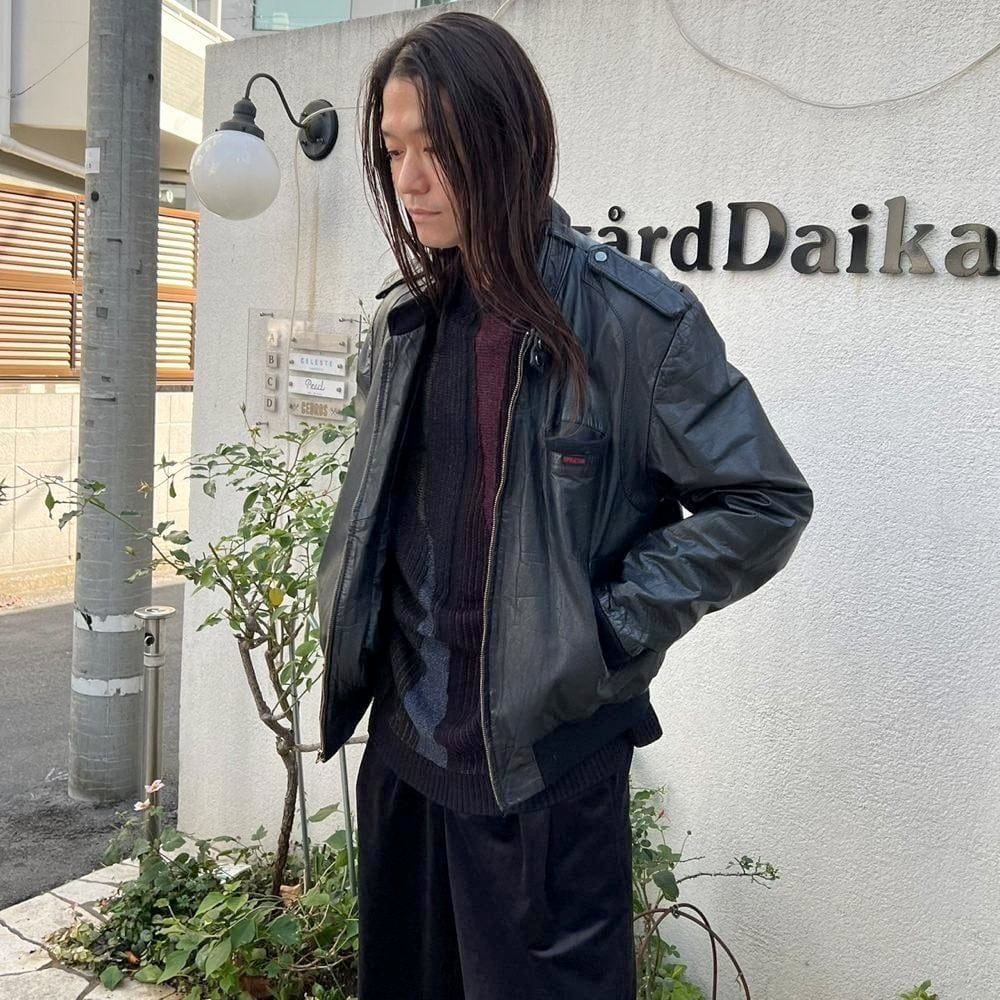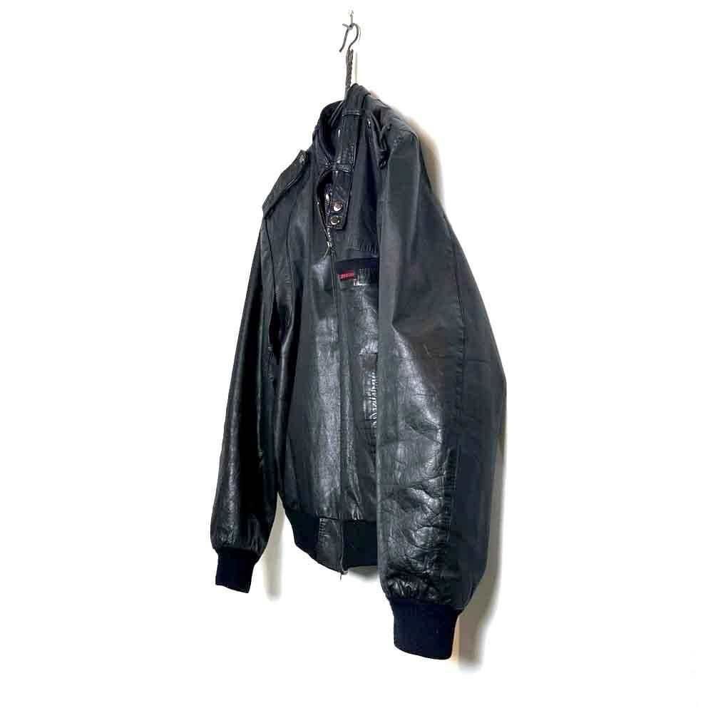 This 80s leather jacket is a racing jacket-style jacket reminiscent of Members Only. The epaulettes and belted collar create a cool look. The size is 48, and it fits comfortably with a comfortable fit.