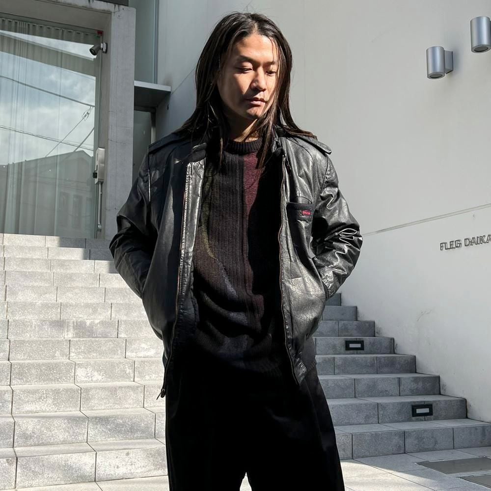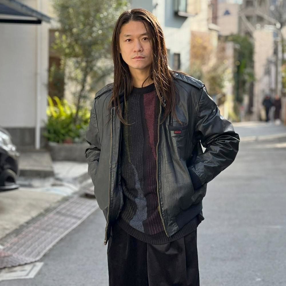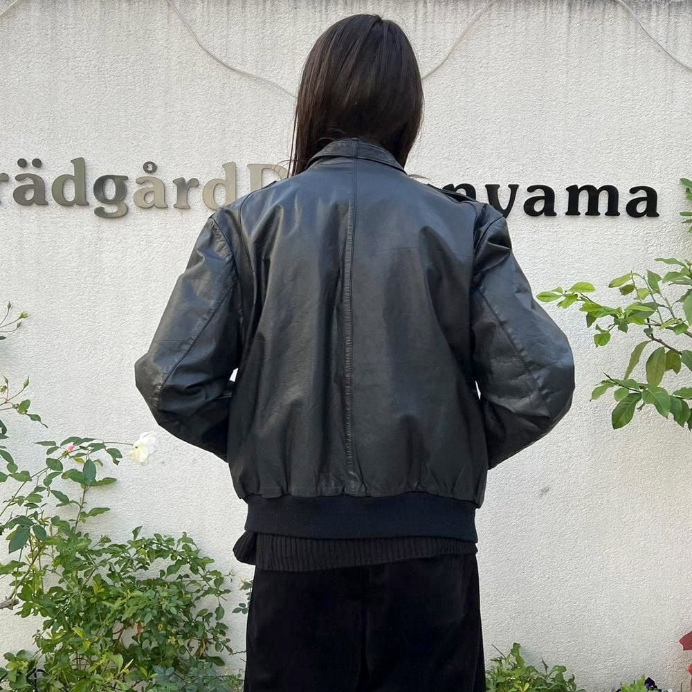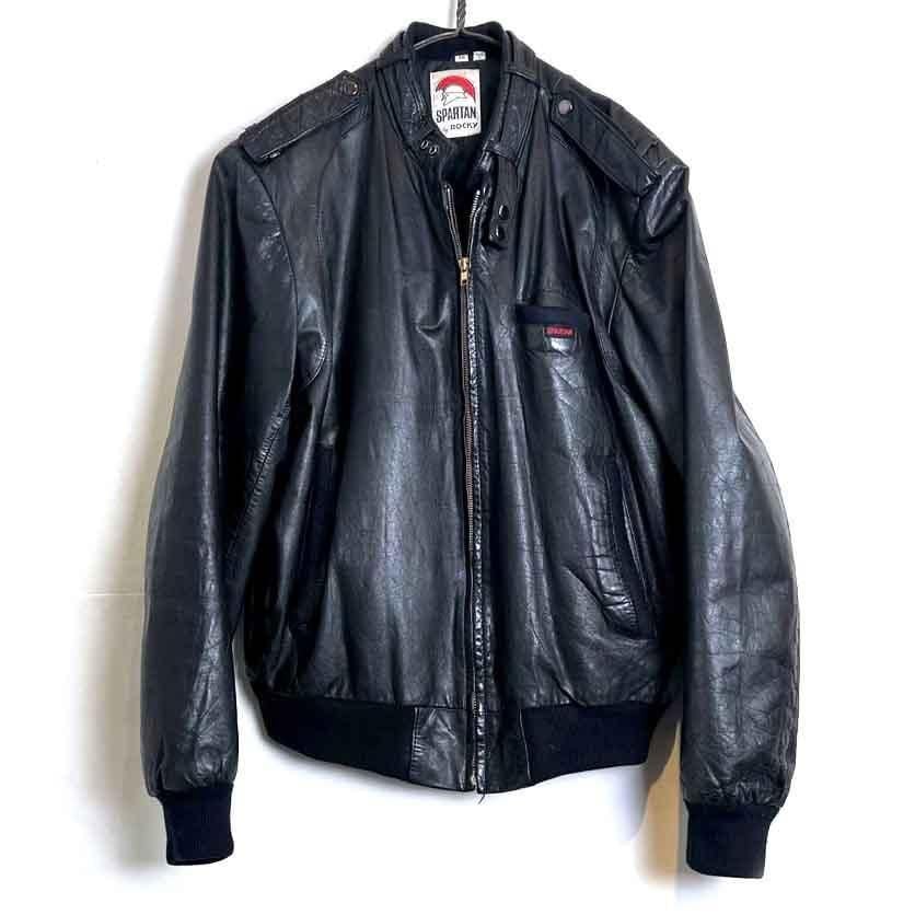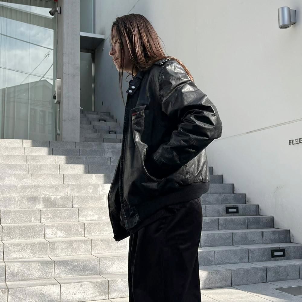 This 80s leather jacket is a racing jacket-style jacket reminiscent of Members Only. The epaulettes and belted collar create a cool look. The size is 48, and it fits comfortably with a comfortable fit.