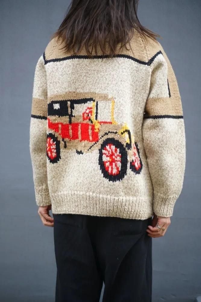The front features a simple two-tone design with a strong contrast, while the back features a pop, cultural and eye-catching classic car pattern.