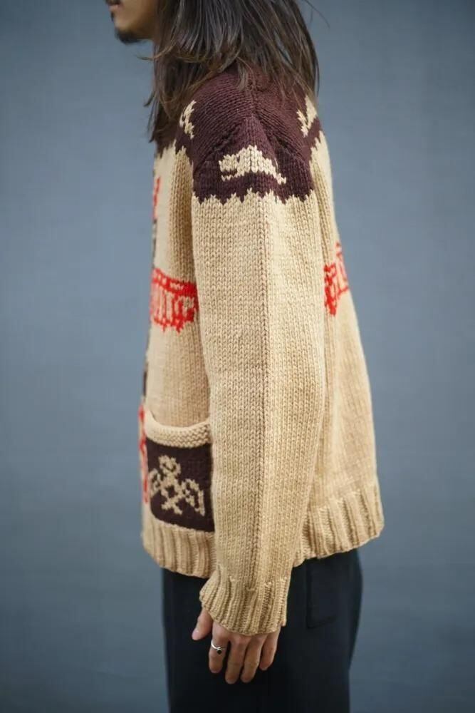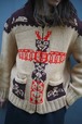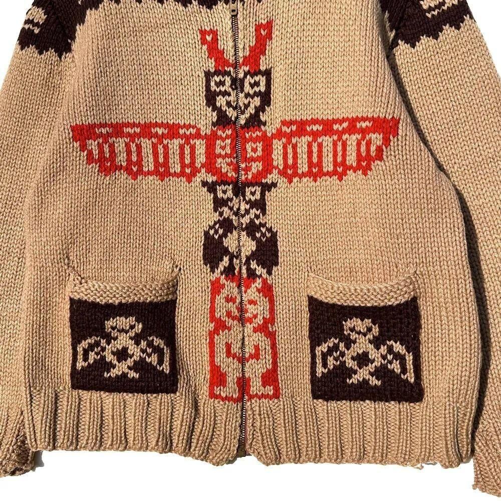 This is an impressive design featuring Native American tribal patterns knitted into it, including a totem pole on the front, a thunderbird on the pocket, and whale patterns on both shoulders.