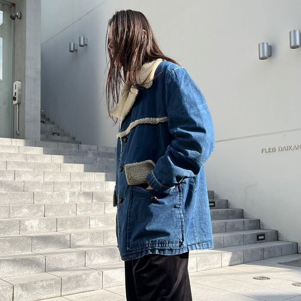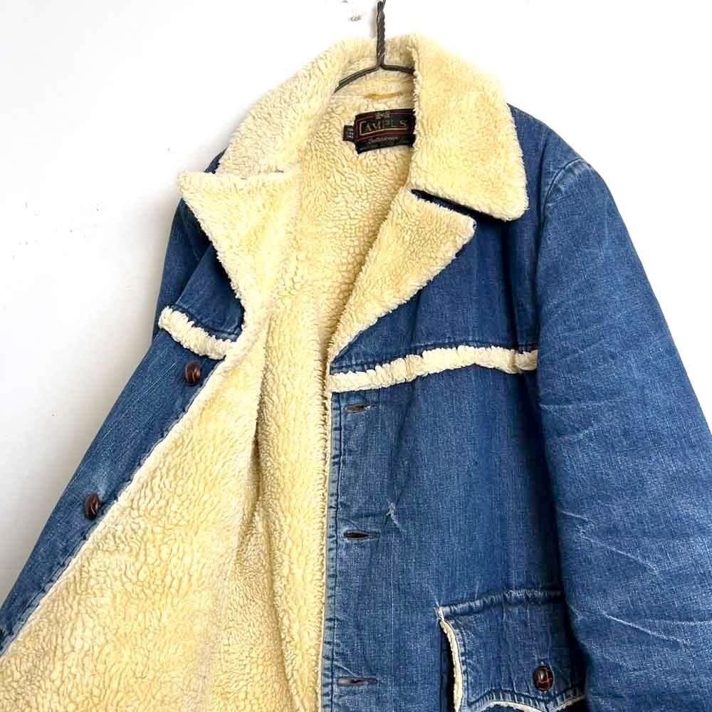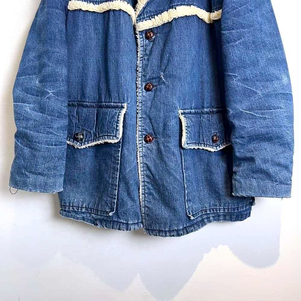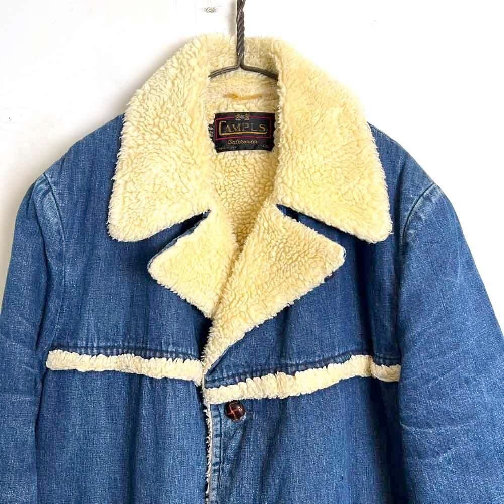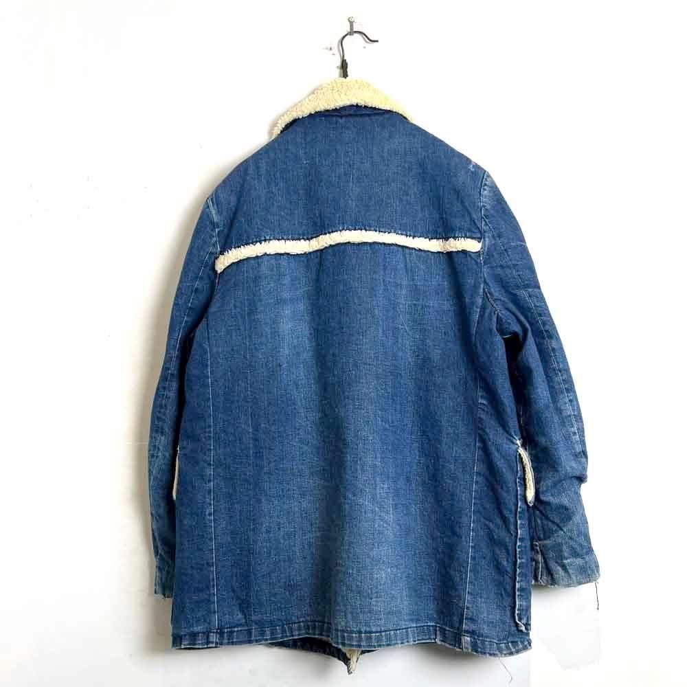 This 70s canvas boa-lined denim jacket is a lunch coat-style design. The beautifully faded blue denim and voluminous boa create a stylish look. Its a size 46 and fits comfortably with a comfortable fit.
