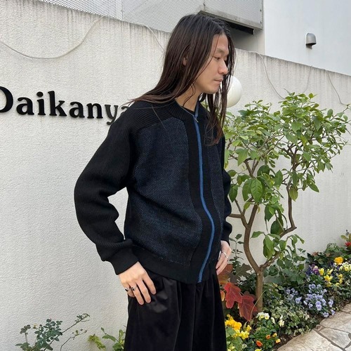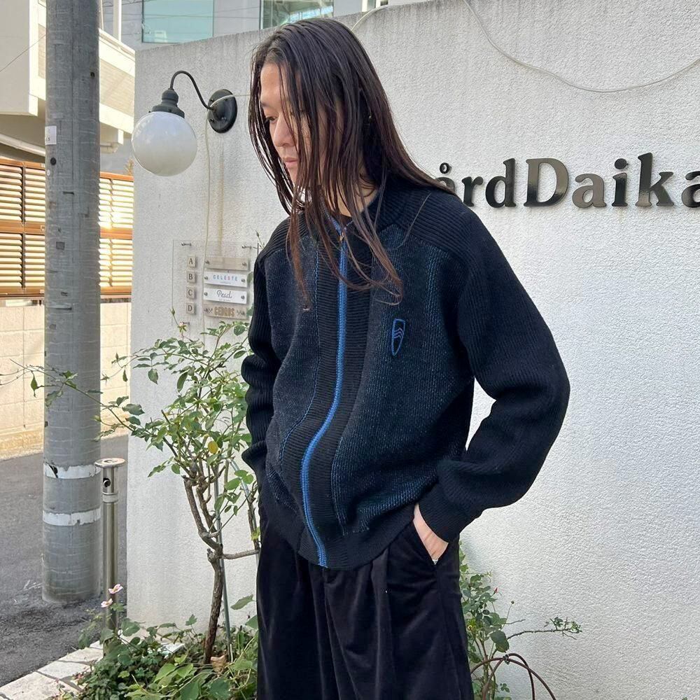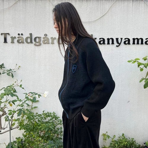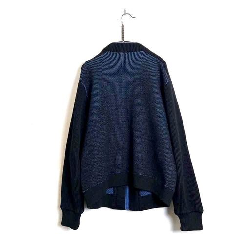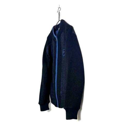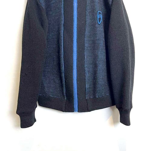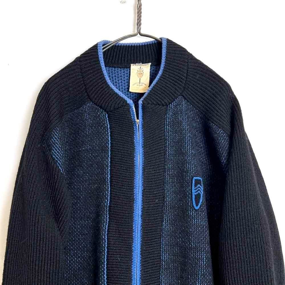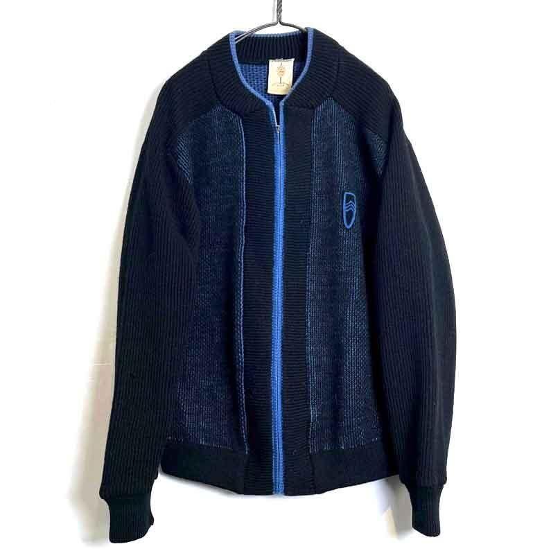 This zip-up cardigan is a classic example of the Seattle knitwear brand Penguin from the 1960s. Its sporty, full-zip design makes it easy to wear inside or outside, and the cool black and blue color scheme makes it a great piece.