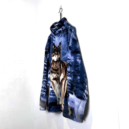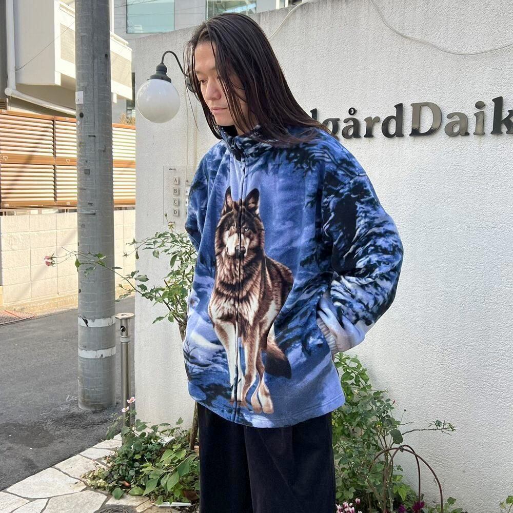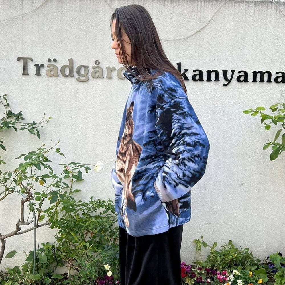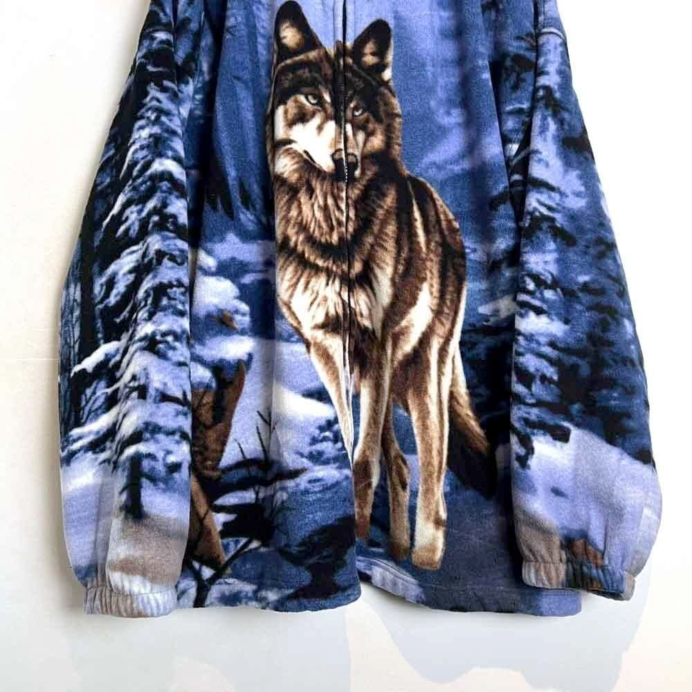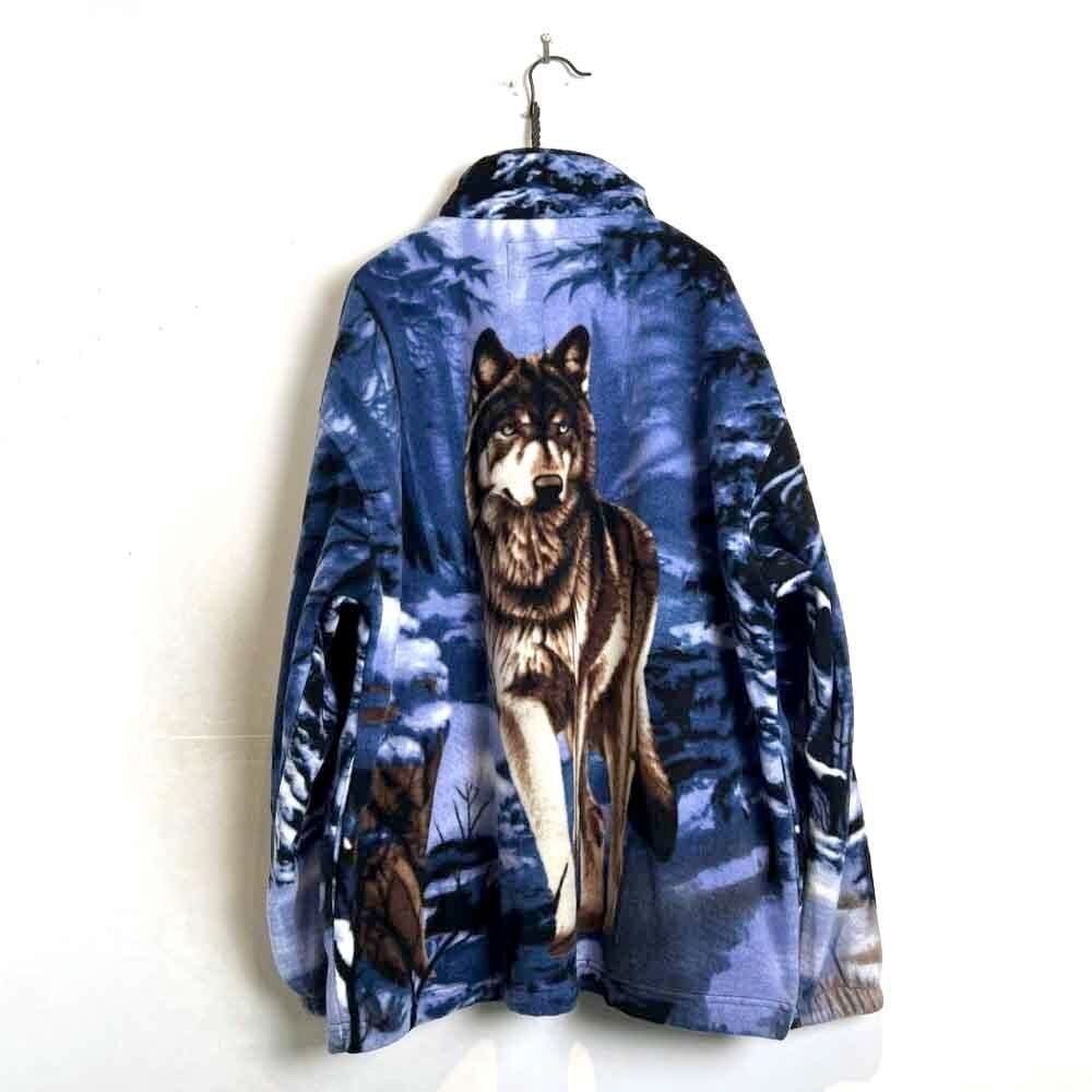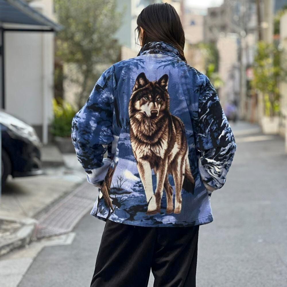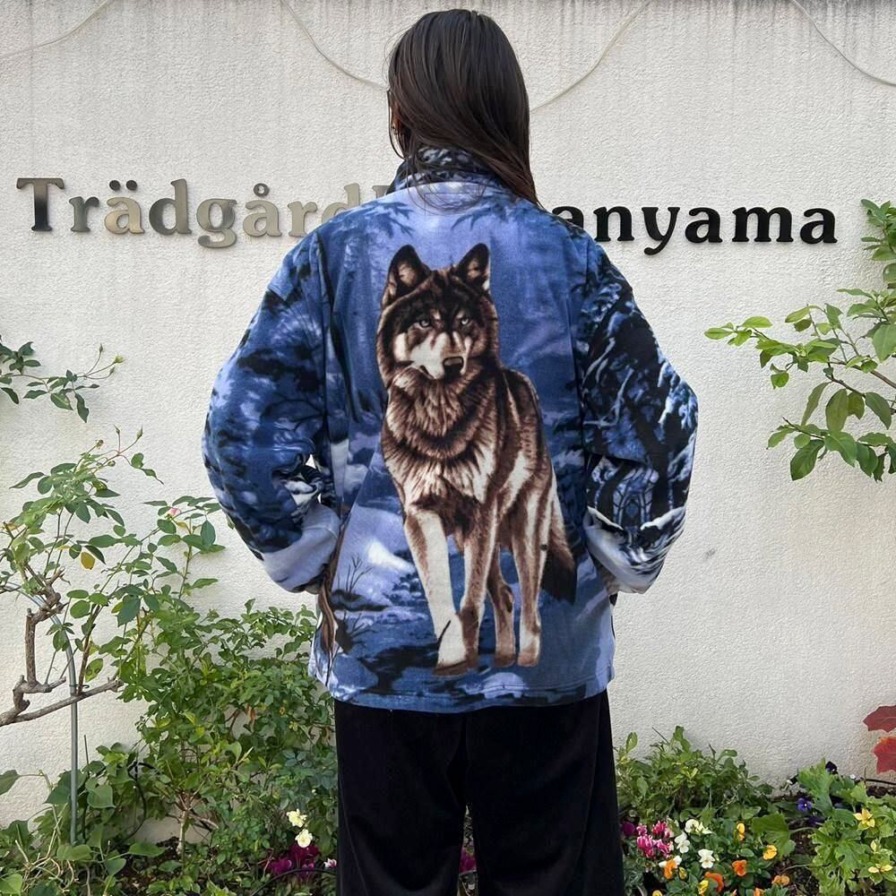 This 90s animal print fleece jacket features a large print of a wolf standing on a snowy mountain on the front and back. The blue-based color scheme gives it a cool impression. Its a comfortable piece with a comfortable fit and a light, fluffy fleece fabric.