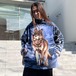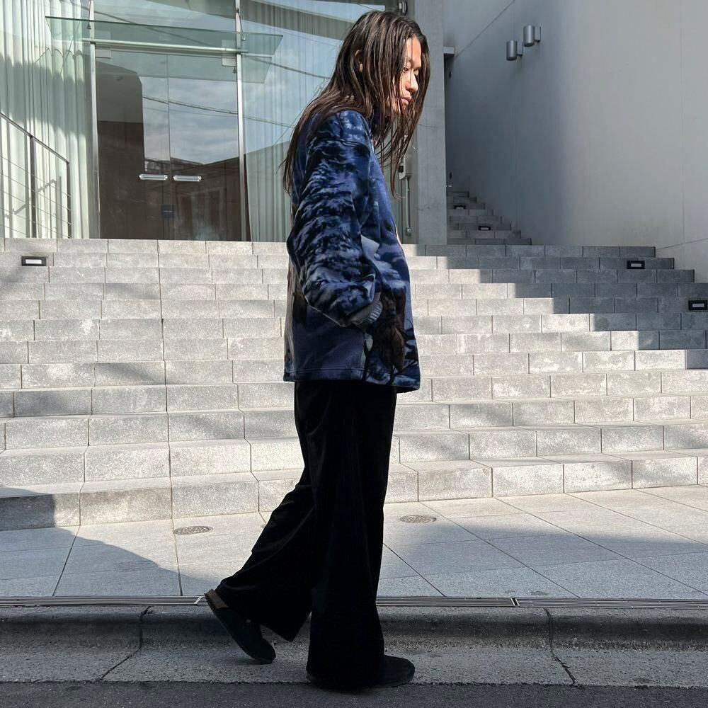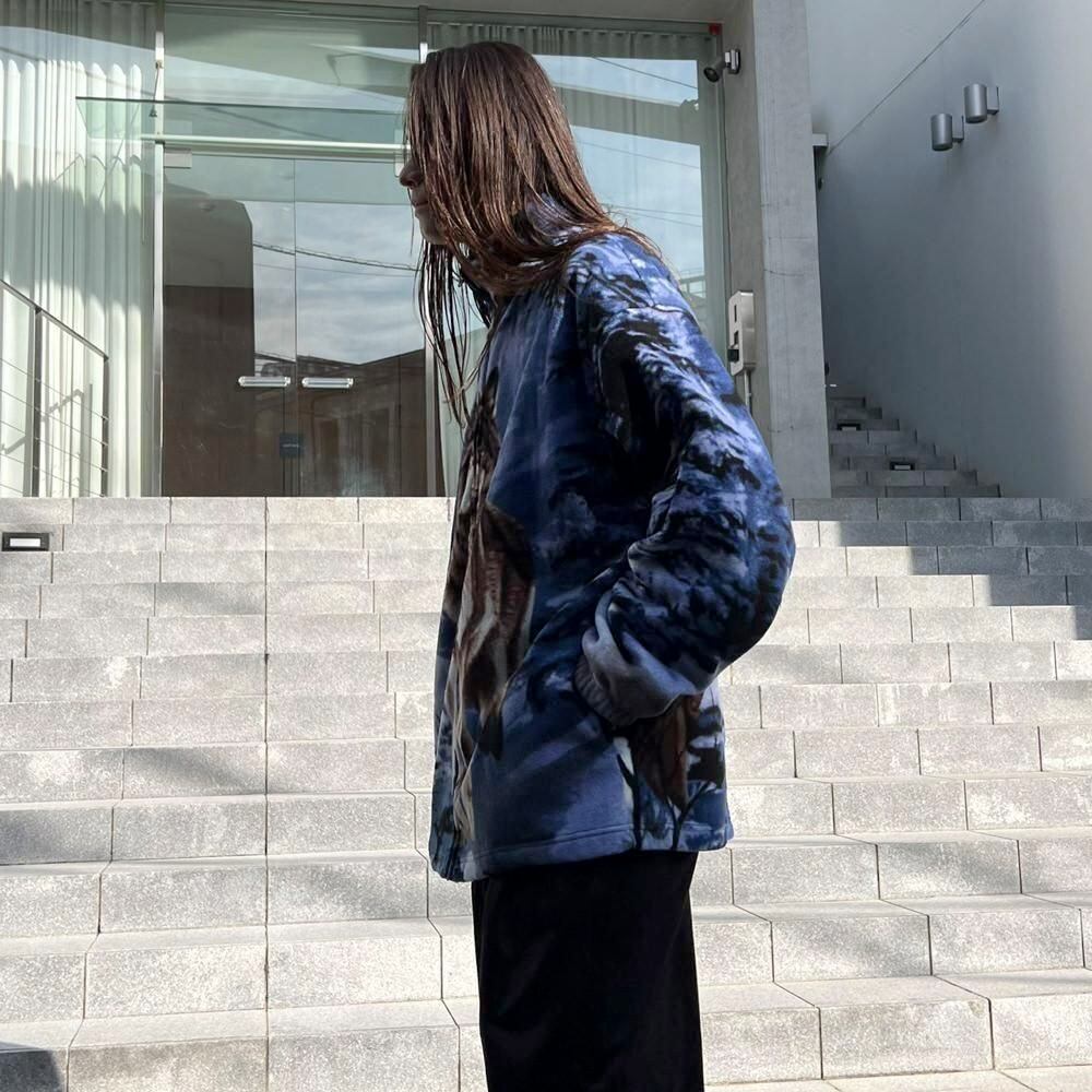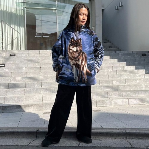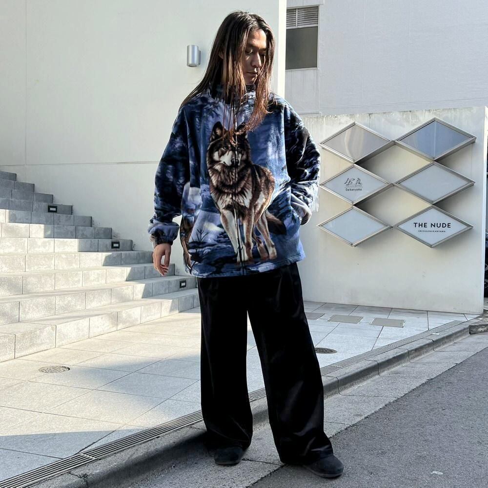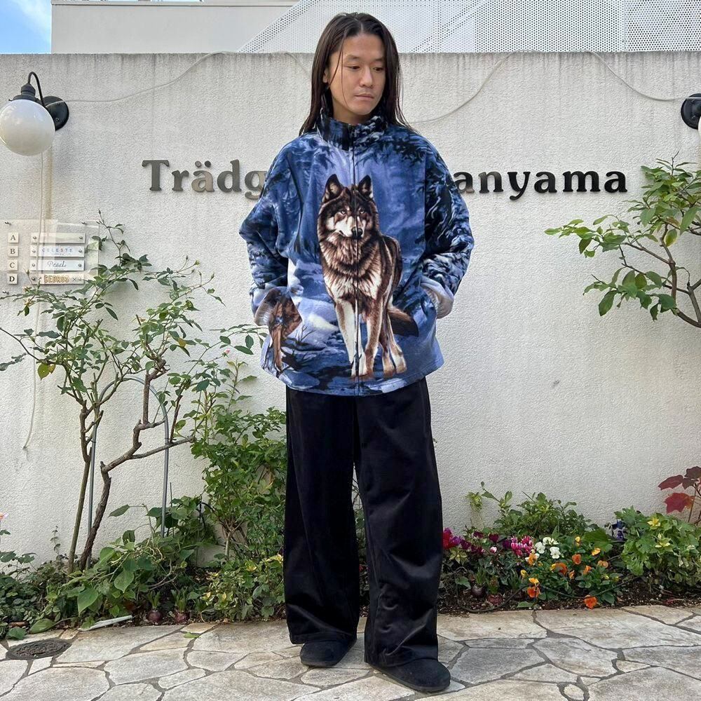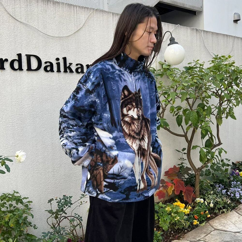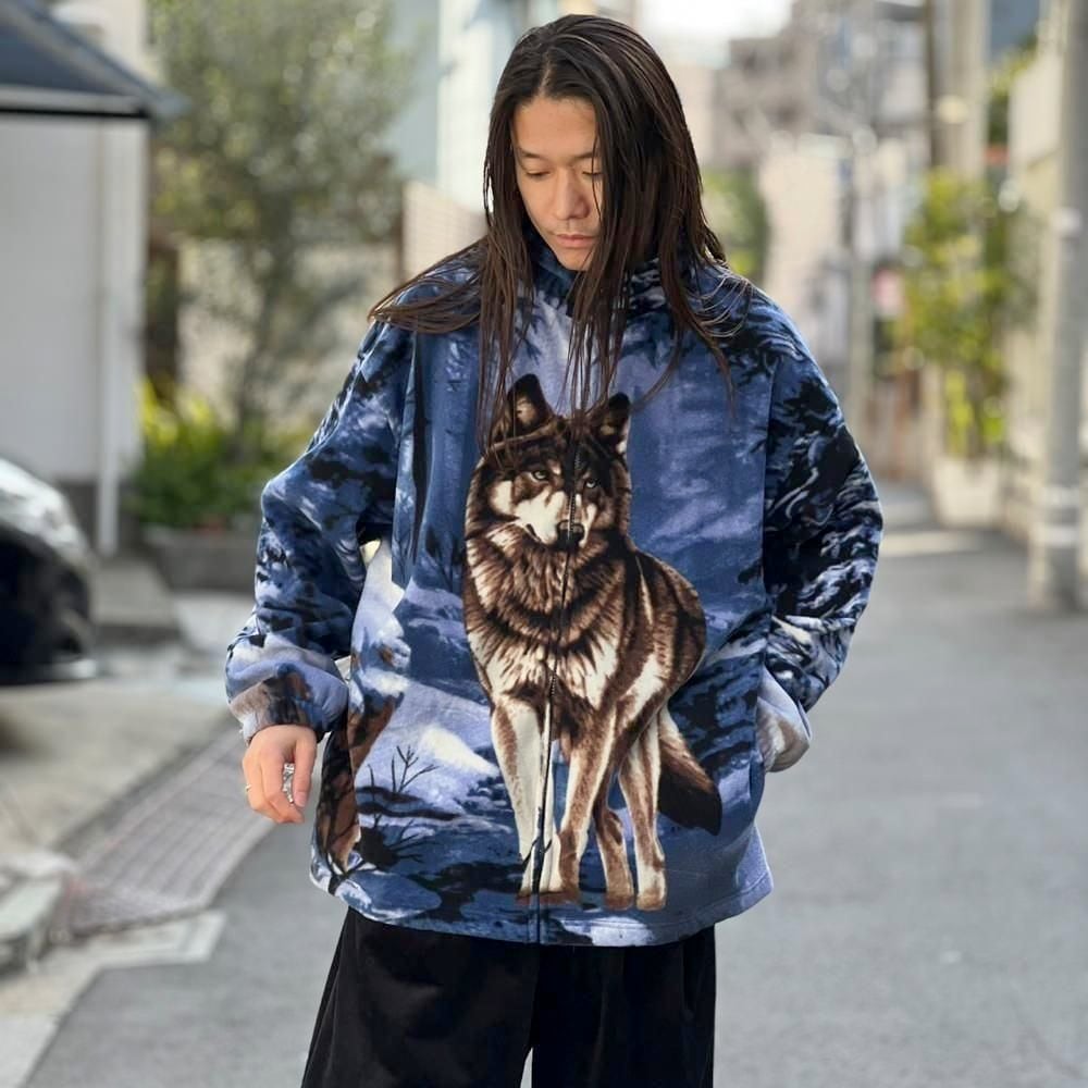 This 90s animal print fleece jacket features a large print of a wolf standing on a snowy mountain on the front and back. The blue-based color scheme gives it a cool impression. Its a comfortable piece with a comfortable fit and a light, fluffy fleece fabric.