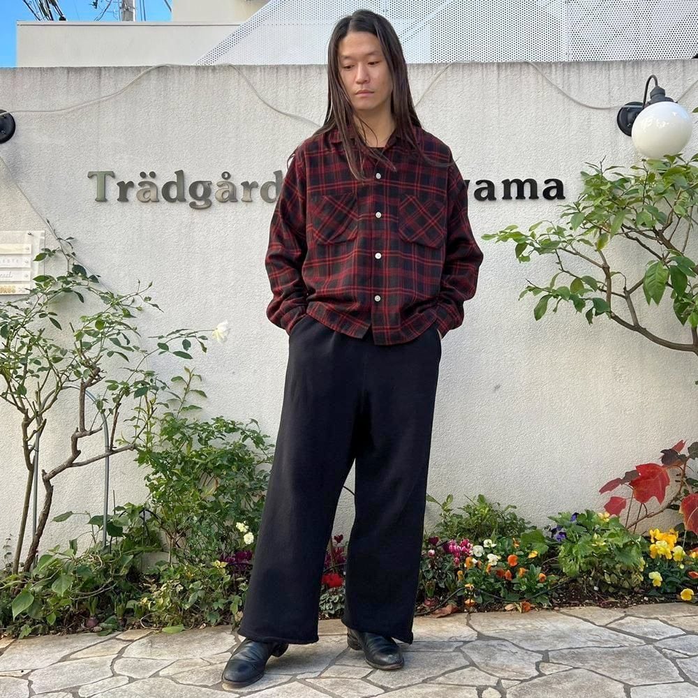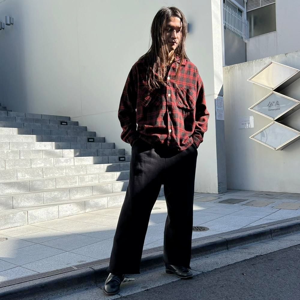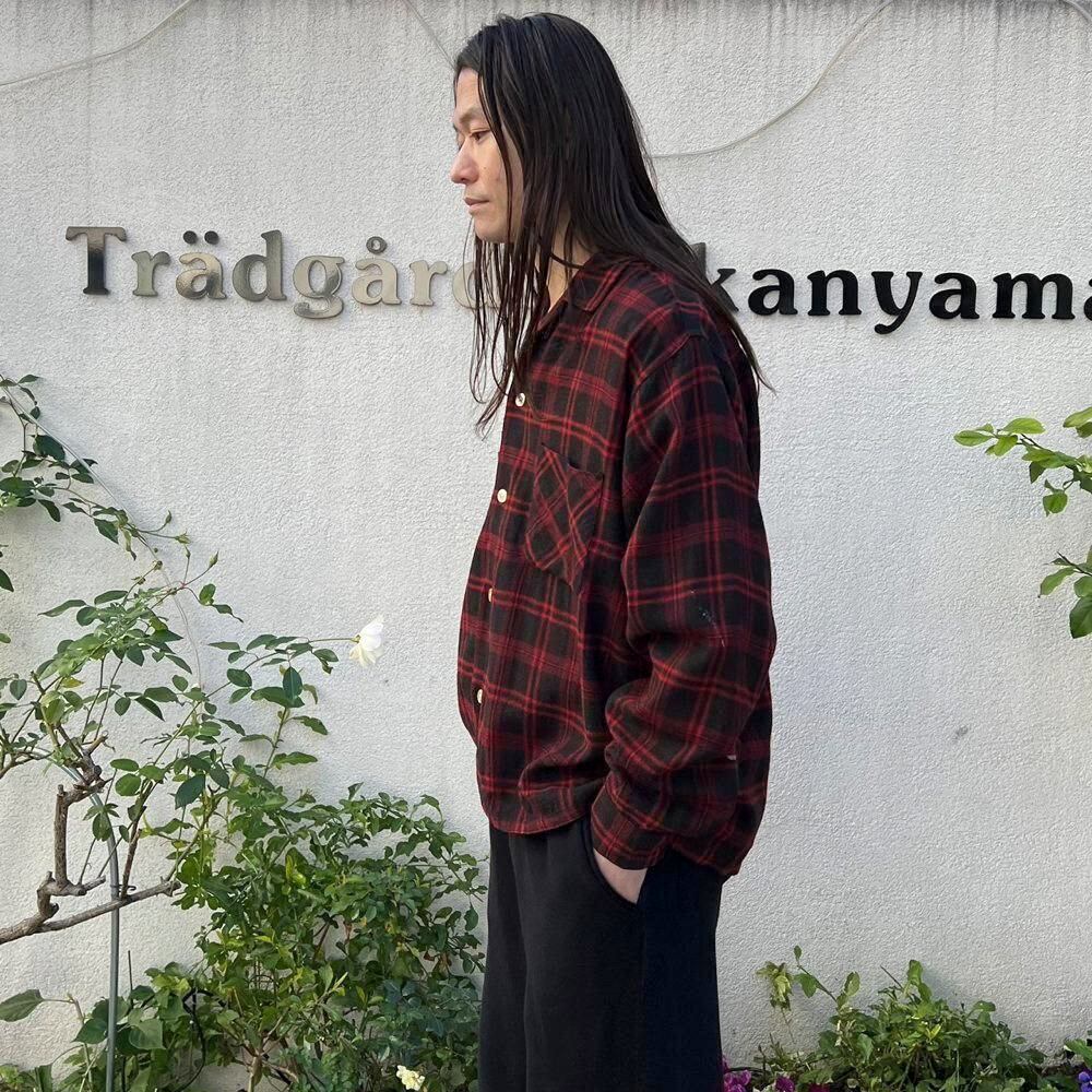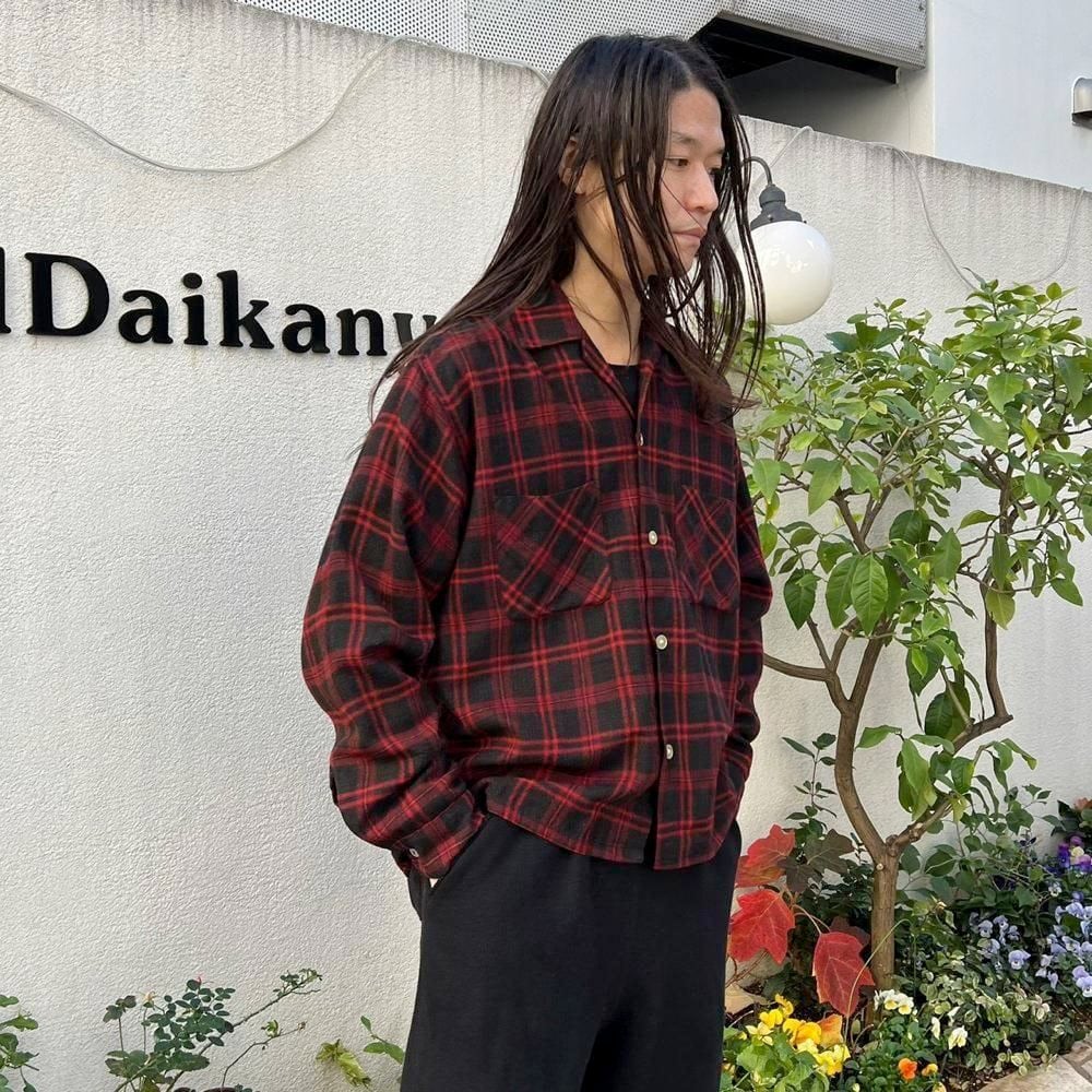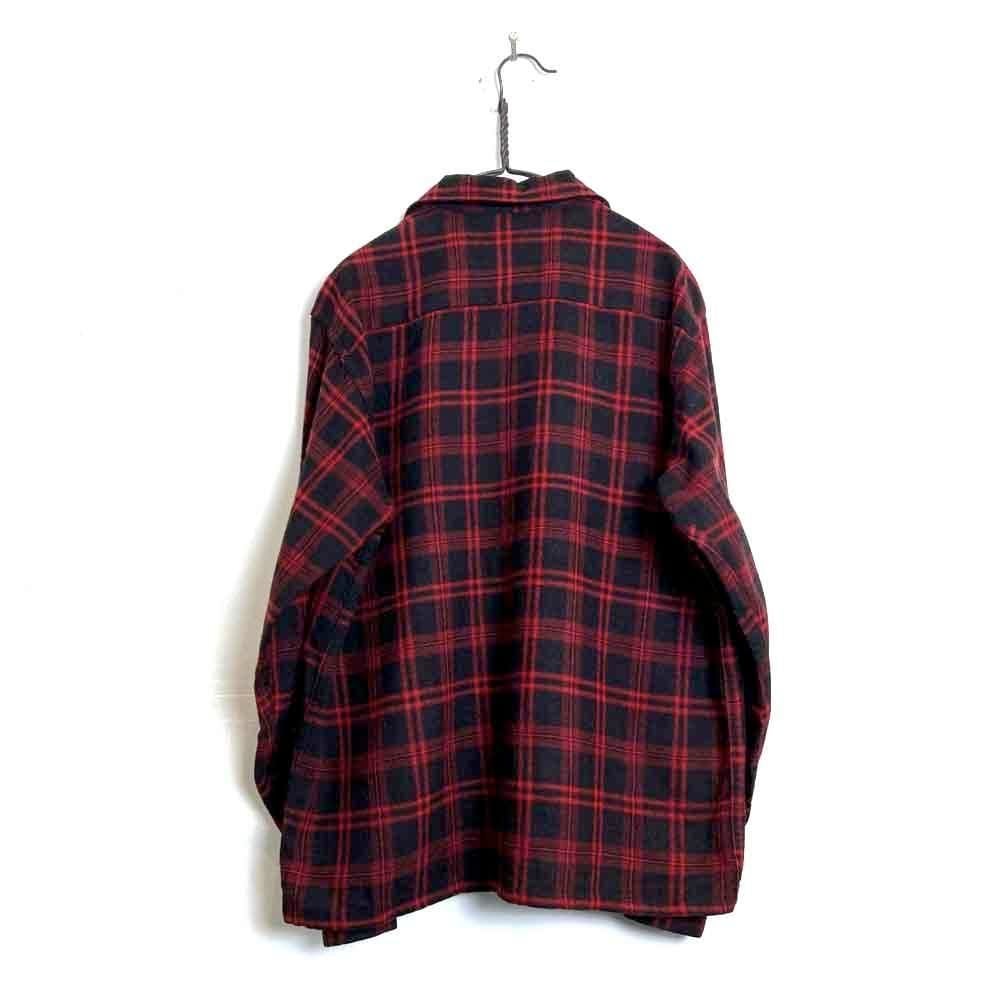 This 1960s loop-collar wool shirt features a cool two-tone black and red color scheme. The large amount of black gives it a darker look than the typical red and black check. It has a relaxed fit, rare for a vintage wool shirt, and the width and length of the shirt create a perfectly balanced silhouette.