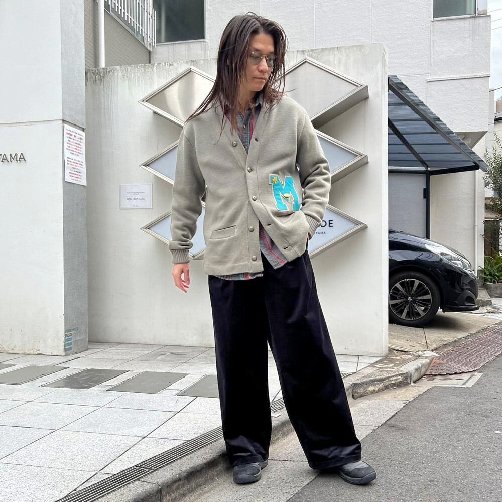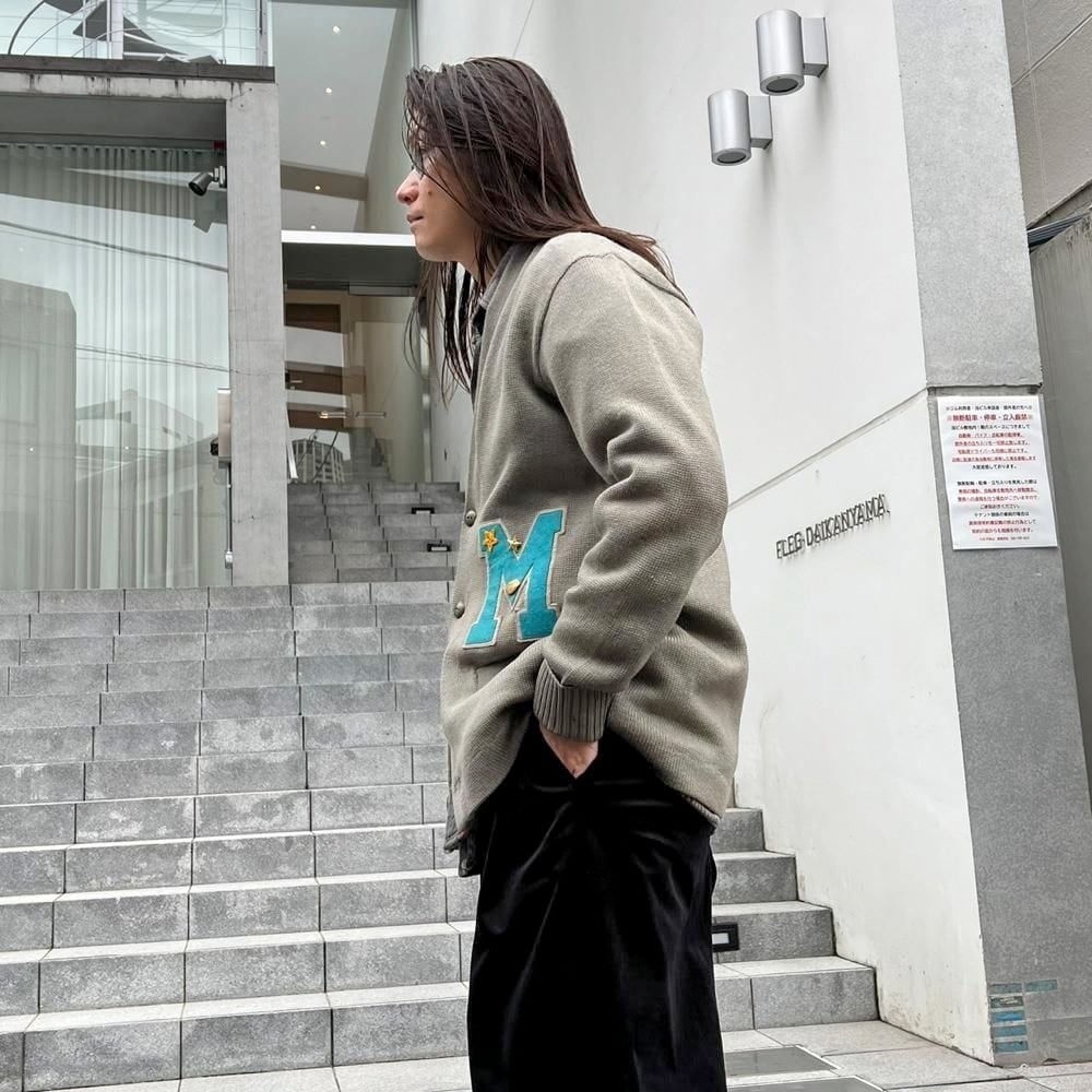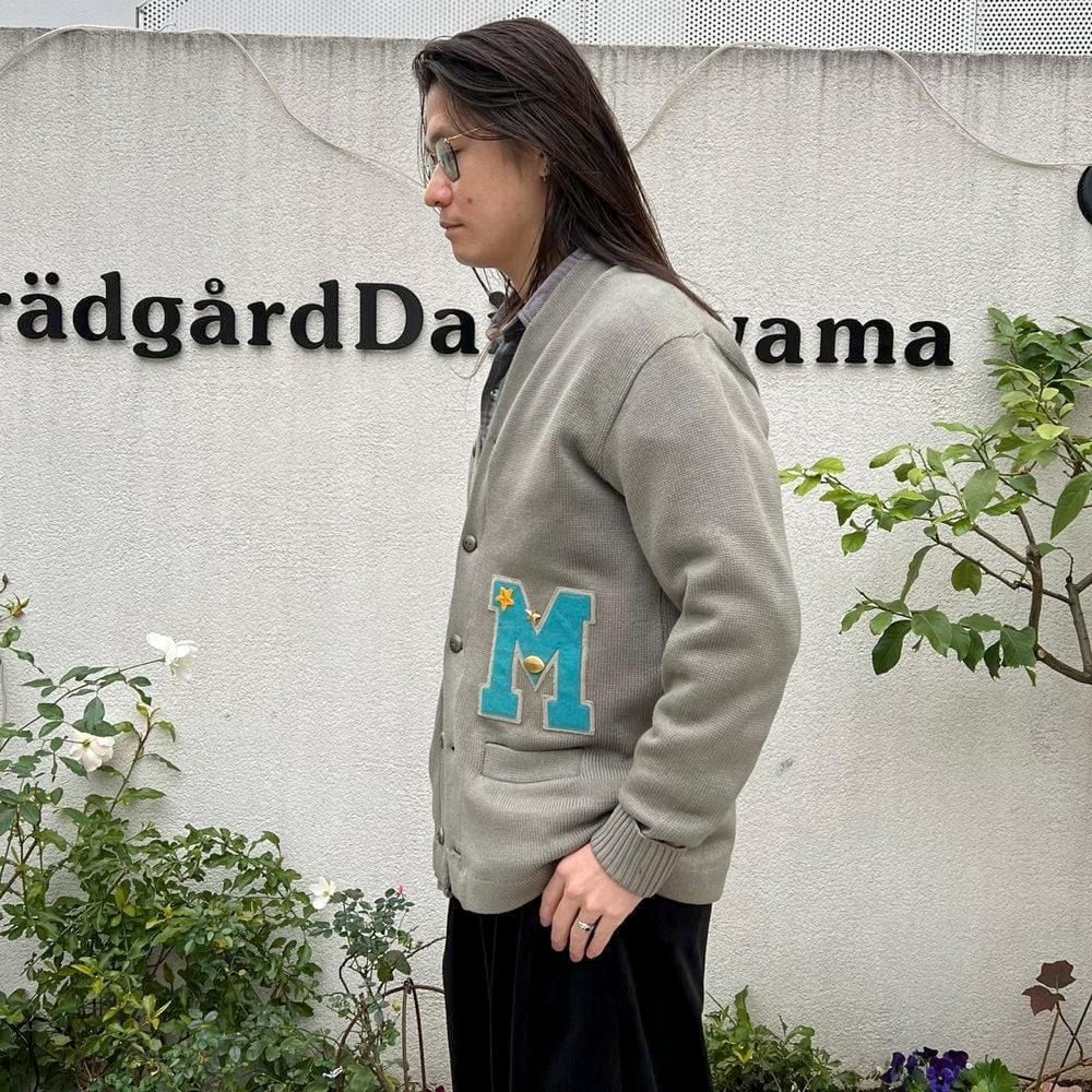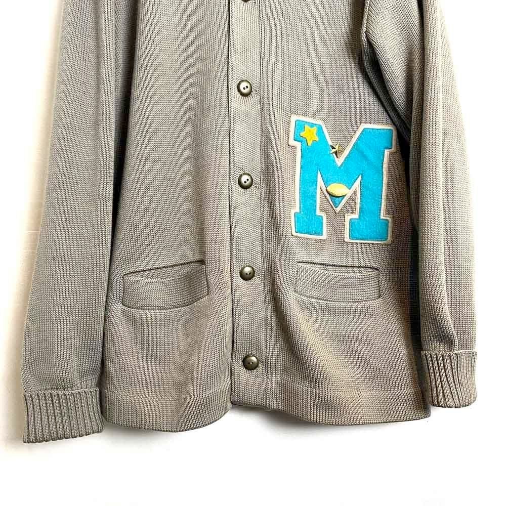 This 50s lettered cardigan is a rare vintage lettered cardigan in gray with a cute smoky blue M patch. It has a comfortable fit and a comfortable fit.