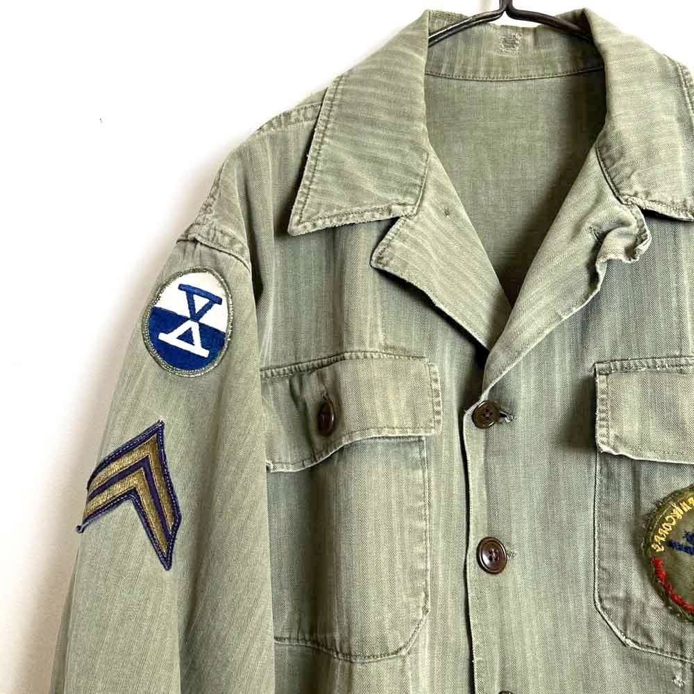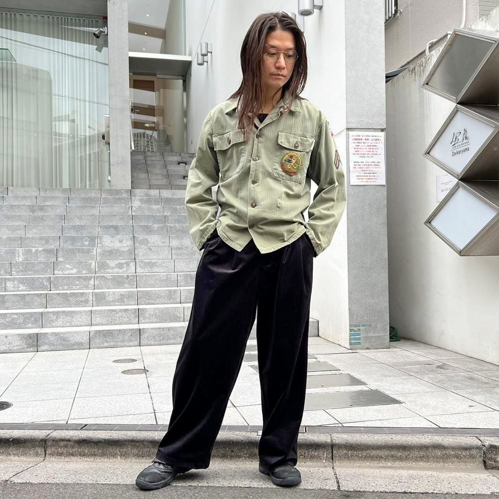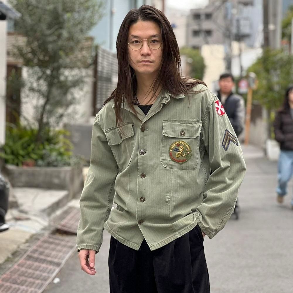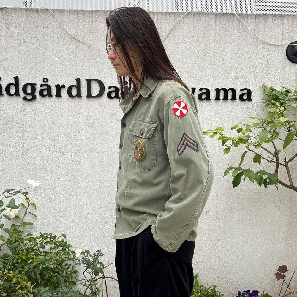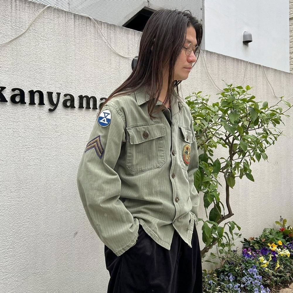 This US Army M-47 utility shirt from the 1950s is made of a well-textured, faded olive color and herringbone twill fabric. The patches on both sleeves and the left chest pocket add a nice touch. I cant confirm the size, but it fits like a size L.