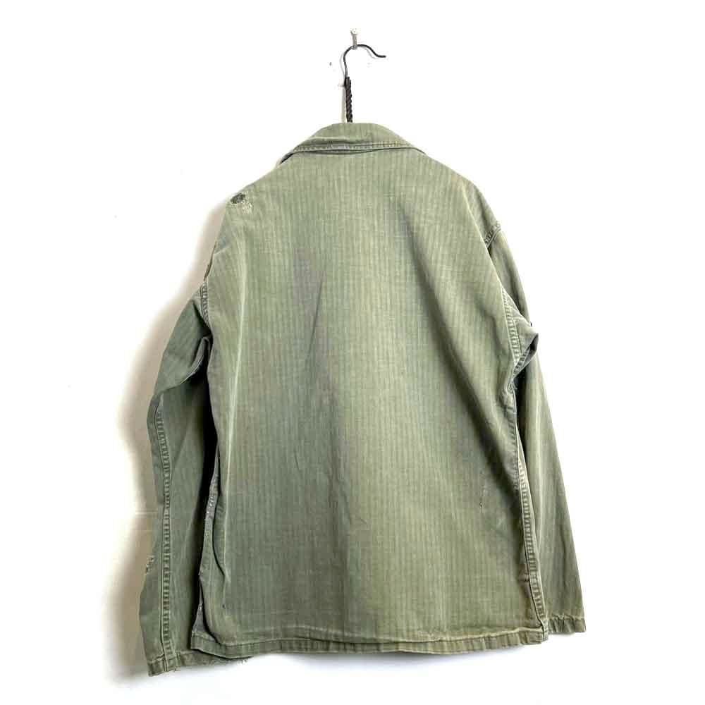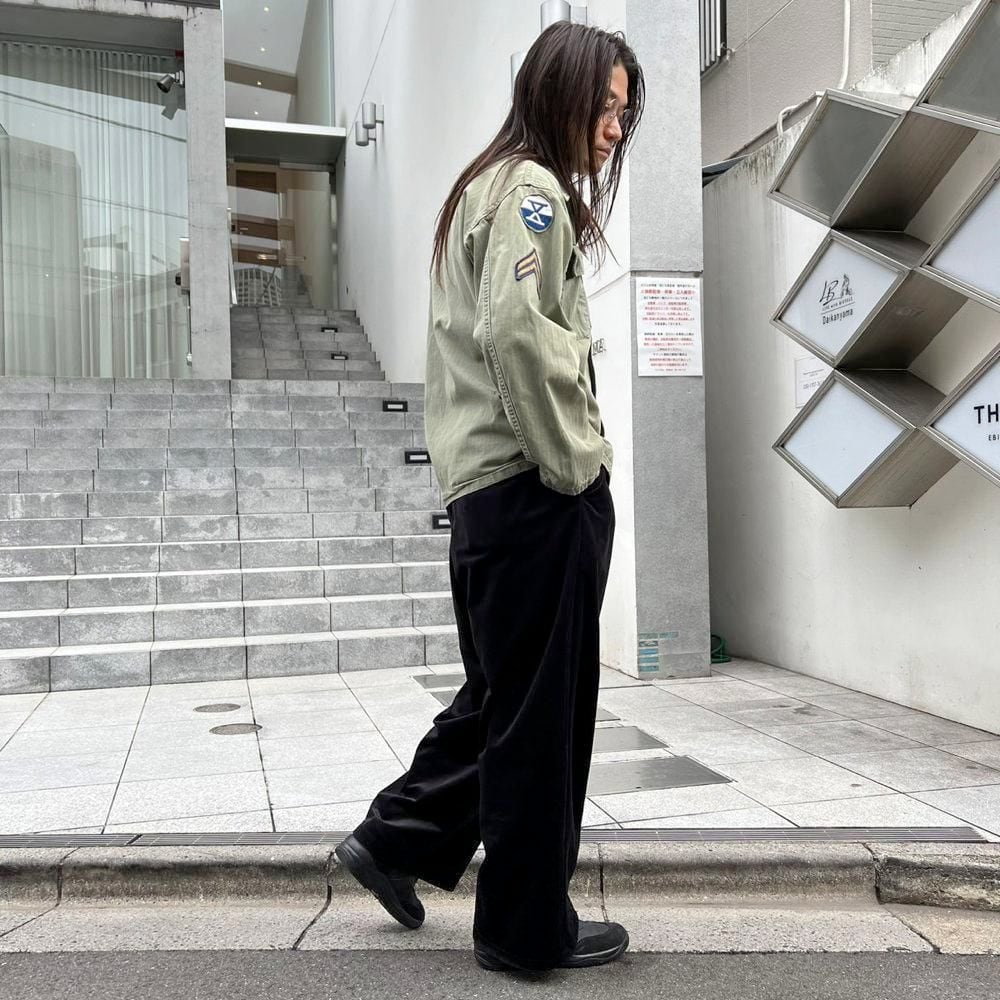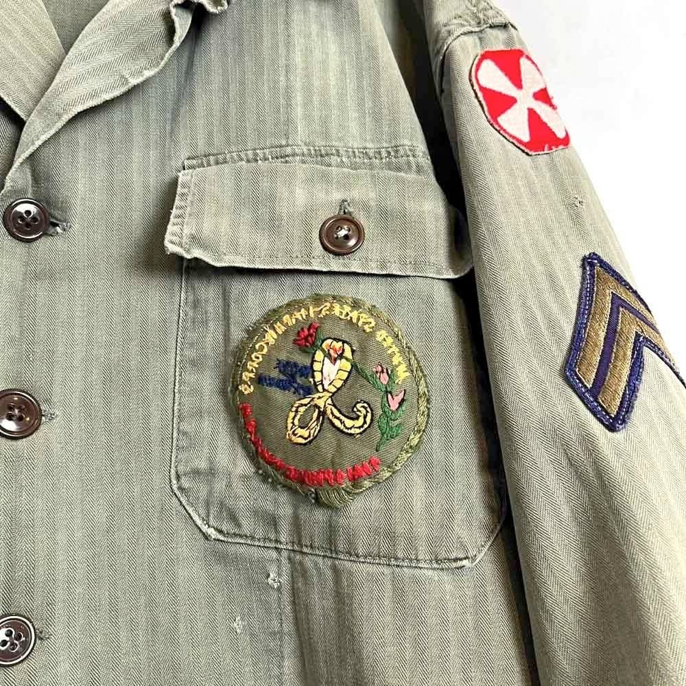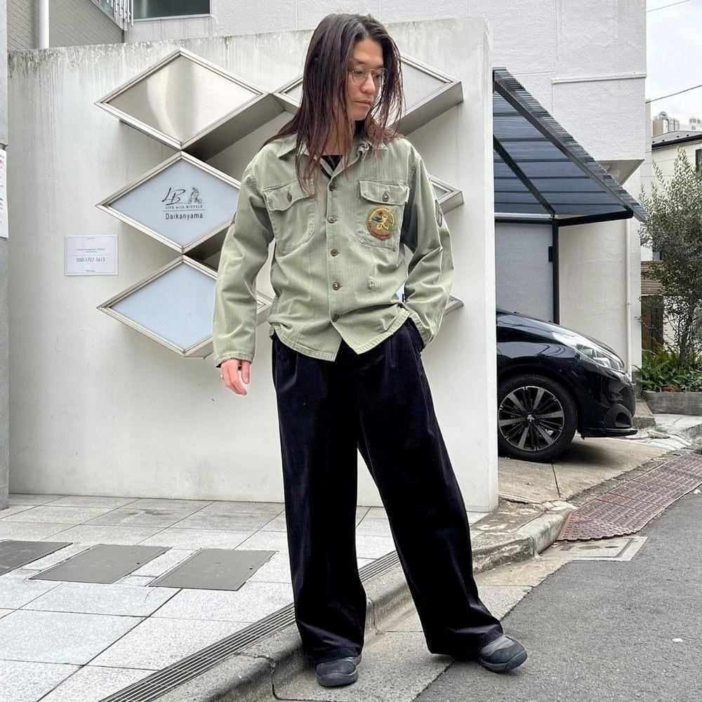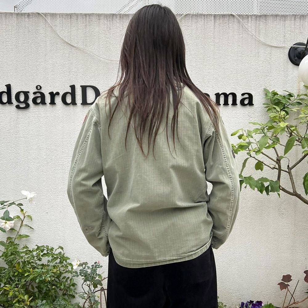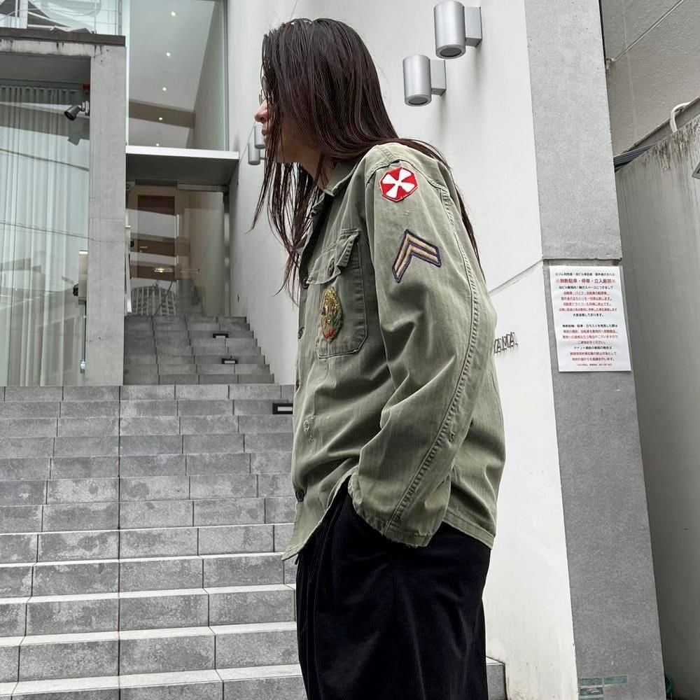 This US Army M-47 utility shirt from the 1950s is made of a well-textured, faded olive color and herringbone twill fabric. The patches on both sleeves and the left chest pocket add a nice touch. I cant confirm the size, but it fits like a size L.