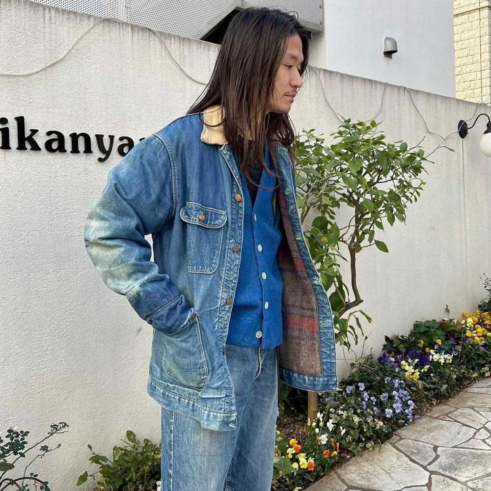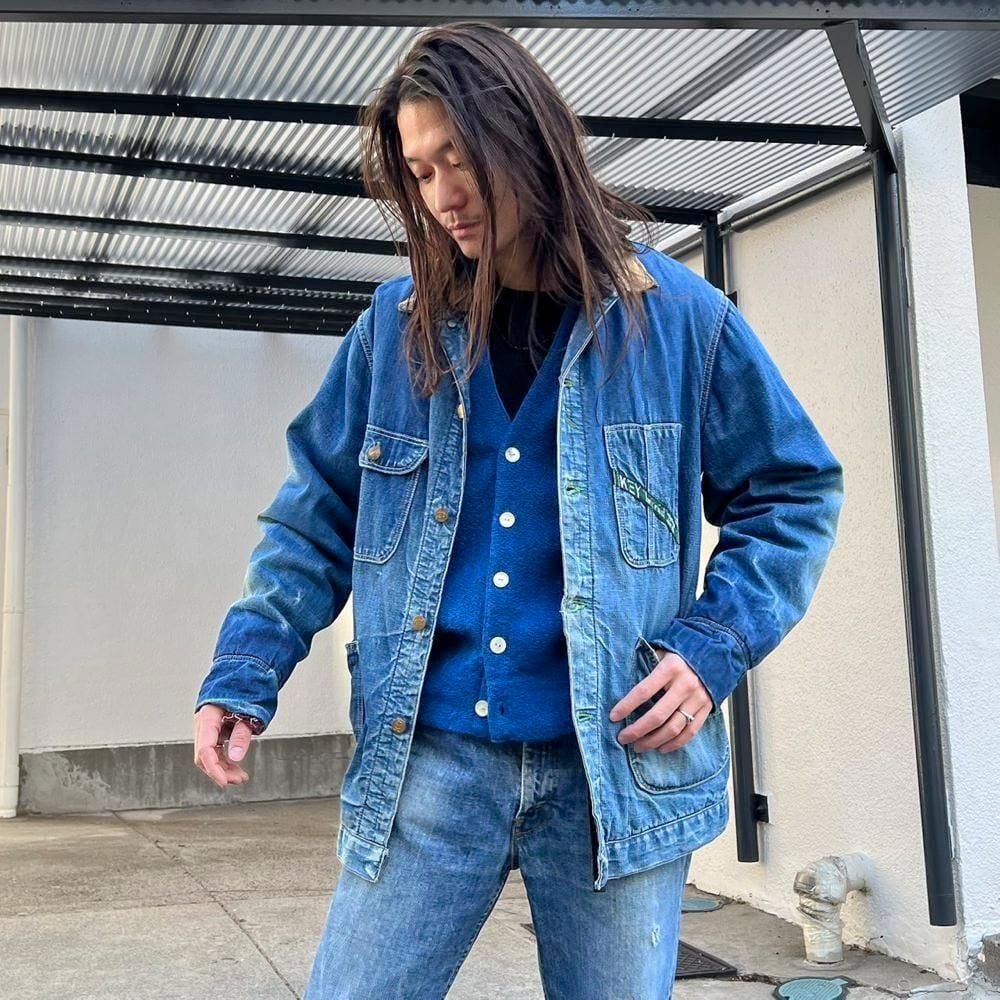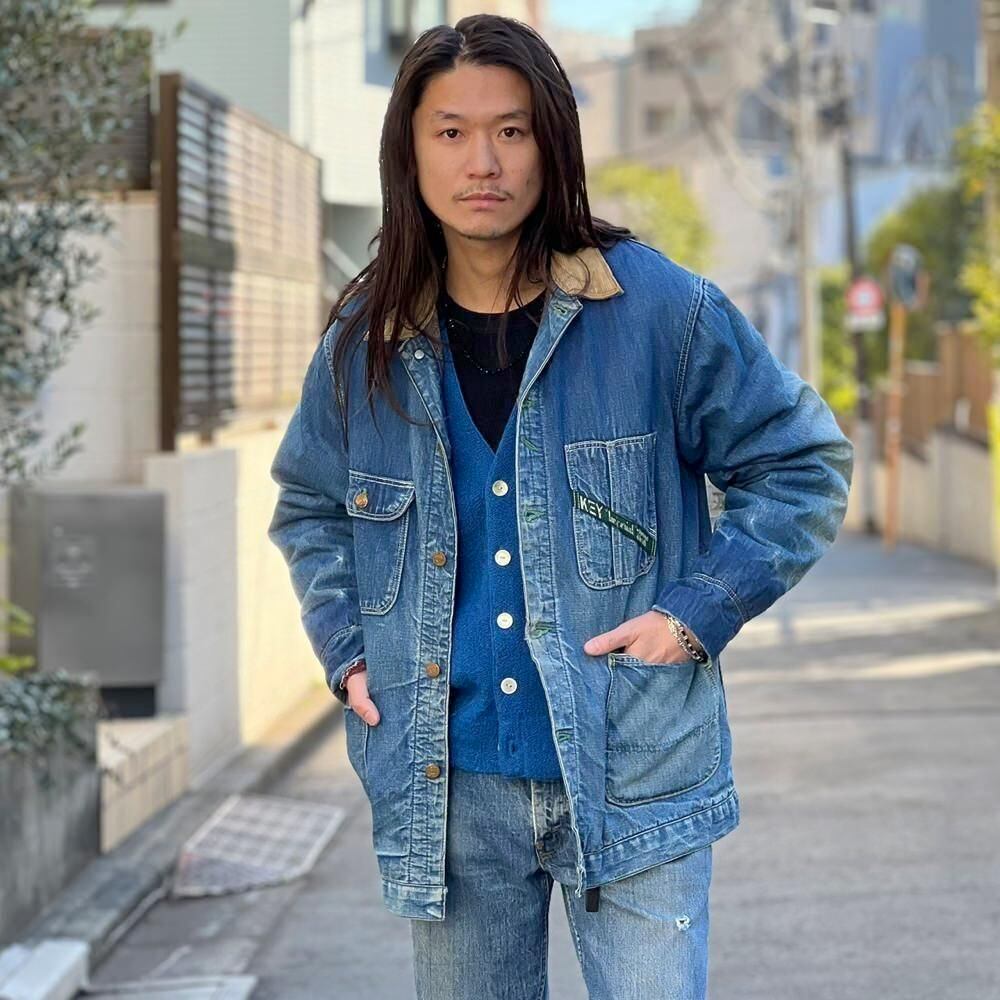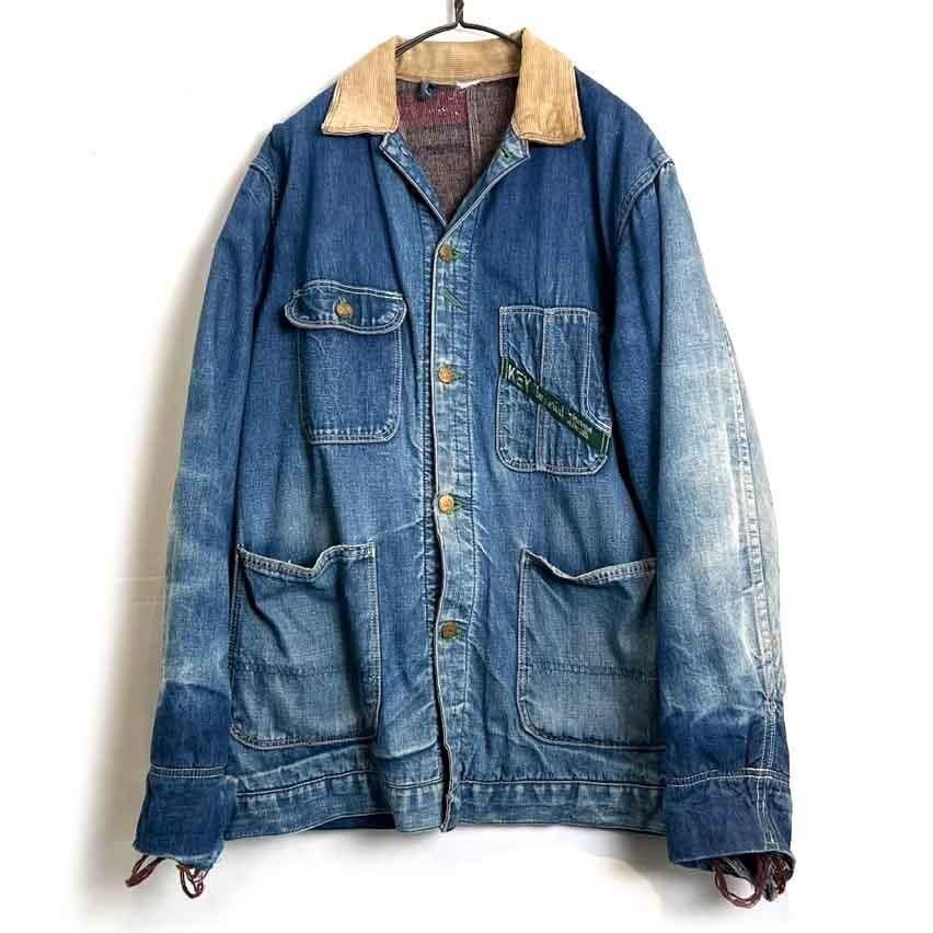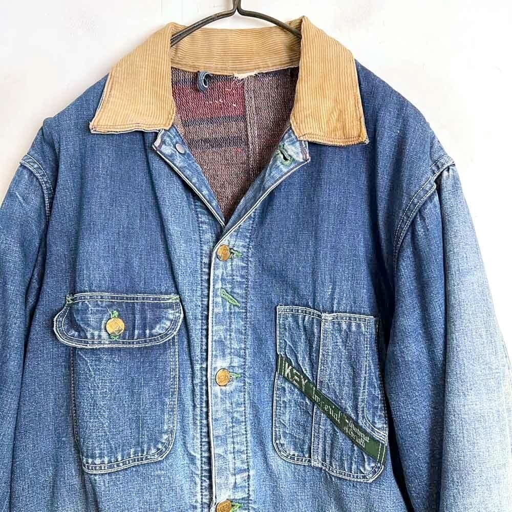 This 1950s Key coverall jacket features a beautiful indigo fade with age and a blanket lining and corduroy collar. Its a perfect fit, neither too big nor too small.