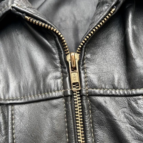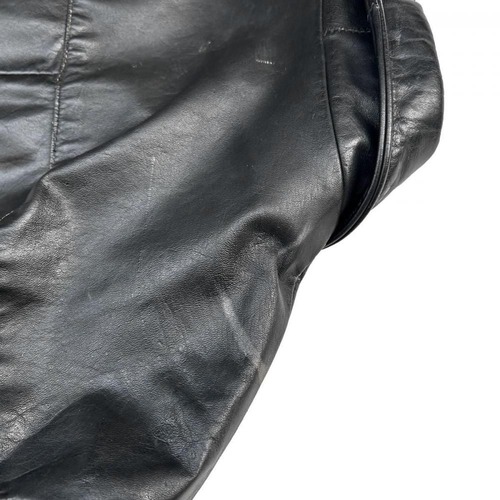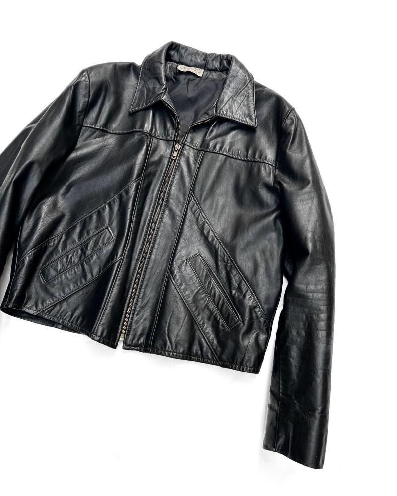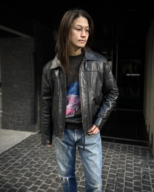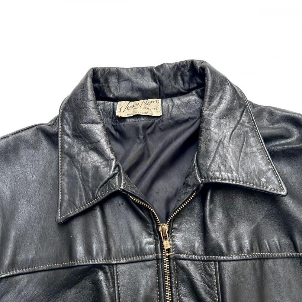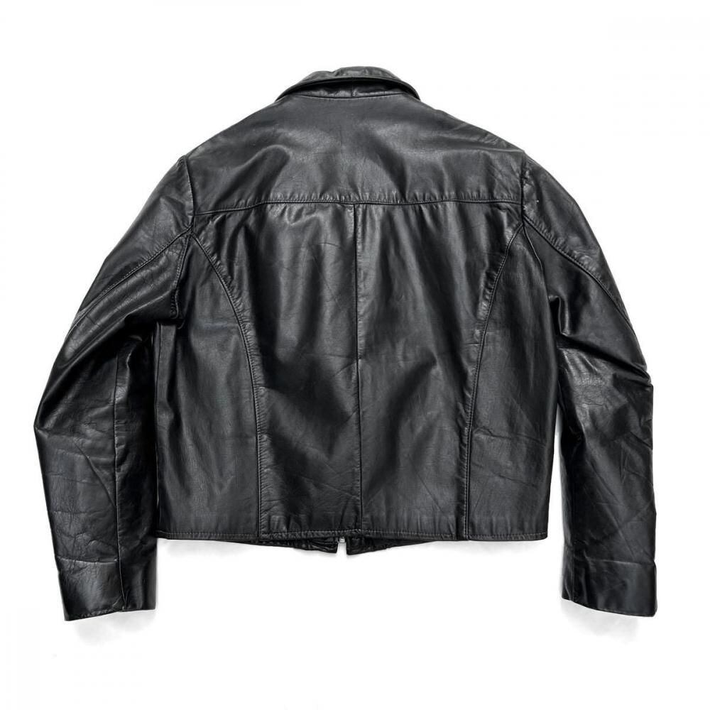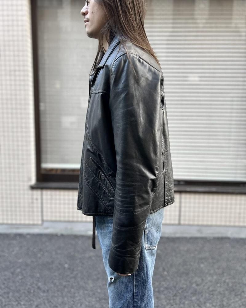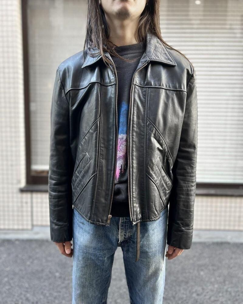 This leather jacket is from the 1970s. It features a relaxed silhouette, a rarity in a period when silhouettes were typically very slim, and the contrasting design and tight sleeves are characteristic of this era. The medium-weight cowhide leather creates a stylish look. As this is an old item, there may be some fading over time. Please review the photos and understand the characteristics of vintage items before purchasing.