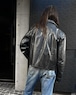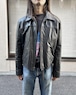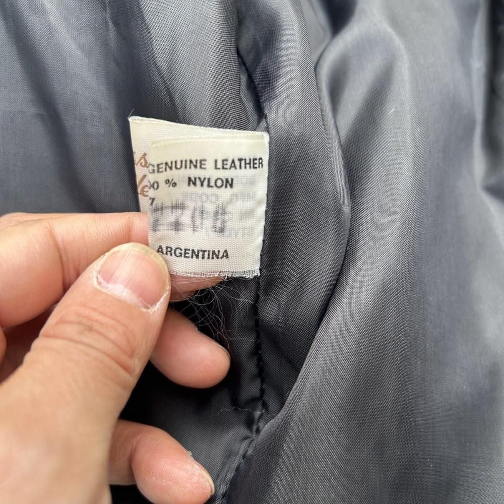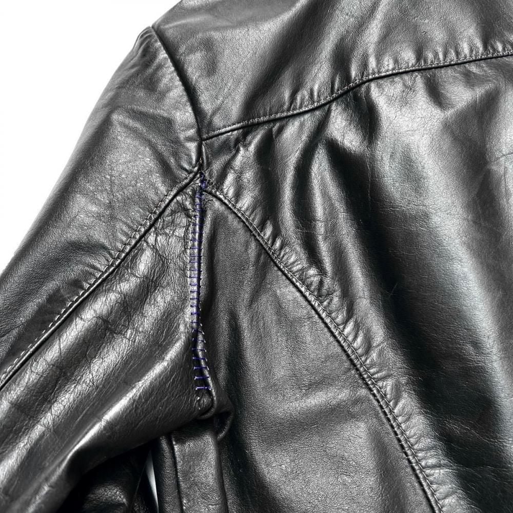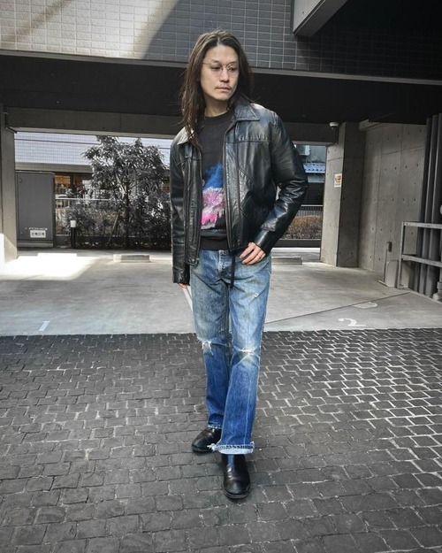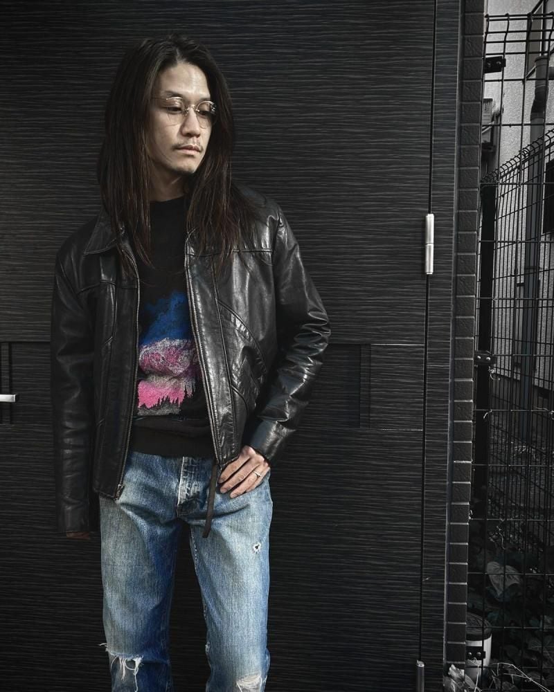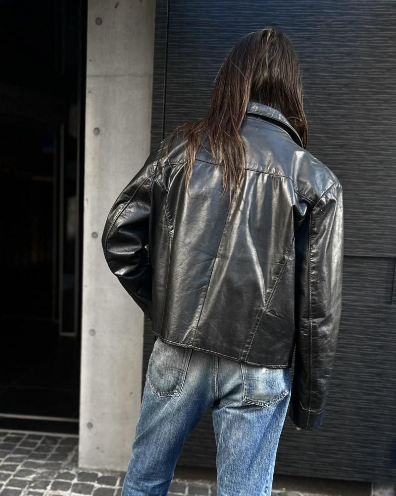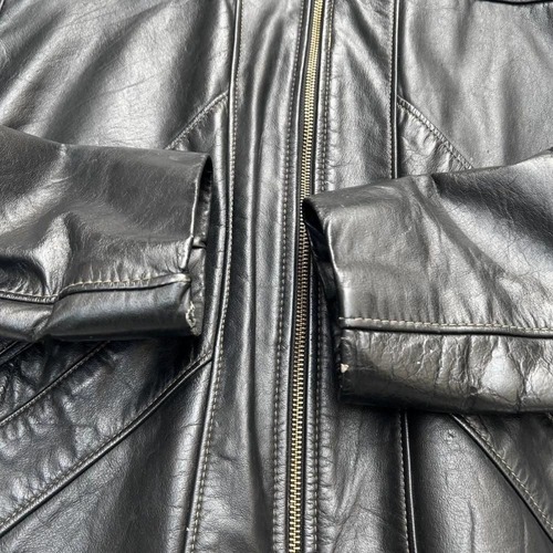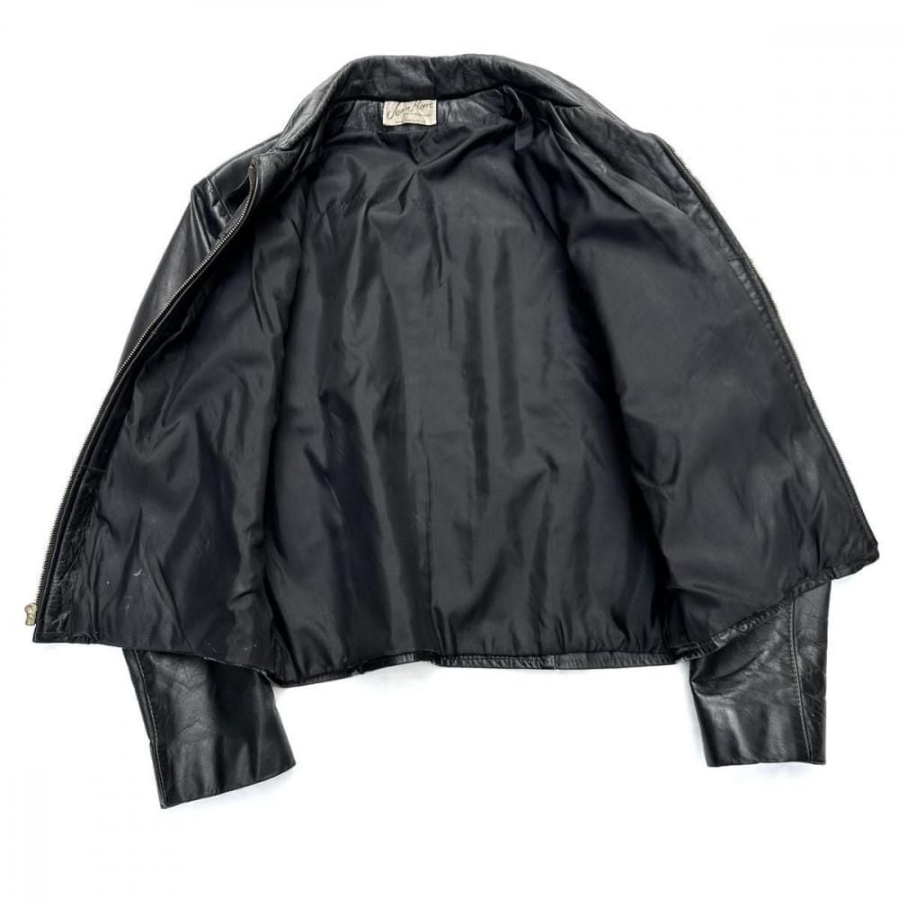 This leather jacket is from the 1970s. It features a relaxed silhouette, a rarity in a period when silhouettes were typically very slim, and the contrasting design and tight sleeves are characteristic of this era. The medium-weight cowhide leather creates a stylish look. As this is an old item, there may be some fading over time. Please review the photos and understand the characteristics of vintage items before purchasing.