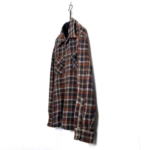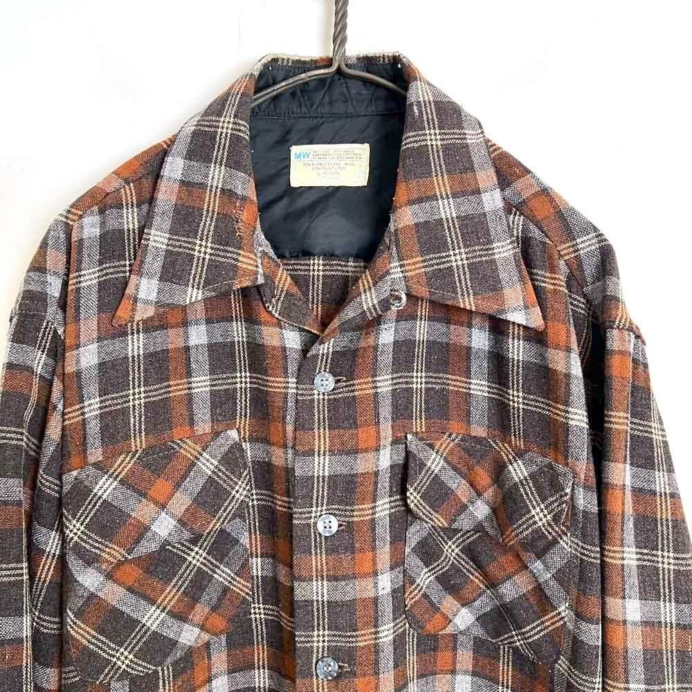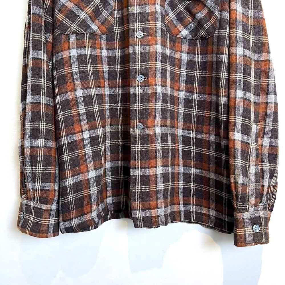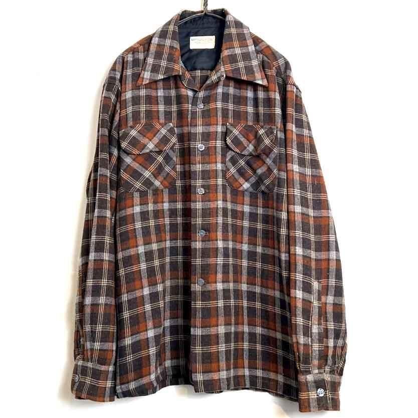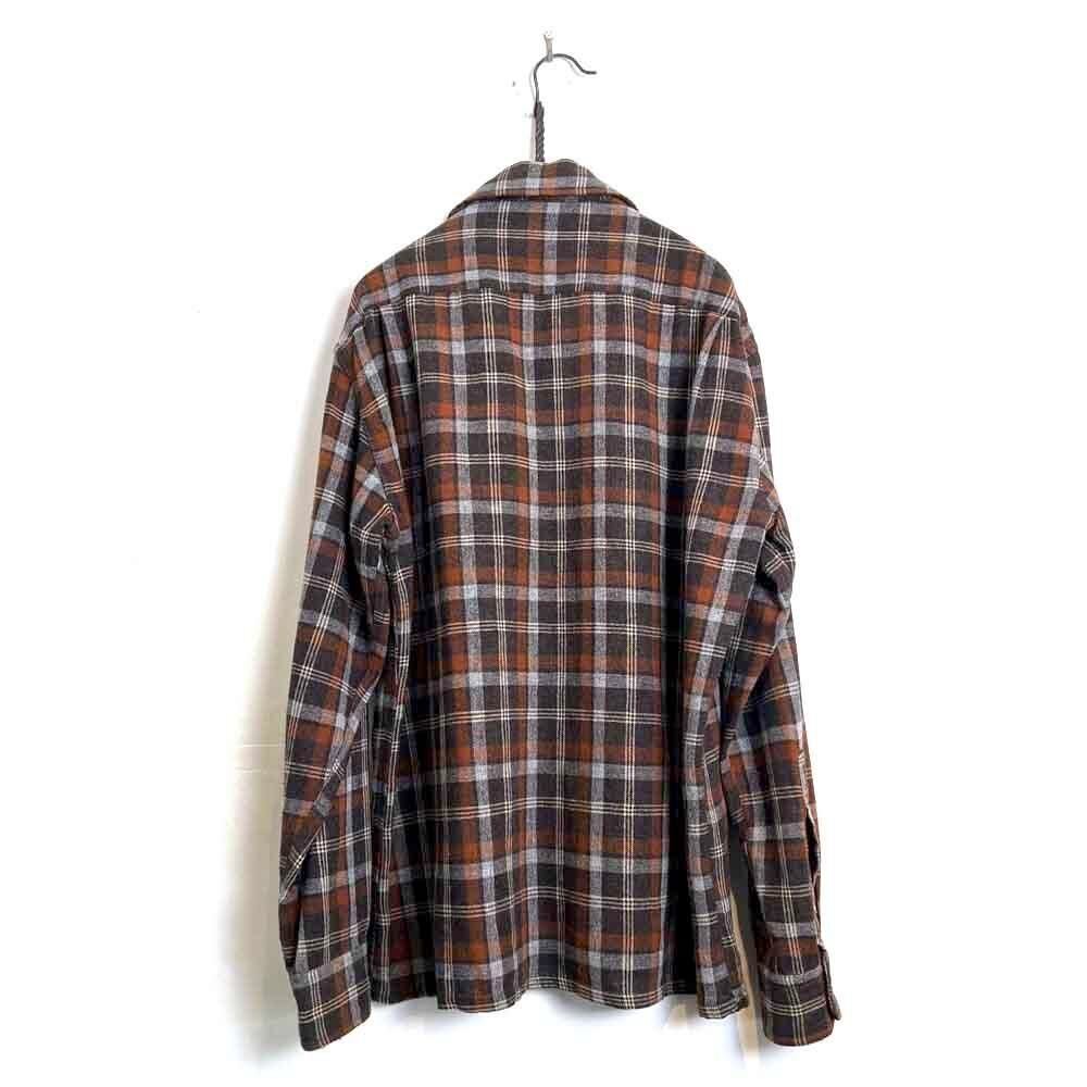 This 1970s JC Penney loop collar wool shirt features a brown check pattern with an earthy, masculine feel. Its a size L (16.5) and fits comfortably without shrinkage.