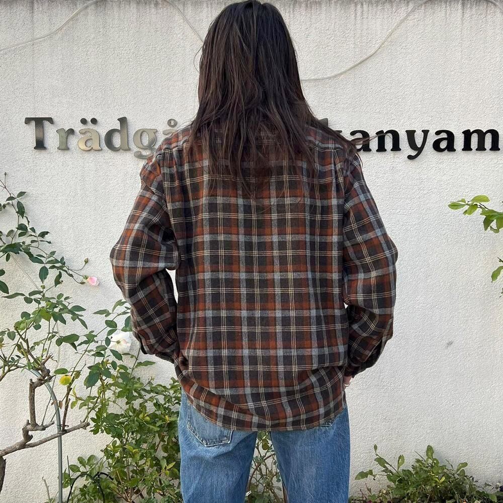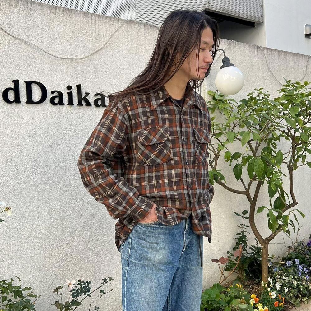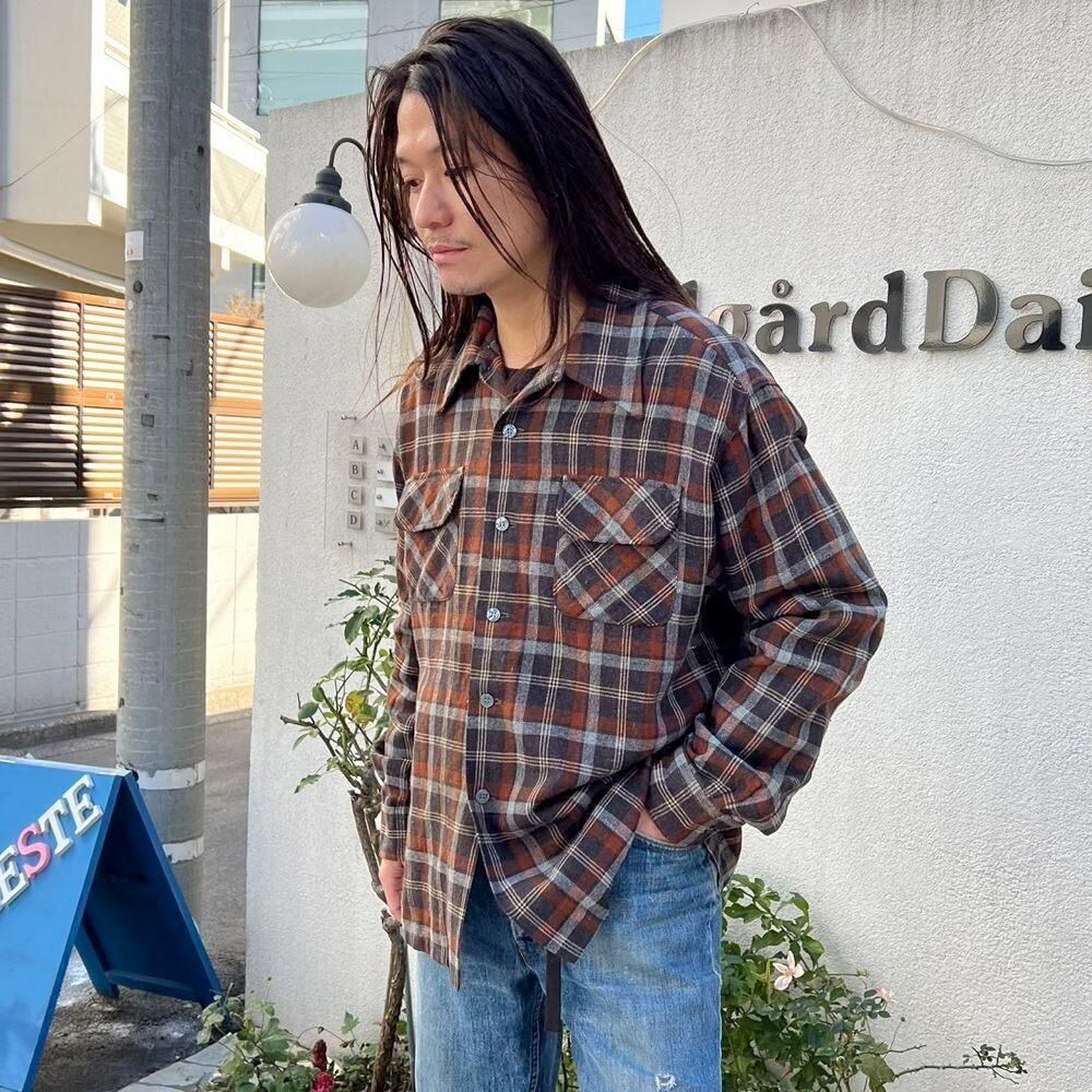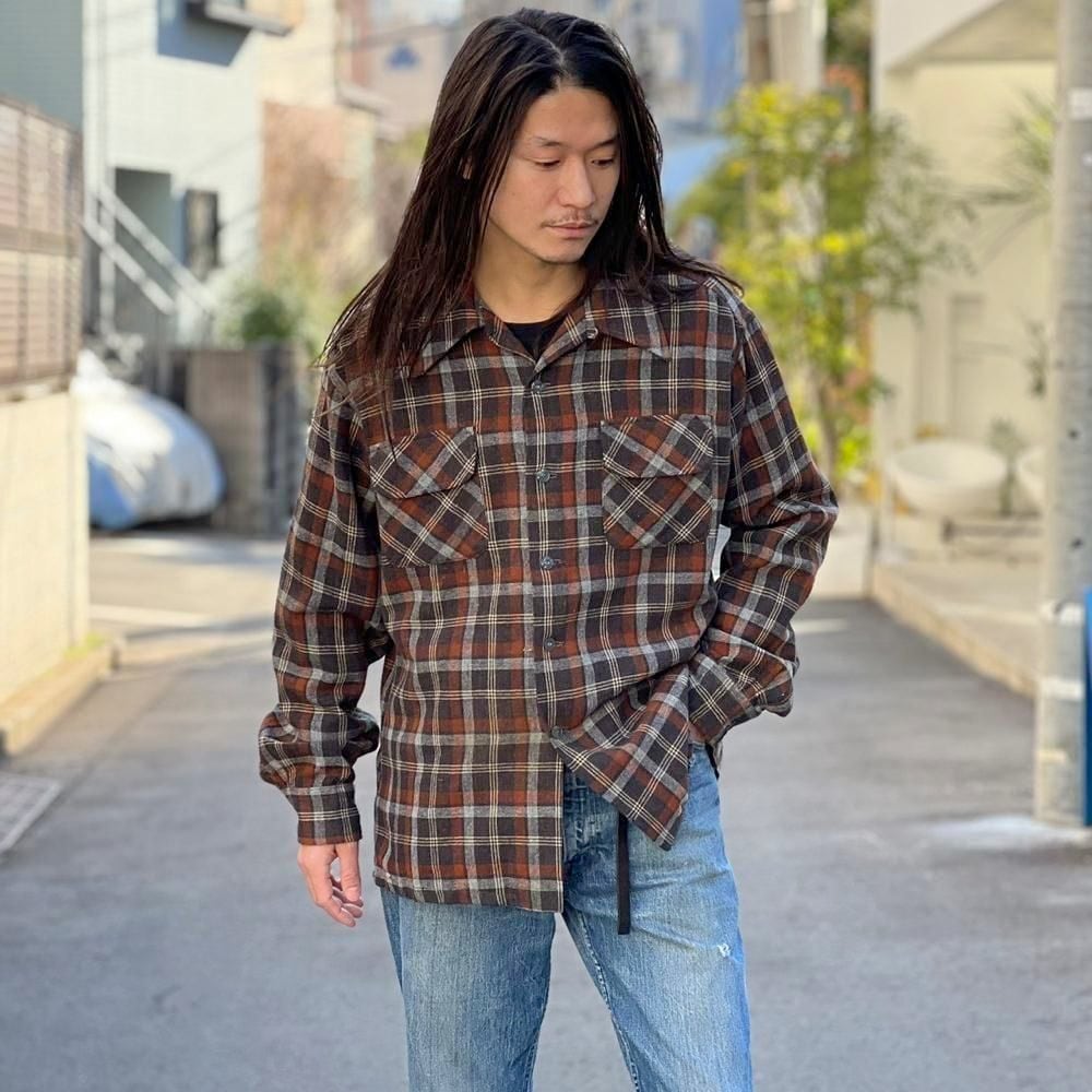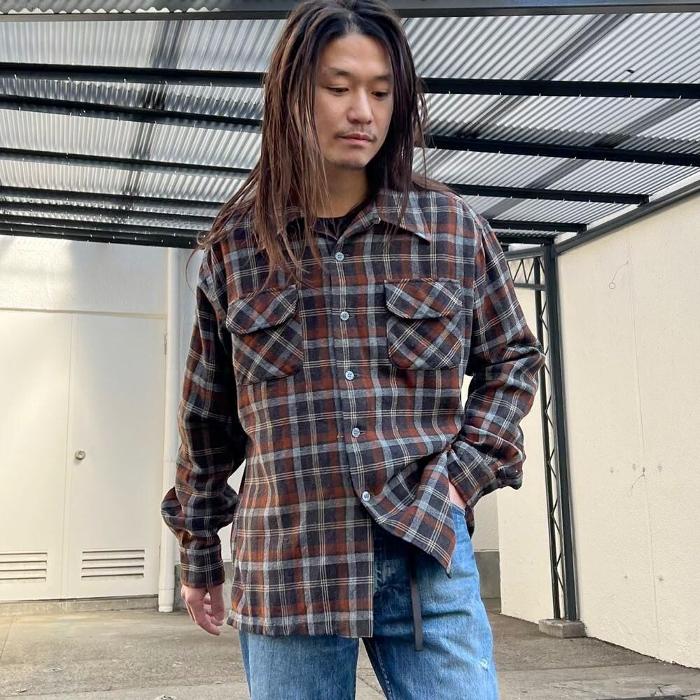 This 1970s JC Penney loop collar wool shirt features a brown check pattern with an earthy, masculine feel. Its a size L (16.5) and fits comfortably without shrinkage.