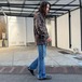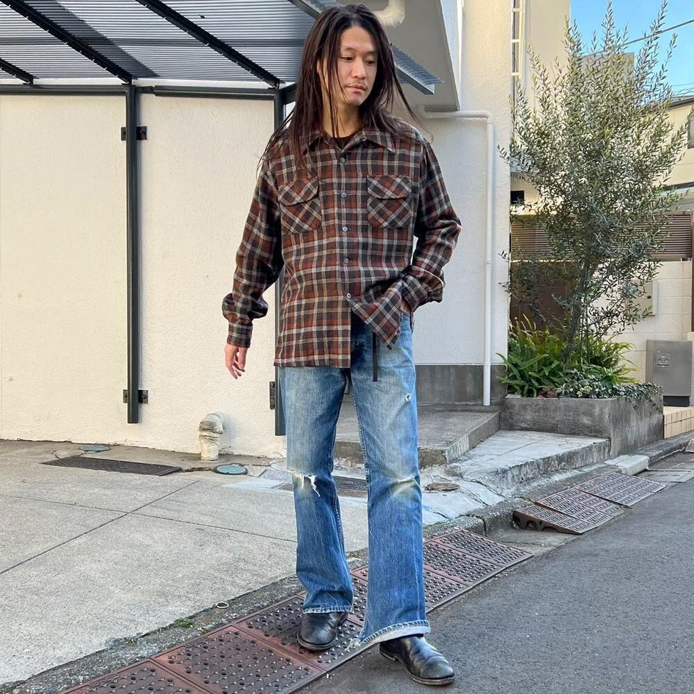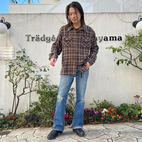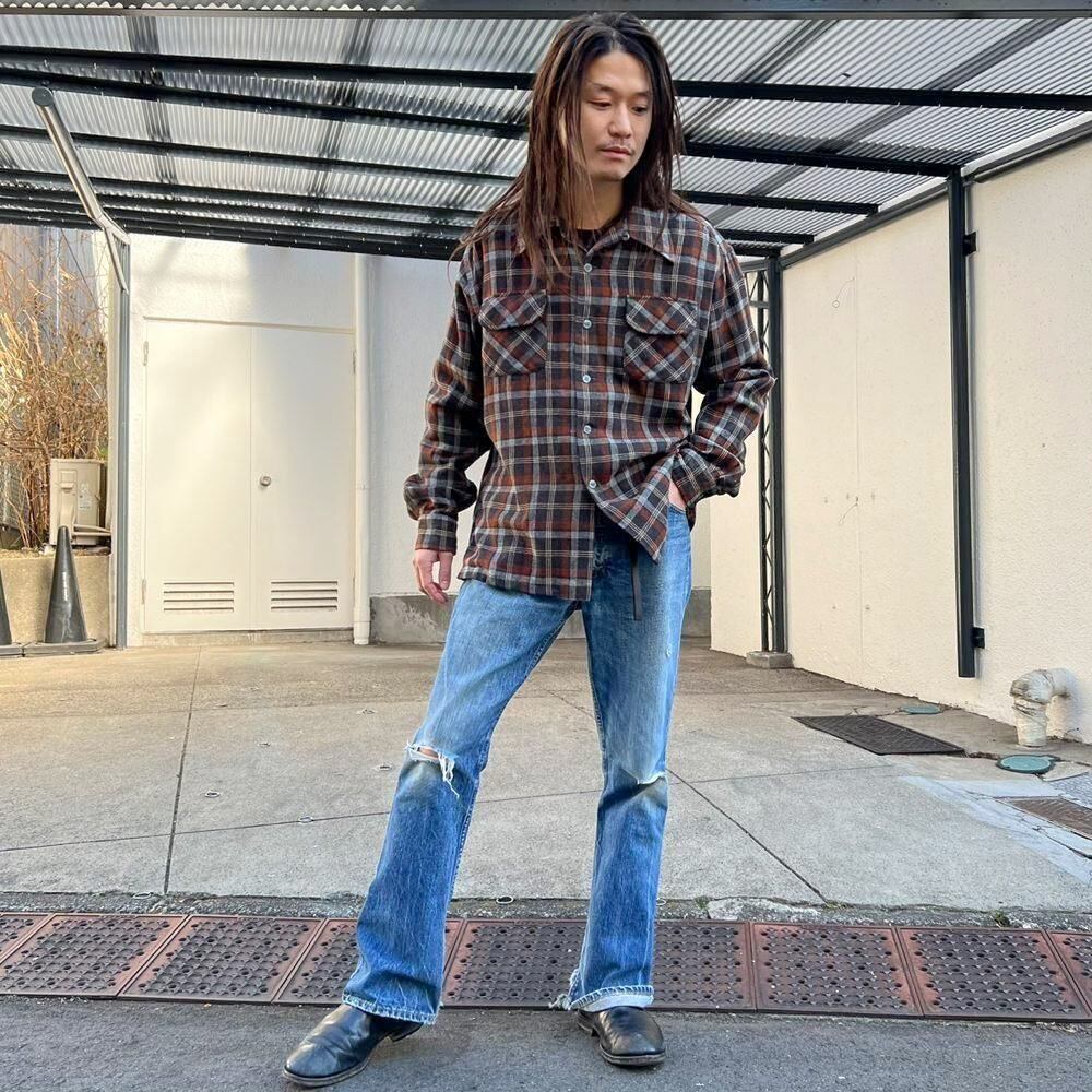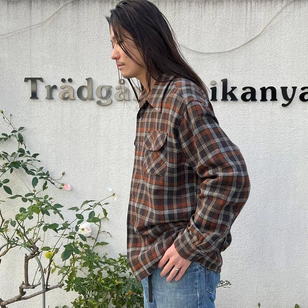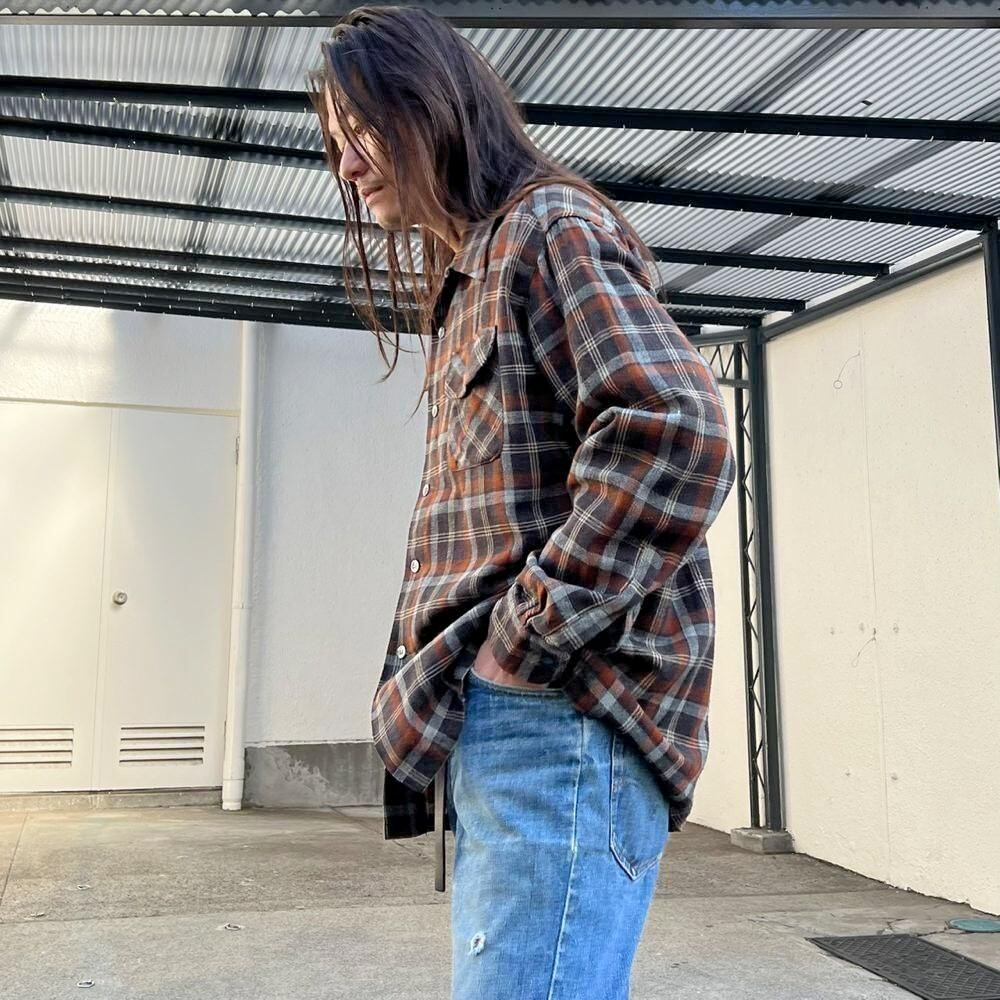 This 1970s JC Penney loop collar wool shirt features a brown check pattern with an earthy, masculine feel. Its a size L (16.5) and fits comfortably without shrinkage.