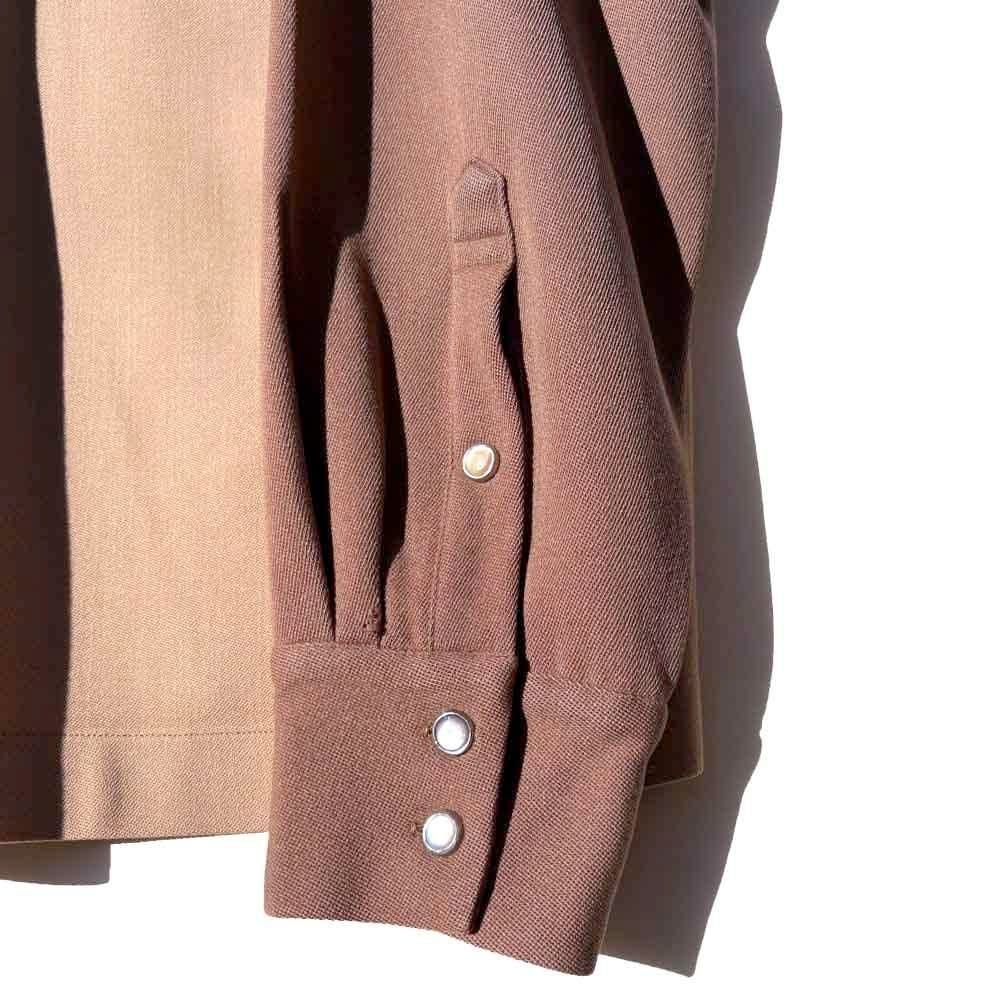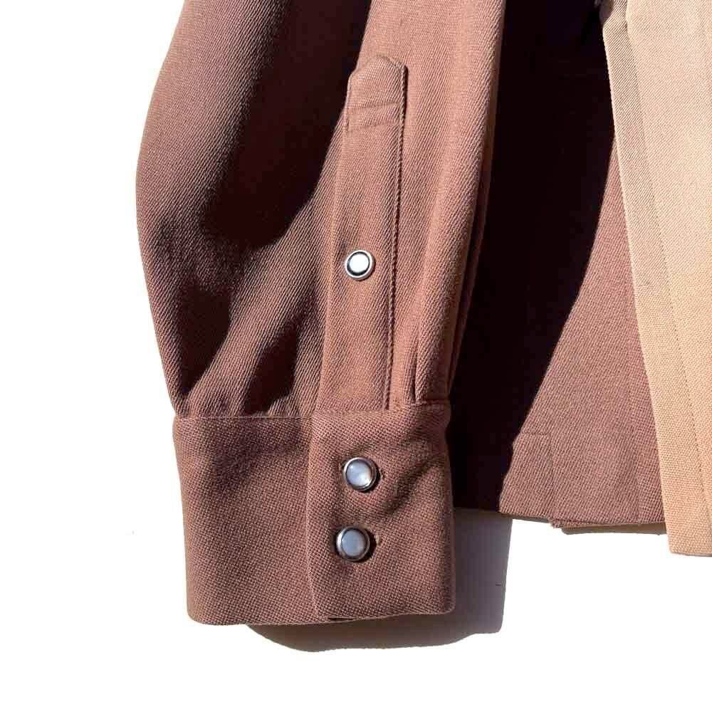 The chest pocket has leather on both ends of the welt and the cuffs have snap buttons, giving it a Western-style design.
