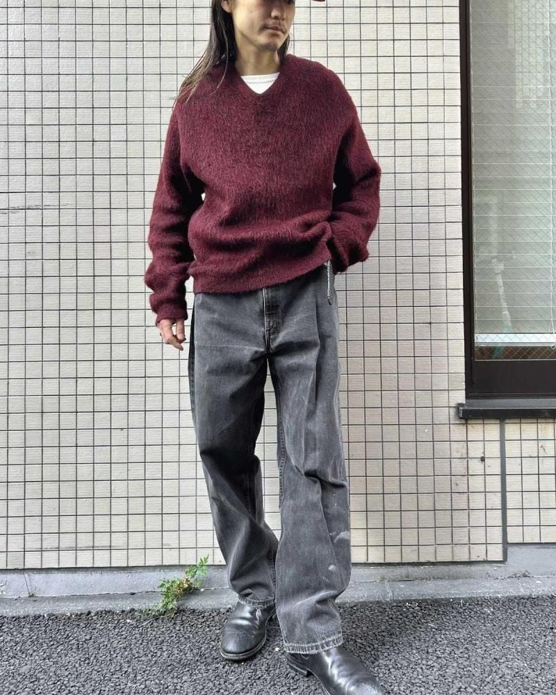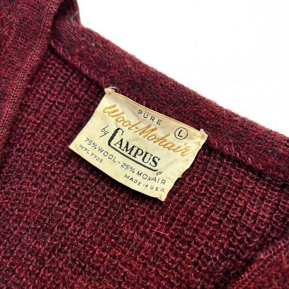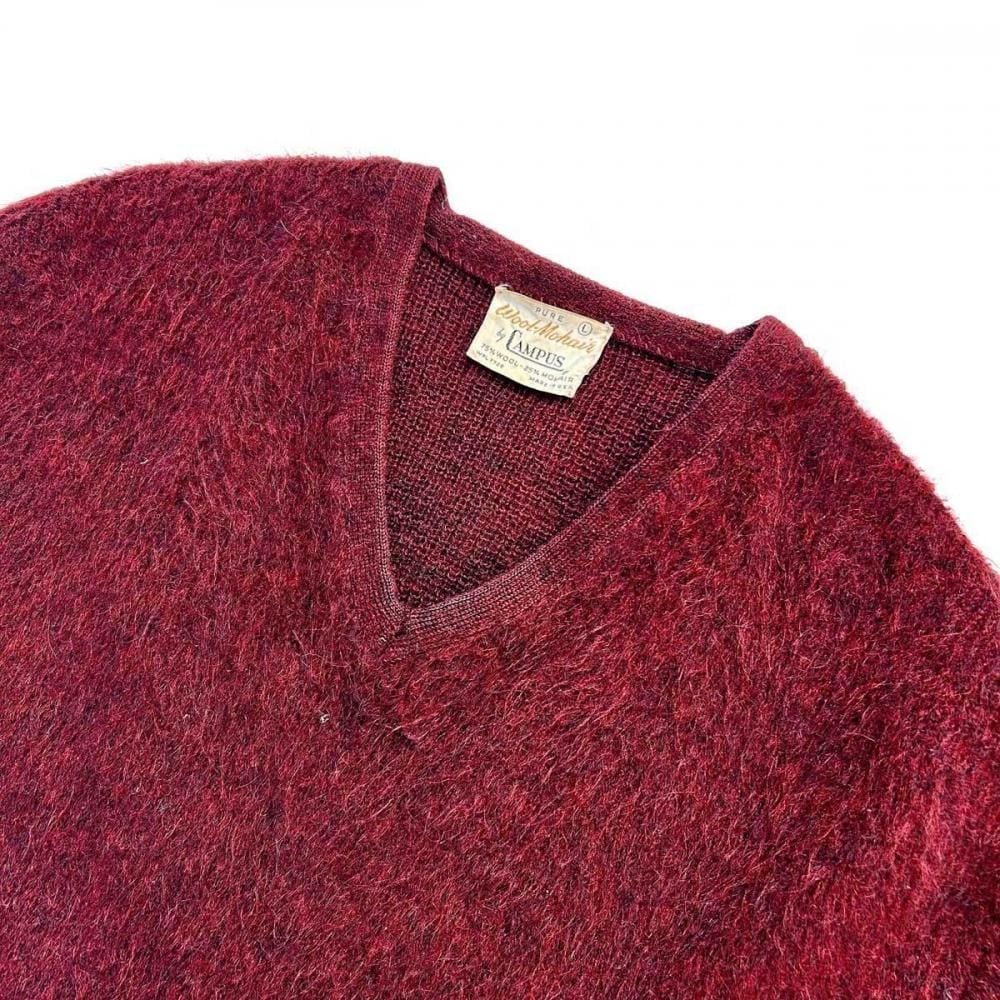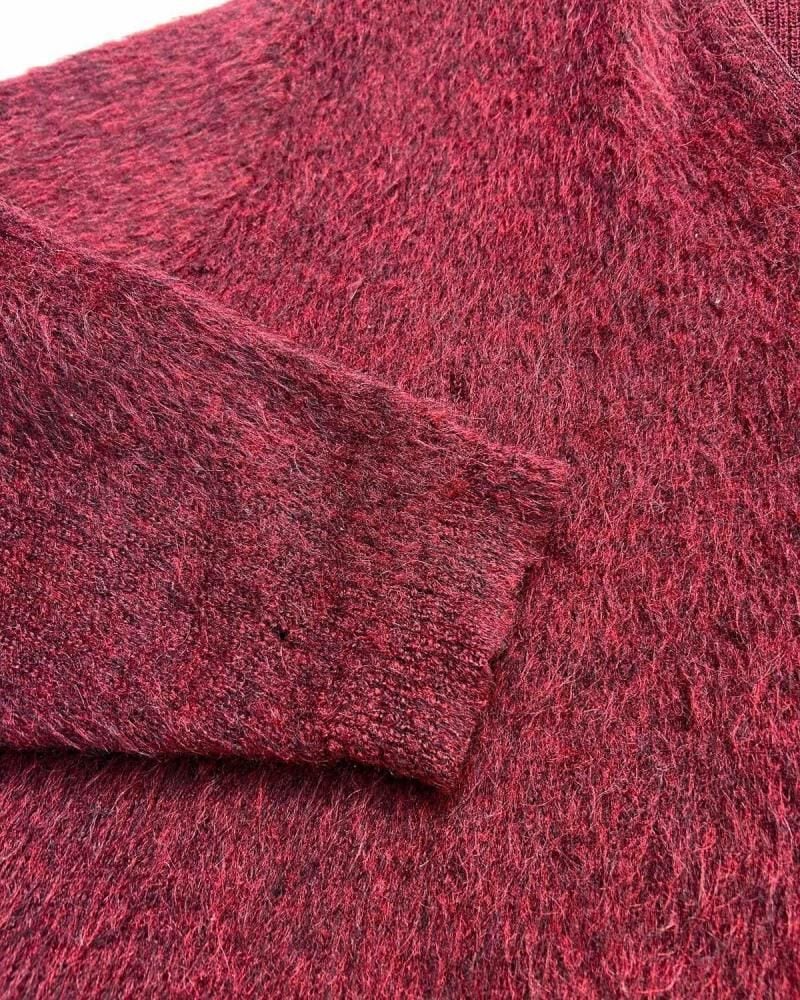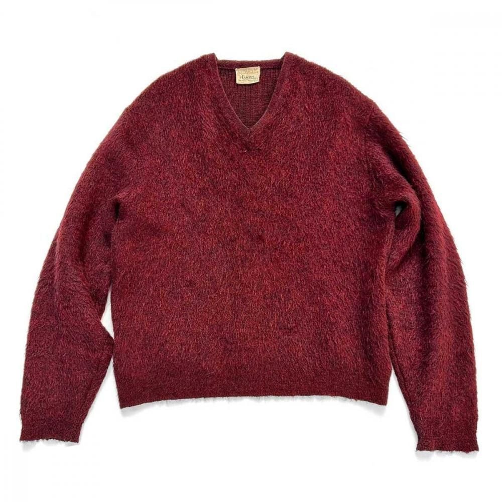This mohair-blend pullover knit is from the 1960s. Its burgundy coloring and subdued, vintage look are a testament to its depth. Its silhouette offers a rare, relaxed feel, creating a well-balanced silhouette. The 75/25 blend of mohair provides a comfortable, comfortable feel, though this one varies depending on the mohair. As this is an old item, there may be occasional signs of aging. Please review the photos and understand the unique characteristics of vintage items before purchasing.