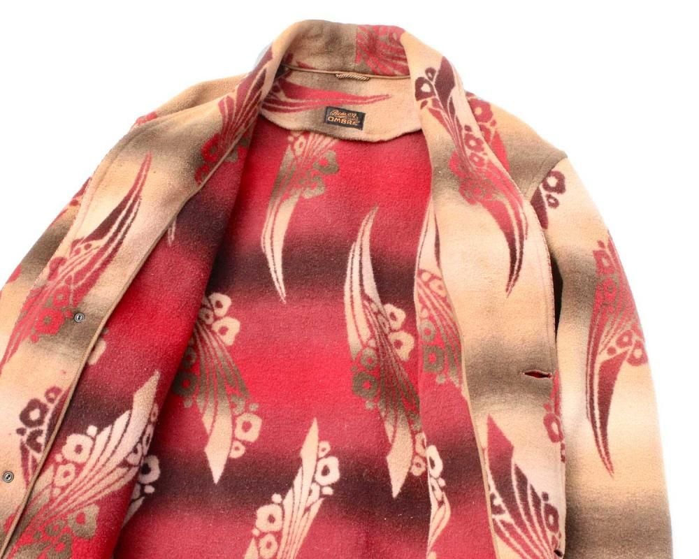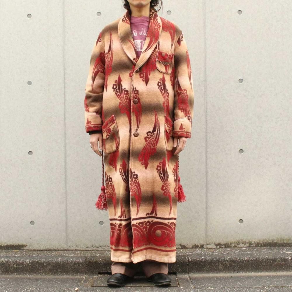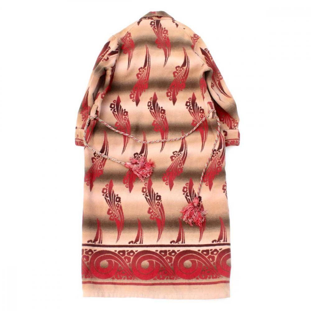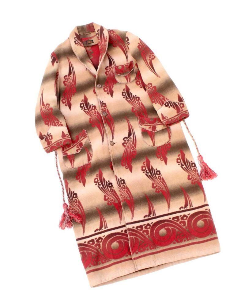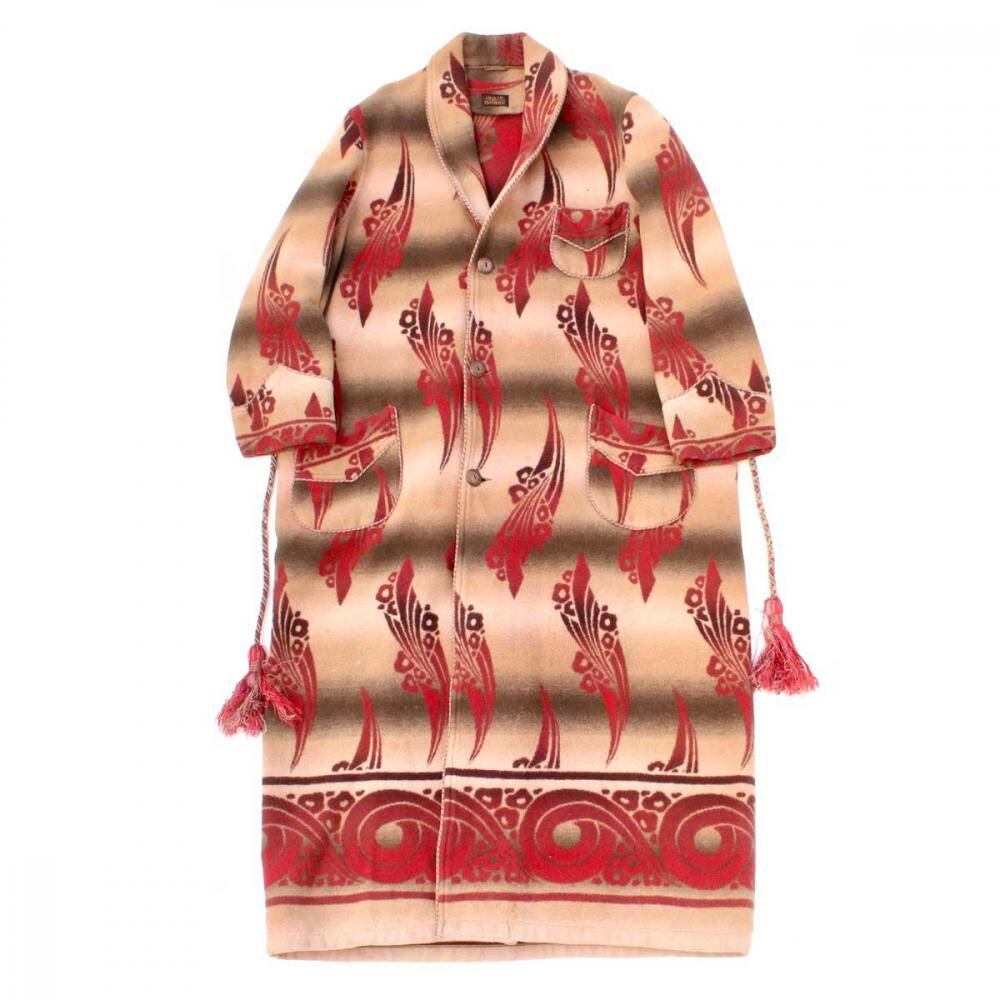 Beacon Blanket Company was founded in Massachusetts in 1904. Initially, they manufactured blankets from recycled yarn, but in 1925, they moved their factory to North Carolina, closer to the source of their cotton. They became extremely popular through their store brand in the 1930s. This is a 1940s ombré-labeled 100% cotton gown. The unique dyeing technique creates a beautiful gradation, resulting in a soft, natural texture from the fine-weave flannel fabric. (By the 1950s, looms that produced this fine weave were no longer in use, and rayon (acetate) was used instead, making this a rare piece from before that time.) The vintage-inspired Native American pattern and detailed piping and cording make this a rare piece of high quality. Considering its age, this piece is in excellent condition, and it can be fastened with buttons and worn like a coat. The tailored silhouette and patterning are roomy yet streamlined. As this is an old item, there may be occasional signs of aging. Please review the photos and understand the nature of vintage items before purchasing.