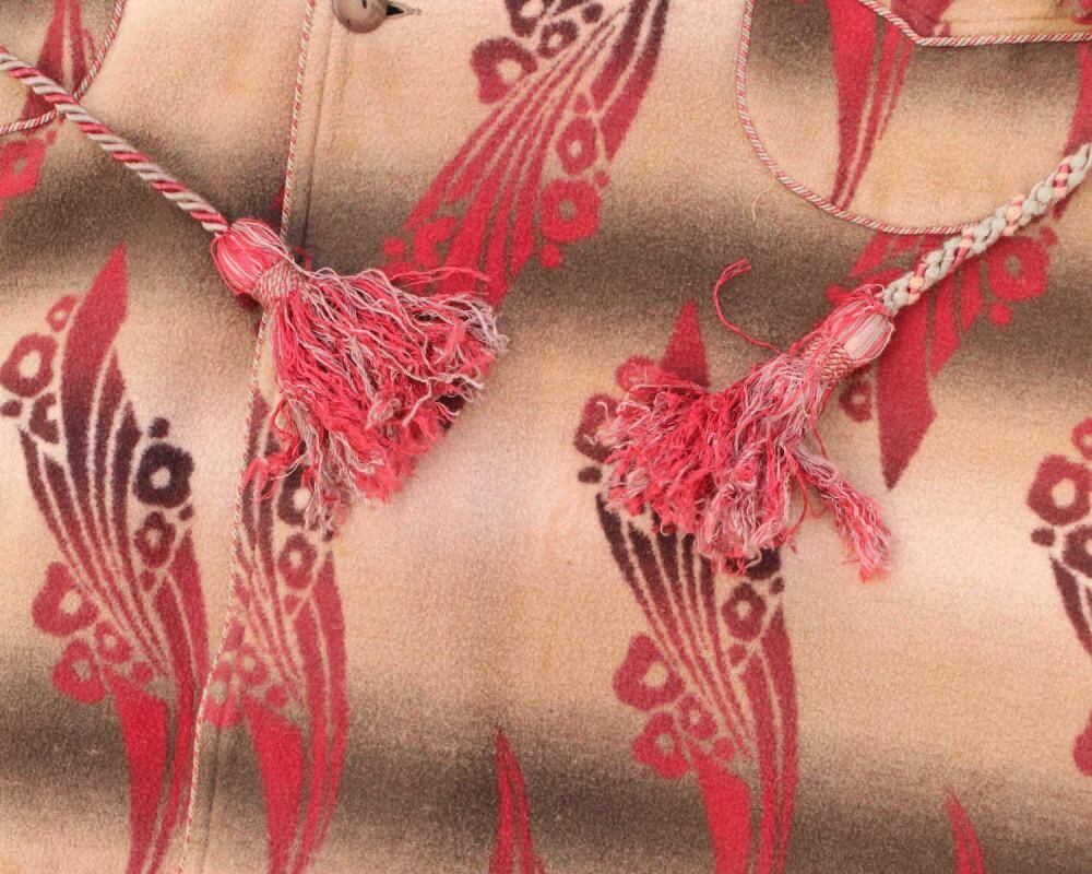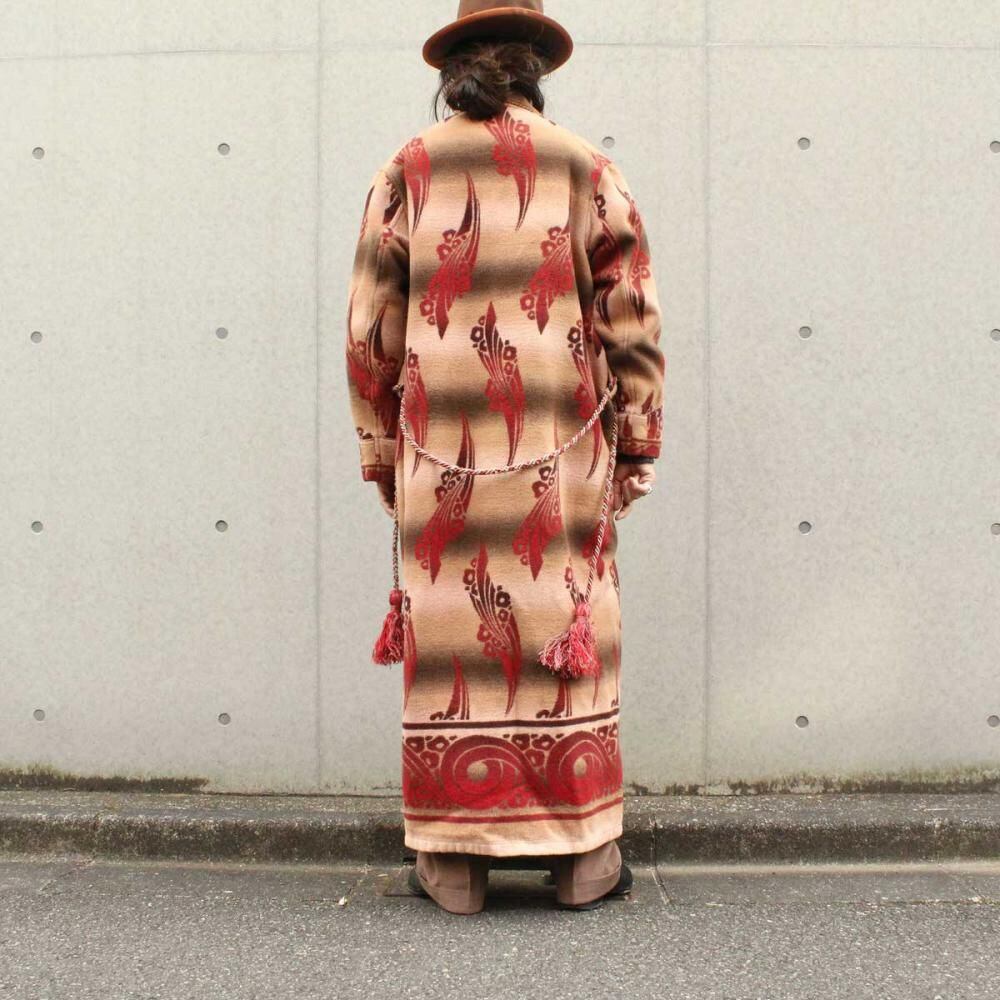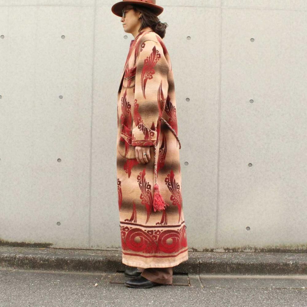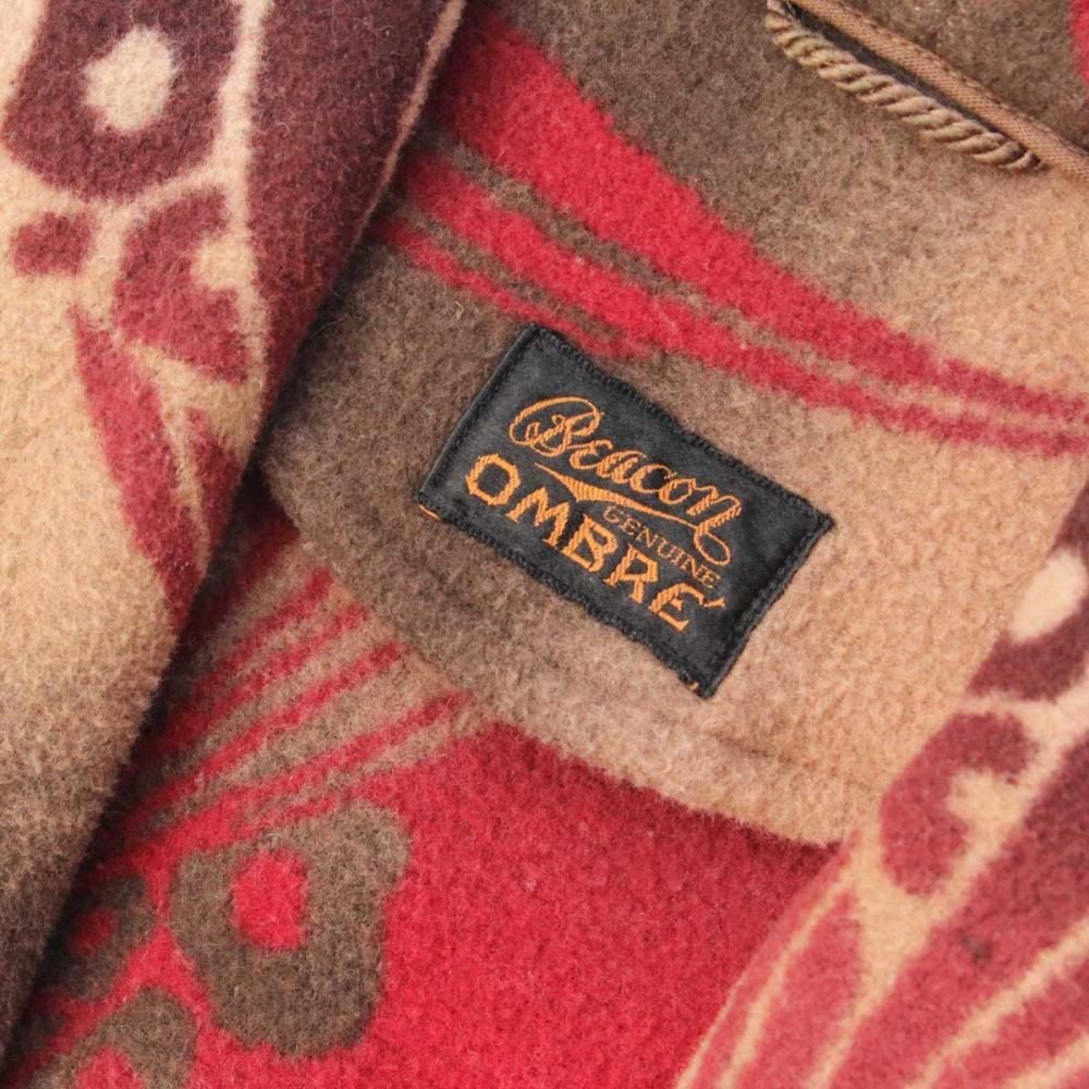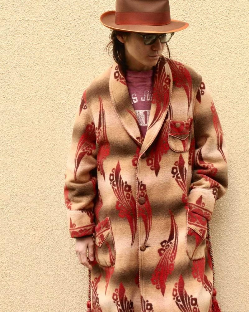 Beacon Blanket Company was founded in Massachusetts in 1904. Initially, they manufactured blankets from recycled yarn, but in 1925, they moved their factory to North Carolina, closer to the source of their cotton. They became extremely popular through their store brand in the 1930s. This is a 1940s ombré-labeled 100% cotton gown. The unique dyeing technique creates a beautiful gradation, resulting in a soft, natural texture from the fine-weave flannel fabric. (By the 1950s, looms that produced this fine weave were no longer in use, and rayon (acetate) was used instead, making this a rare piece from before that time.) The vintage-inspired Native American pattern and detailed piping and cording make this a rare piece of high quality. Considering its age, this piece is in excellent condition, and it can be fastened with buttons and worn like a coat. The tailored silhouette and patterning are roomy yet streamlined. As this is an old item, there may be occasional signs of aging. Please review the photos and understand the nature of vintage items before purchasing.