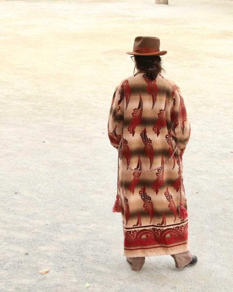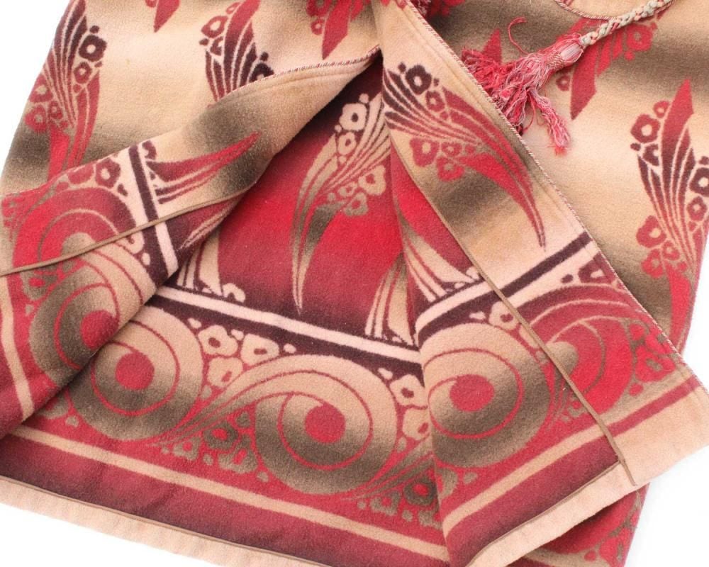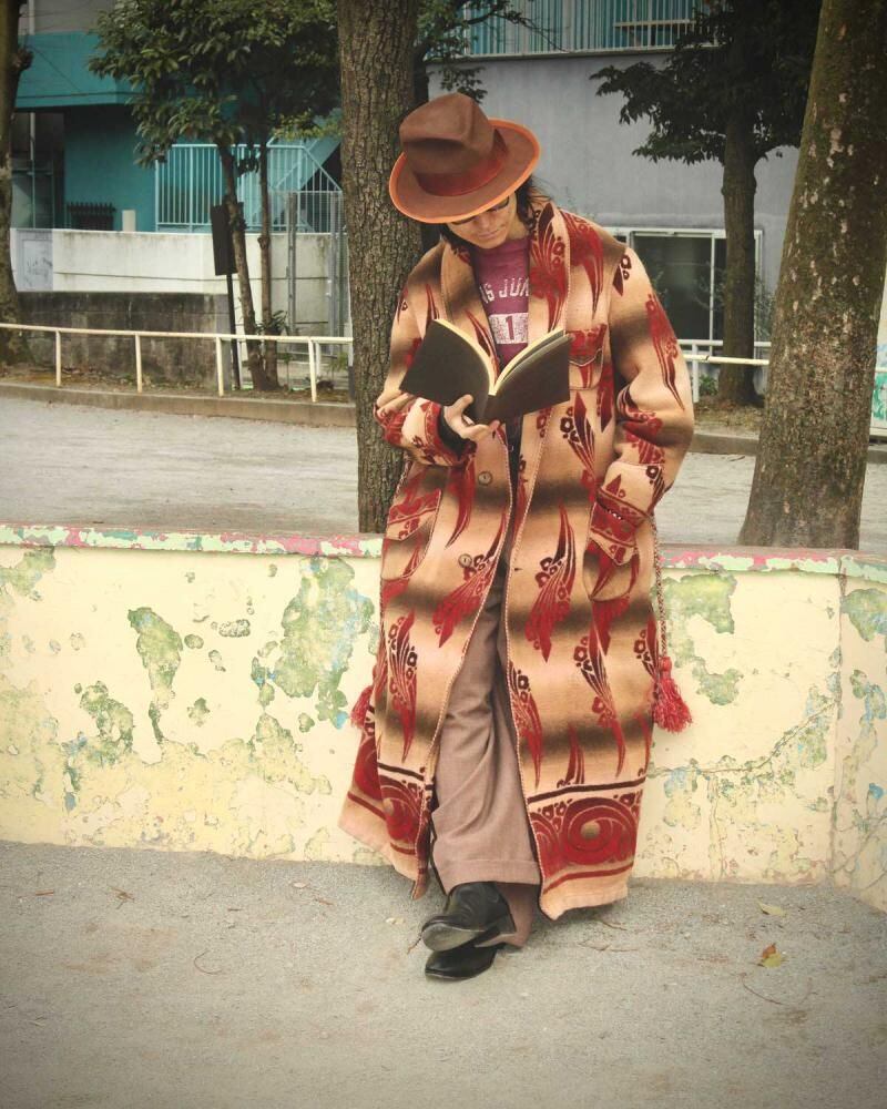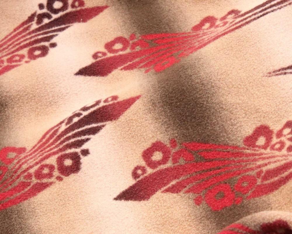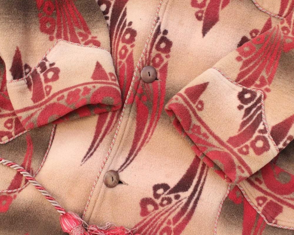 Beacon Blanket Company was founded in Massachusetts in 1904. Initially, they manufactured blankets from recycled yarn, but in 1925, they moved their factory to North Carolina, closer to the source of their cotton. They became extremely popular through their store brand in the 1930s. This is a 1940s ombré-labeled 100% cotton gown. The unique dyeing technique creates a beautiful gradation, resulting in a soft, natural texture from the fine-weave flannel fabric. (By the 1950s, looms that produced this fine weave were no longer in use, and rayon (acetate) was used instead, making this a rare piece from before that time.) The vintage-inspired Native American pattern and detailed piping and cording make this a rare piece of high quality. Considering its age, this piece is in excellent condition, and it can be fastened with buttons and worn like a coat. The tailored silhouette and patterning are roomy yet streamlined. As this is an old item, there may be occasional signs of aging. Please review the photos and understand the nature of vintage items before purchasing.