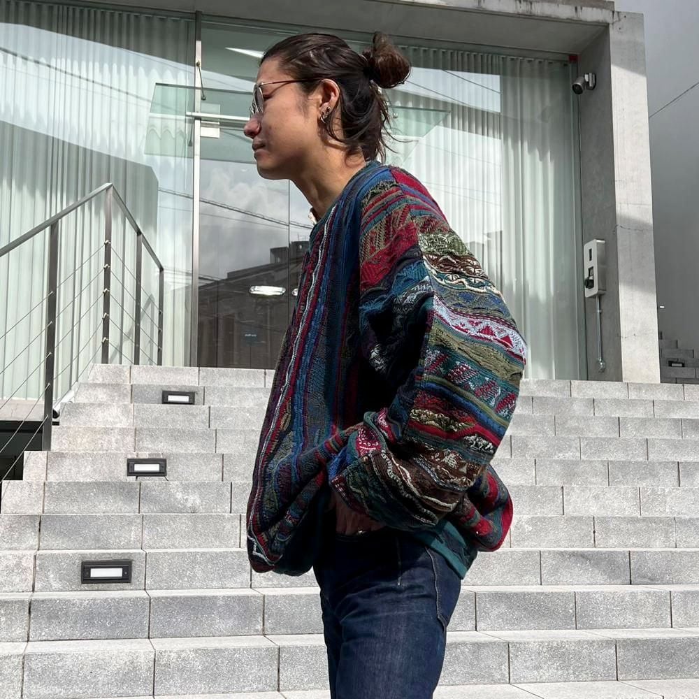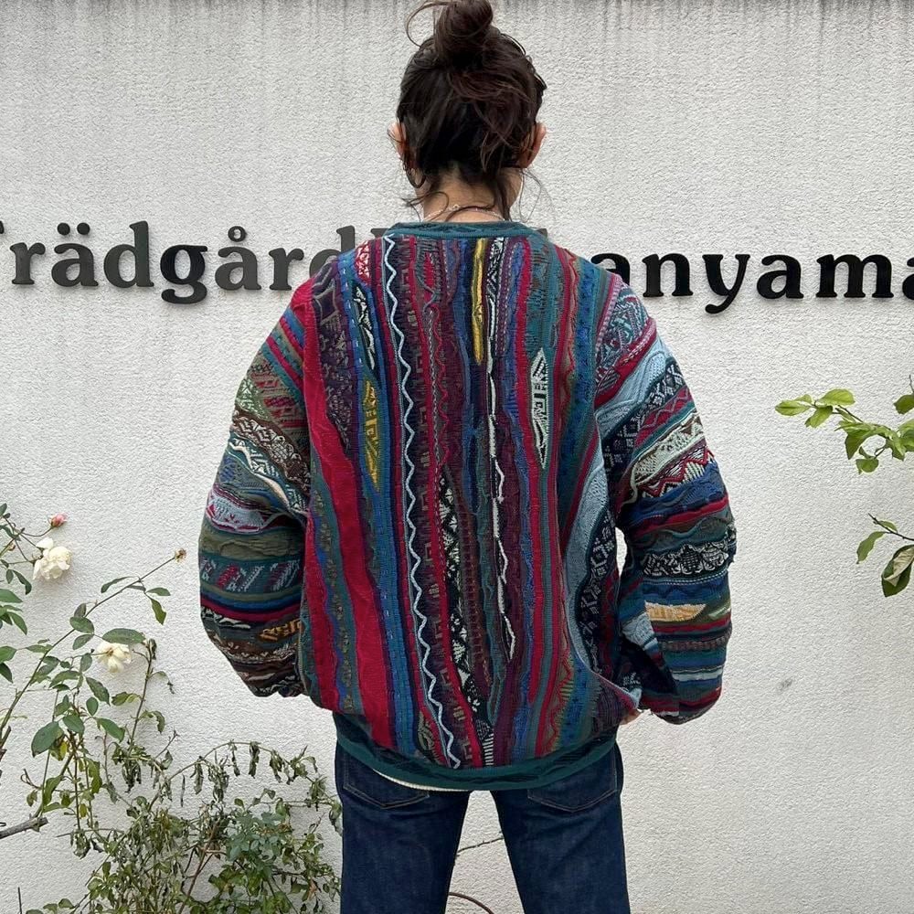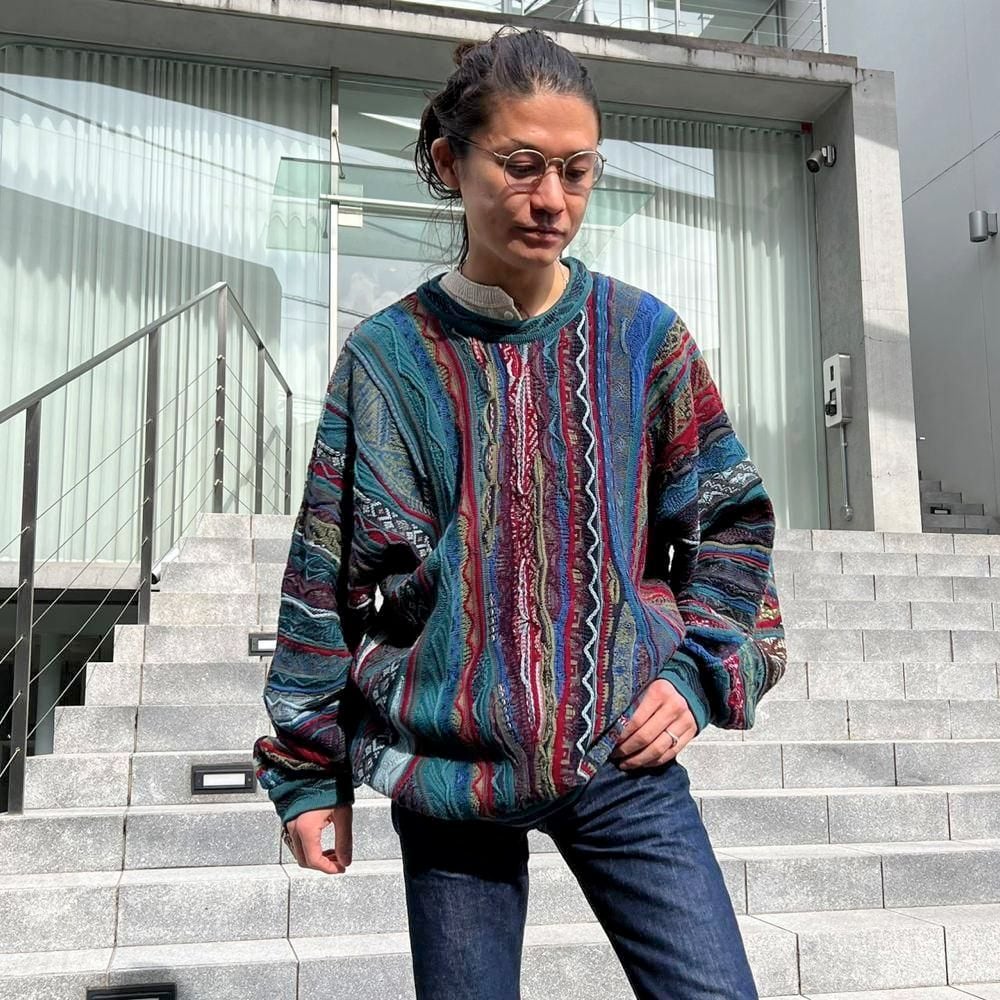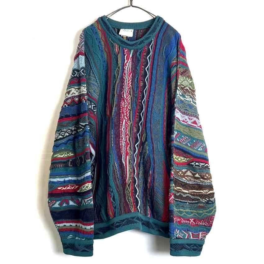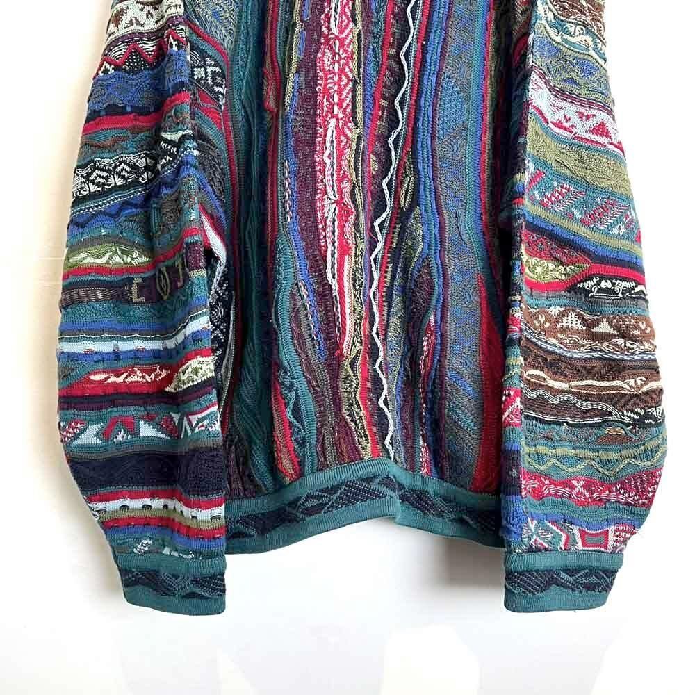 This 90s Koozy cotton sweater features a crazy dark, smoky color and the distinctive 3-D knit of Kooozy, creating a truly stylish look. Its a soft, smooth, and comfortable 100% cotton knit sweater. The size is XL, and it has a relaxed, relaxed silhouette.