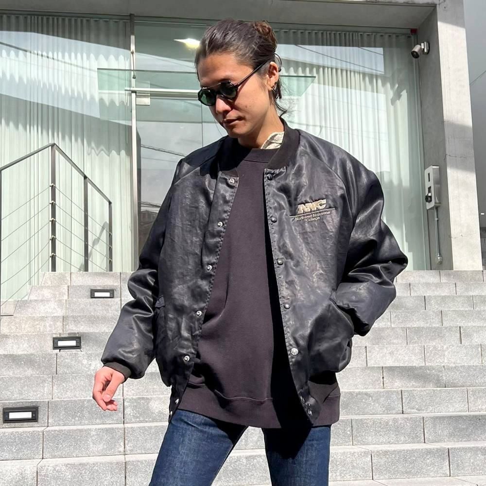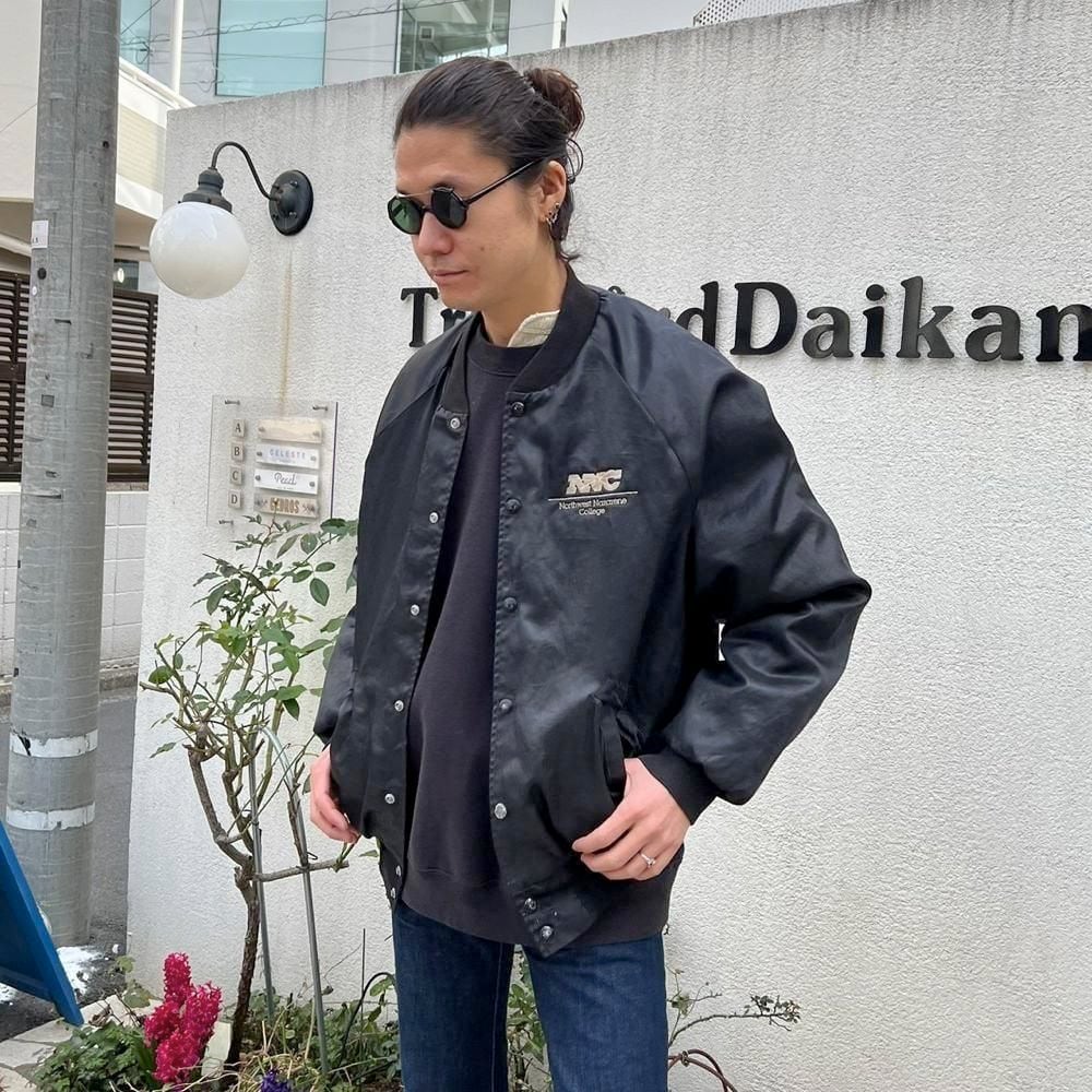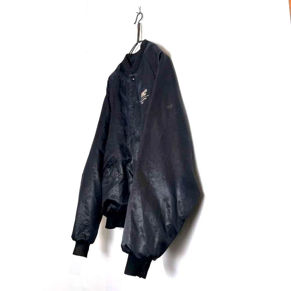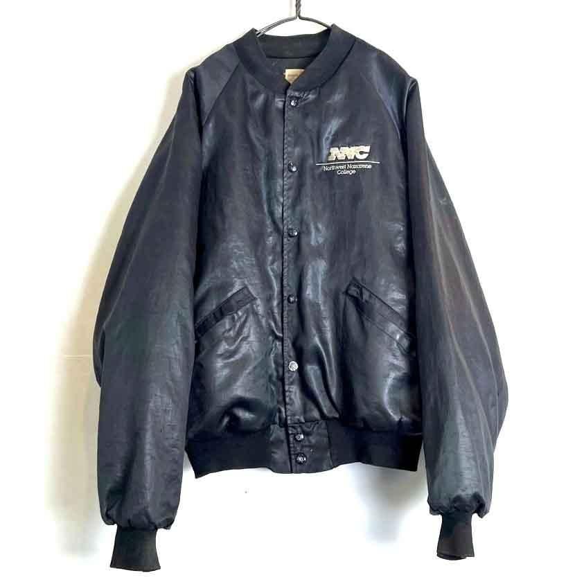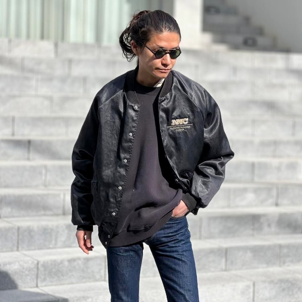 This 1980s Northwest Nazarene University college jacket features a worn nylon fabric with a logo embroidered on the chest, a versatile black color, and a vintage feel. The raglan sleeves, naturally falling shoulders, and overall size balance are excellent.