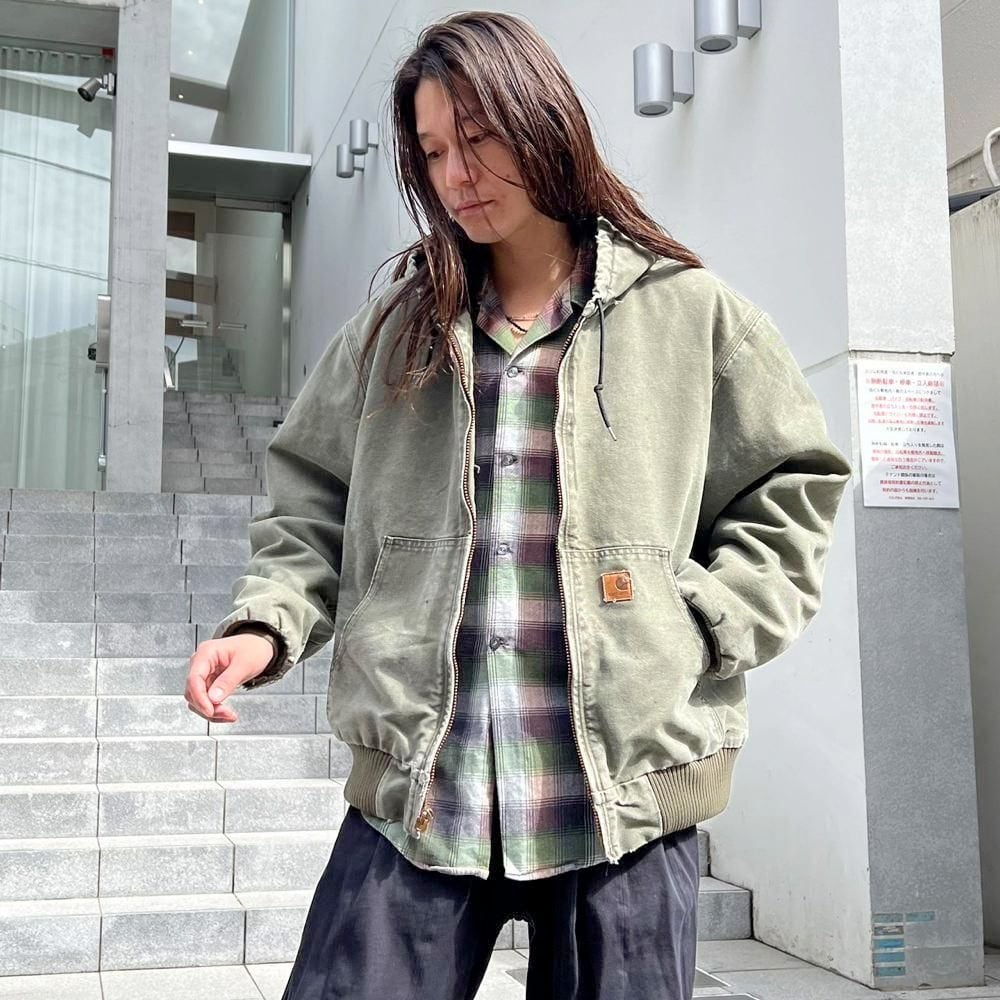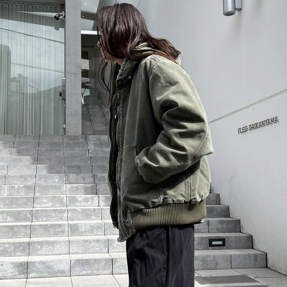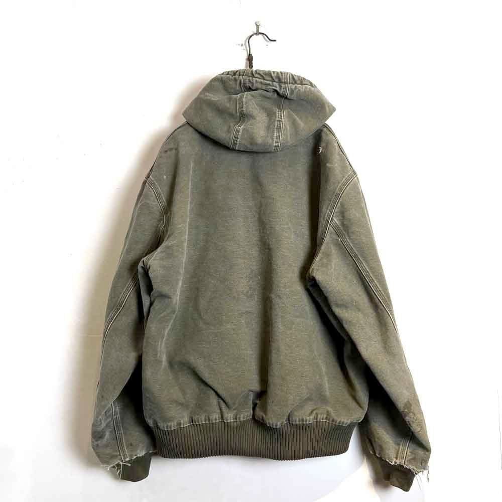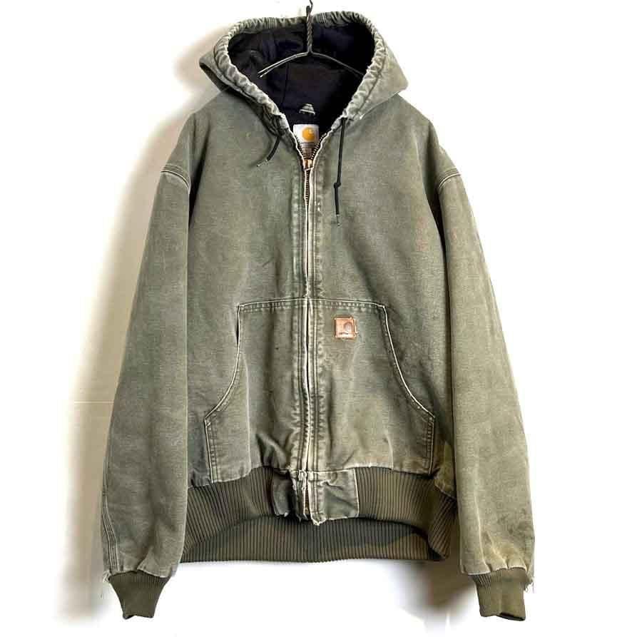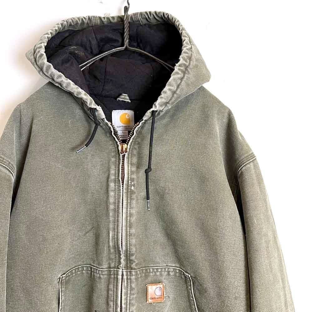 This Carhartt activewear jacket from the 2000s features a military-inspired olive color that has faded nicely over time. Its a size L, and the relaxed fit makes it a perfect piece. Its a great workwear piece that can be worn without worrying about stains or damage.