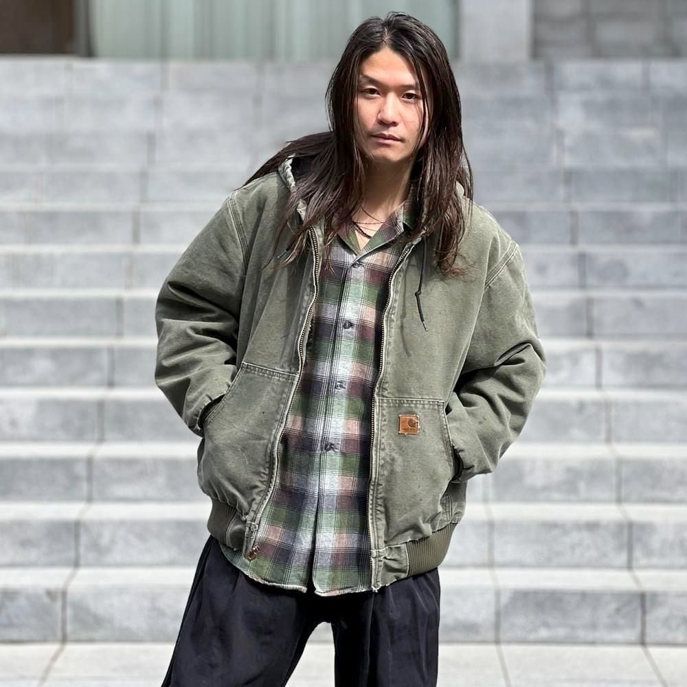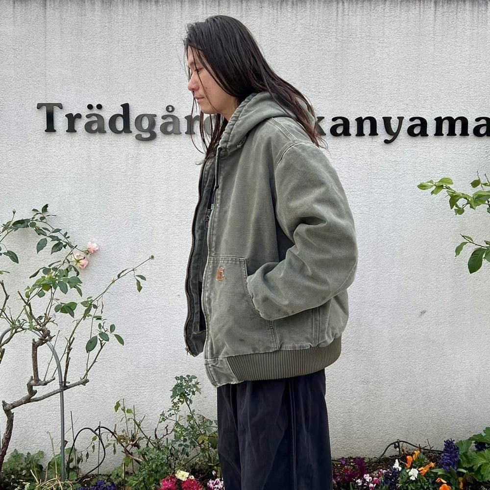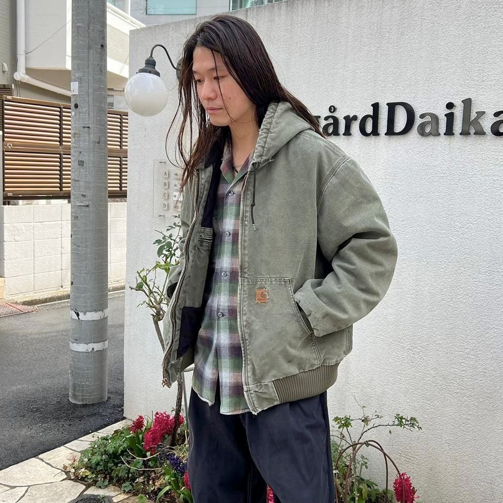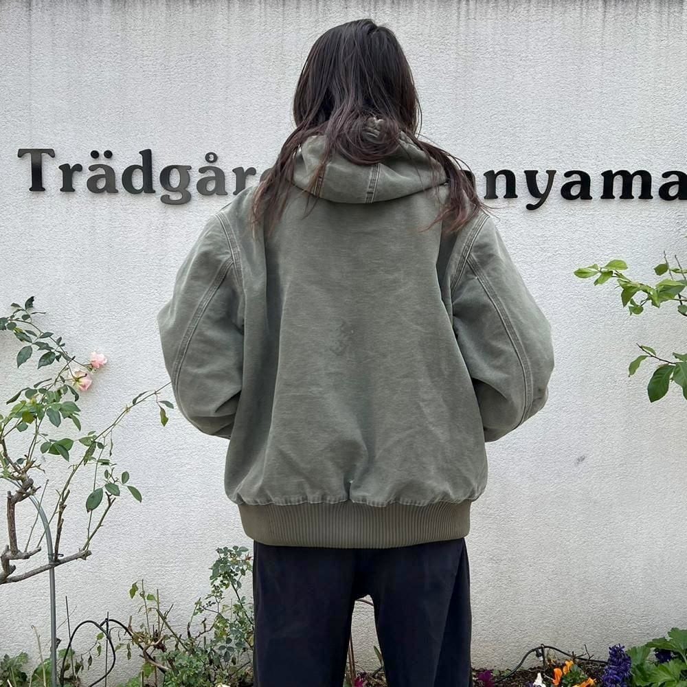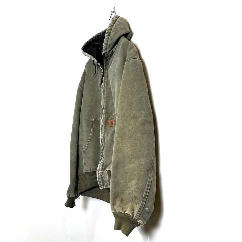 This Carhartt activewear jacket from the 2000s features a military-inspired olive color that has faded nicely over time. Its a size L, and the relaxed fit makes it a perfect piece. Its a great workwear piece that can be worn without worrying about stains or damage.