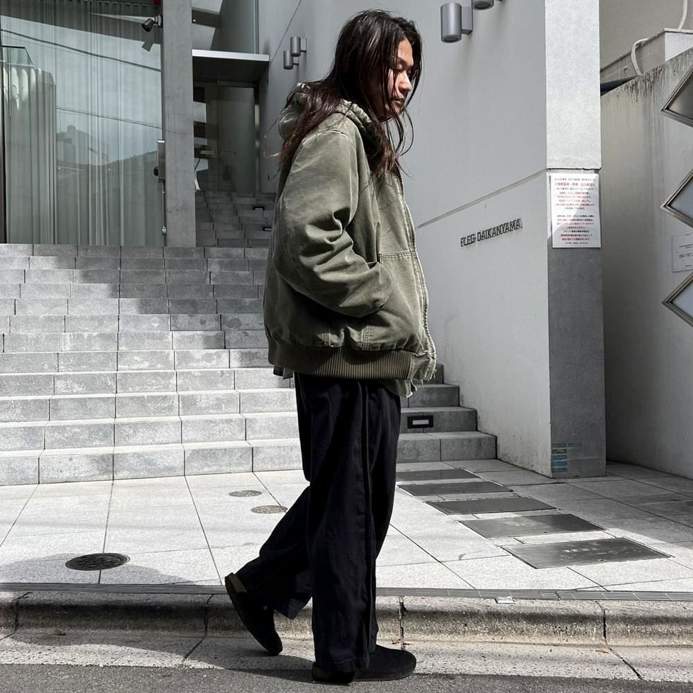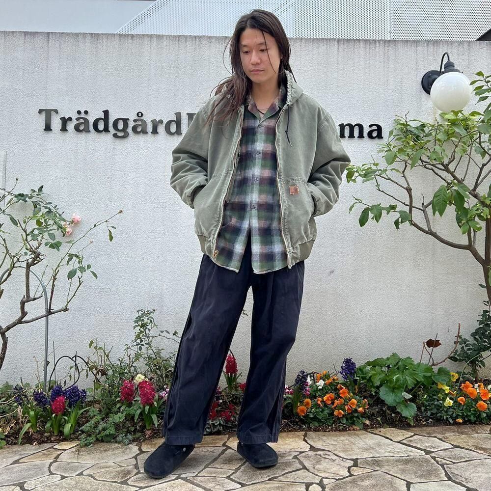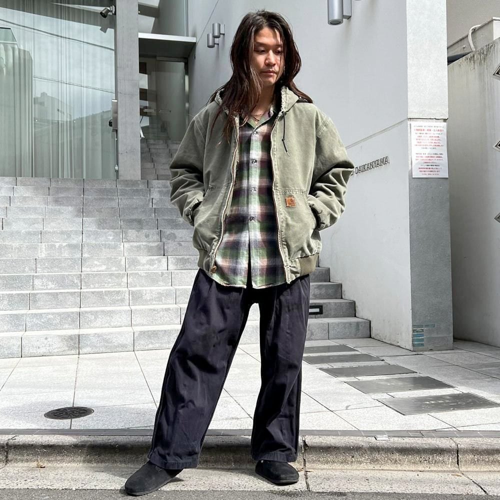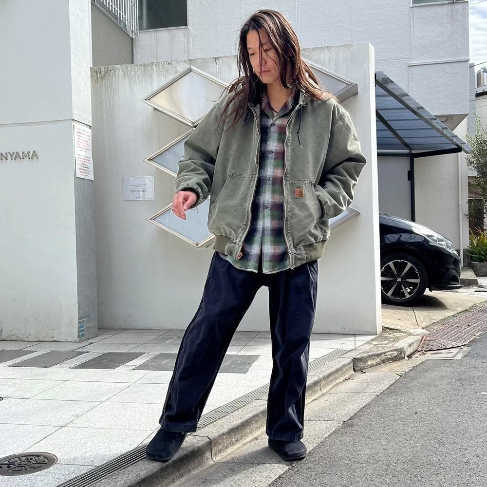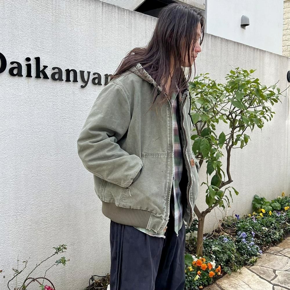 This Carhartt activewear jacket from the 2000s features a military-inspired olive color that has faded nicely over time. Its a size L, and the relaxed fit makes it a perfect piece. Its a great workwear piece that can be worn without worrying about stains or damage.