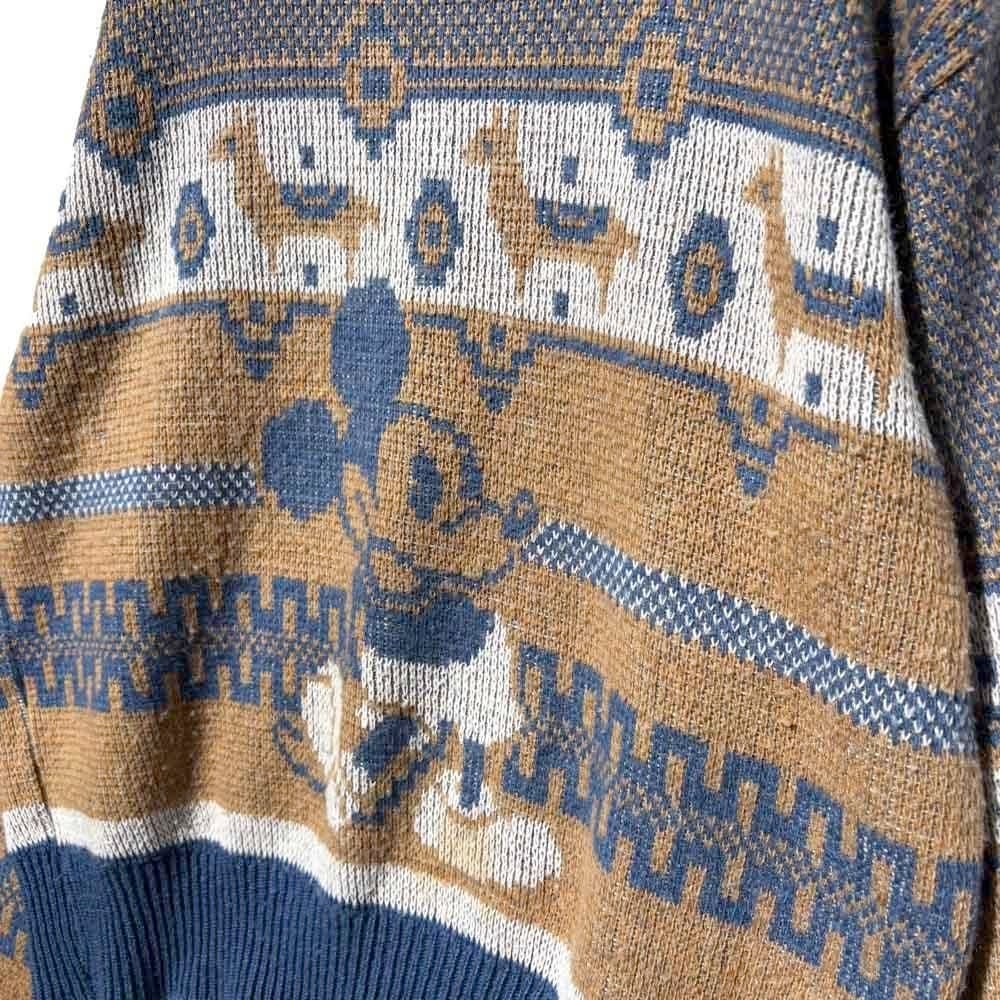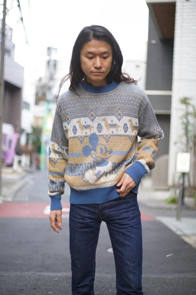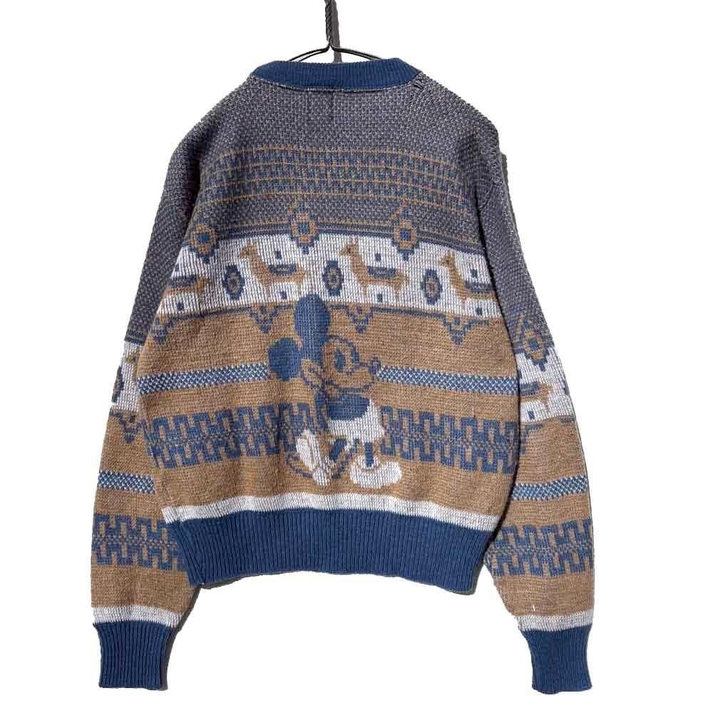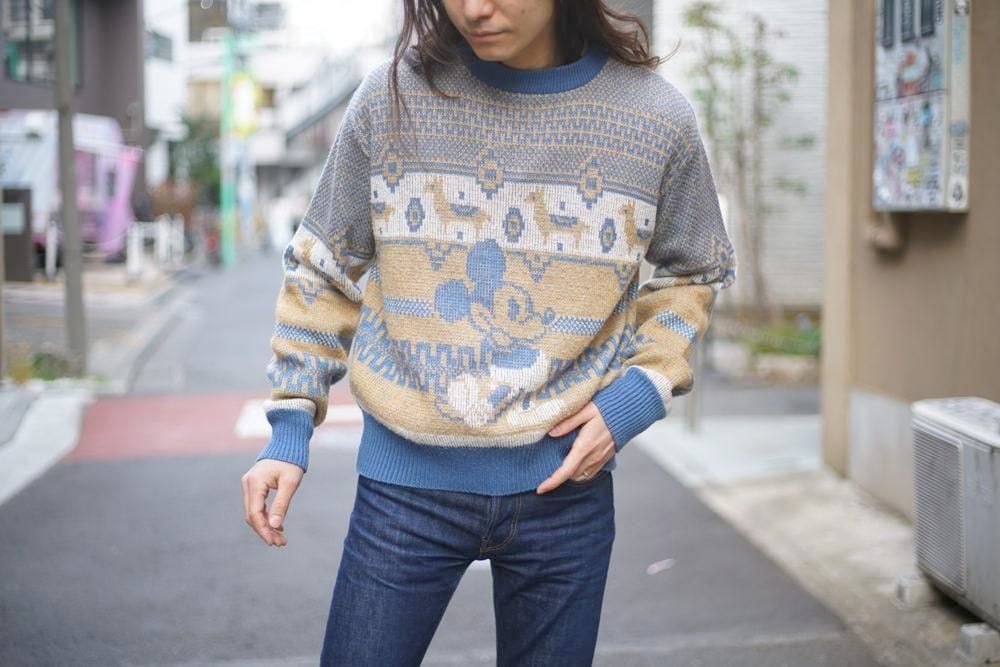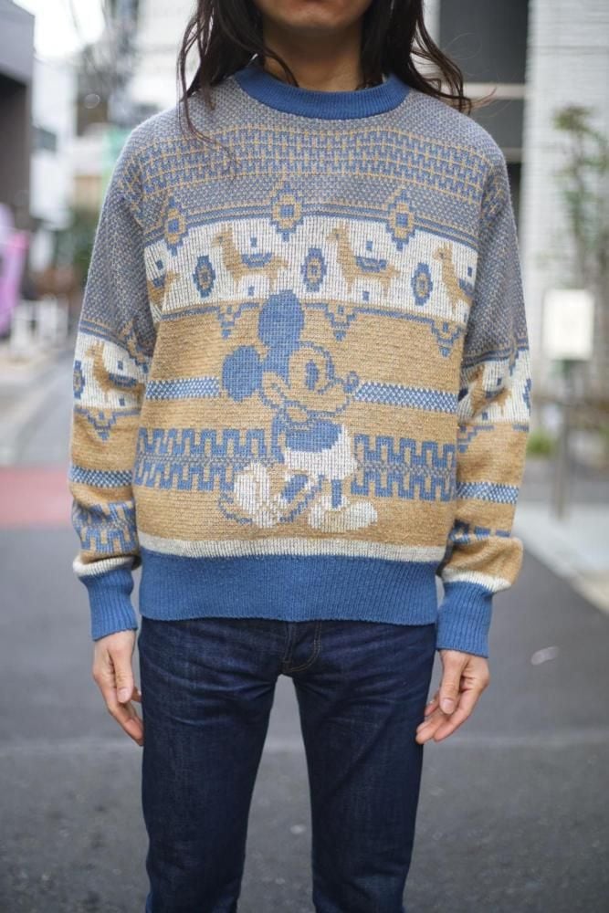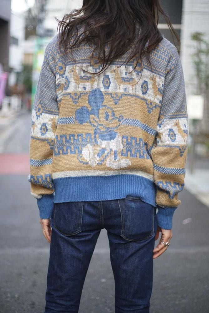 The retro jacquard knit pattern, typical of this era, and Nordic patterns, along with Mickey and Minnie create a cute look.