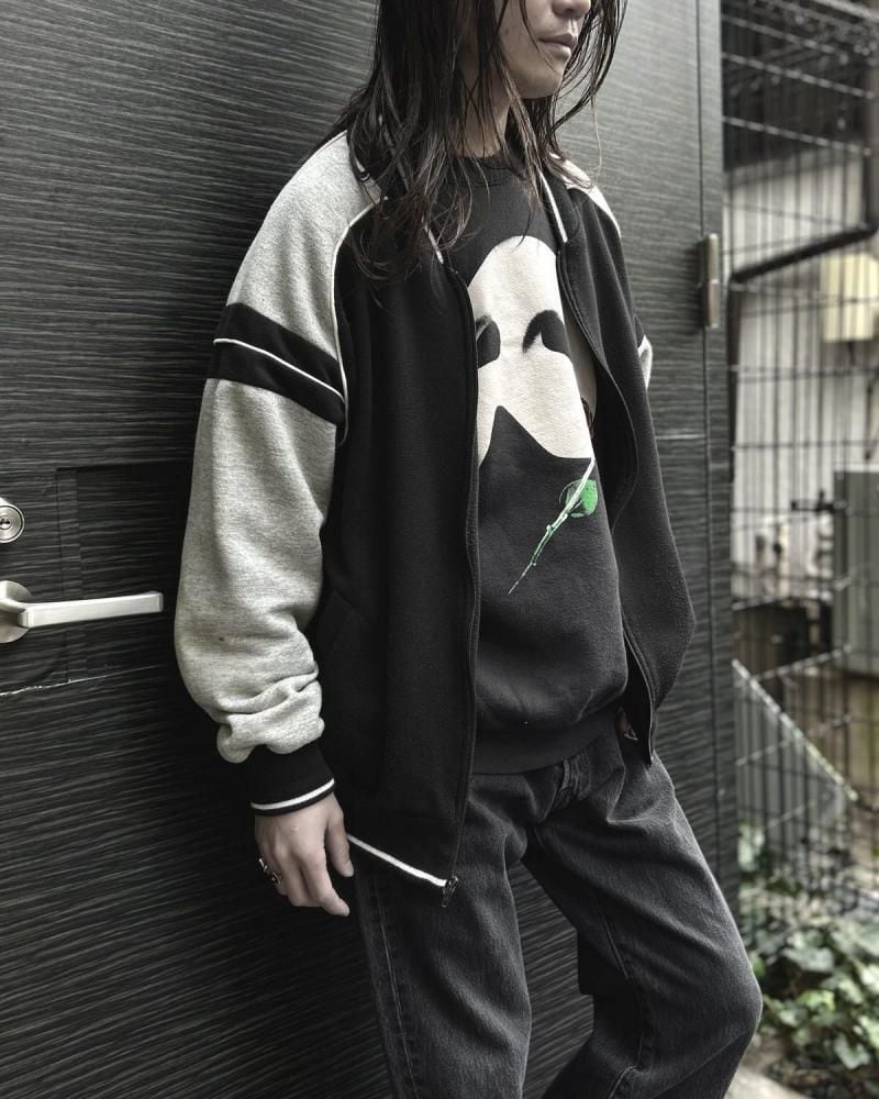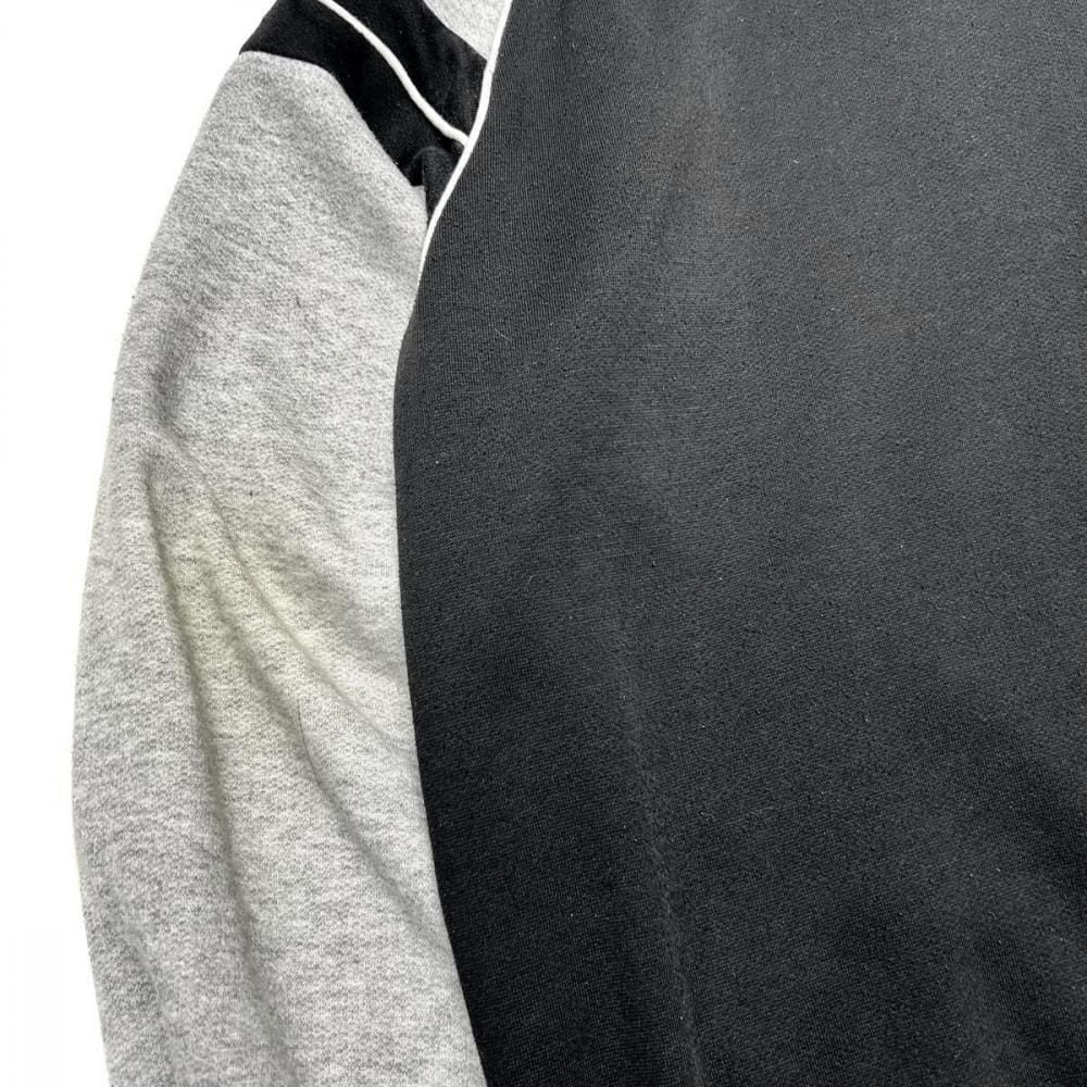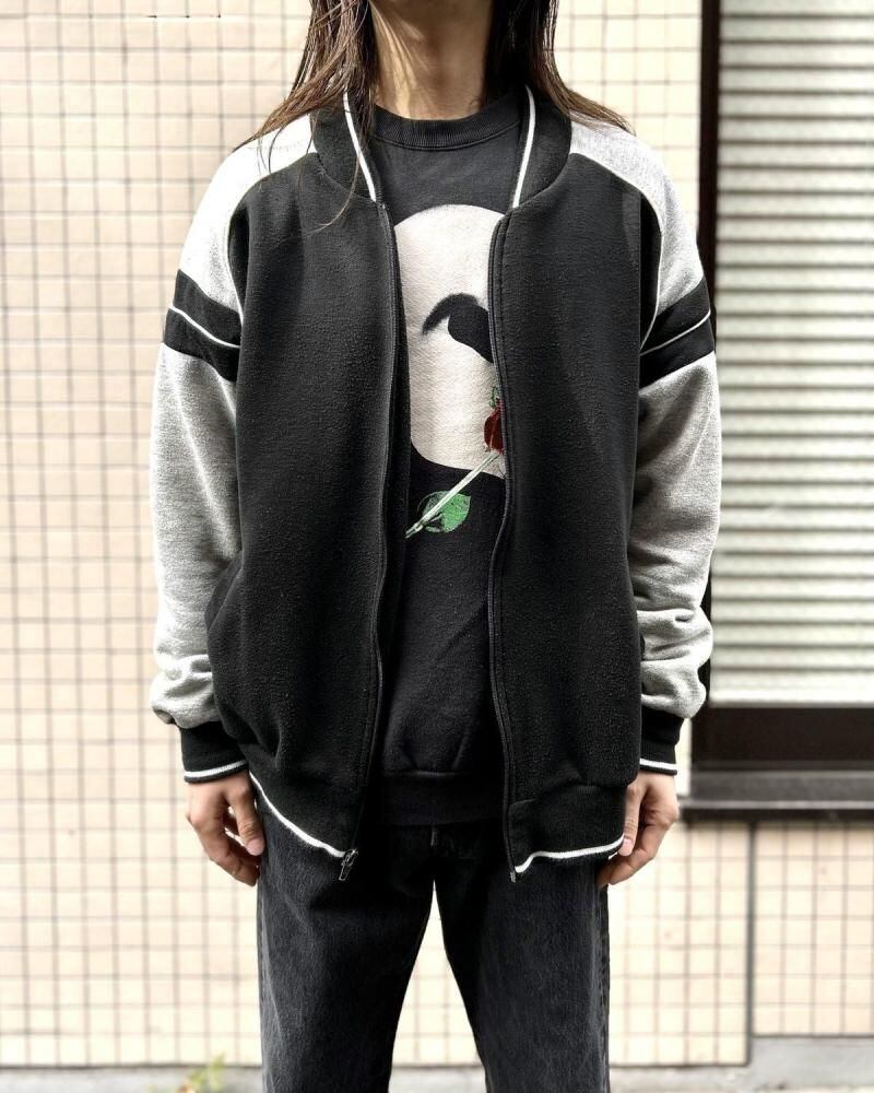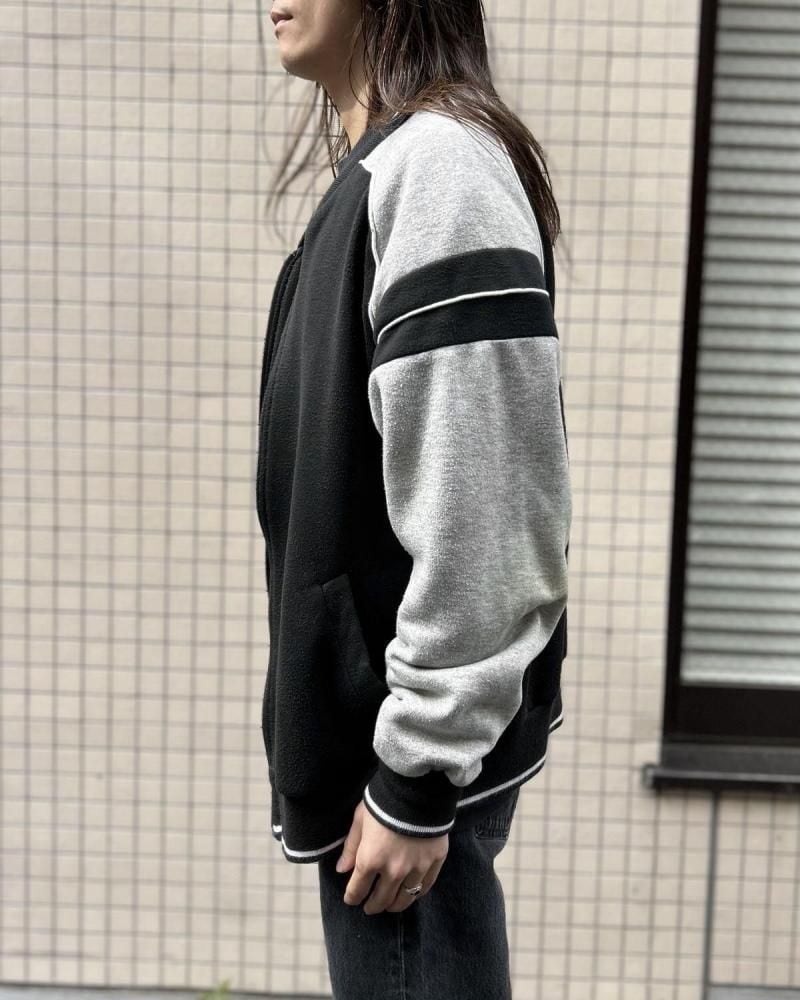 This cardigan is made from sweatshirt fabric and dates back to the 1990s. Its design, reminiscent of an award-winning jacket or sports jersey, allows for a light, cardigan-like feel. Made from a soft blend of polycotton and rayon, its monochrome color scheme makes it a versatile piece. Its relaxed silhouette offers a comfortable feel. As this is an old item, there may be some slight fading over time. Please review the photos and understand the unique characteristics of vintage items before purchasing.