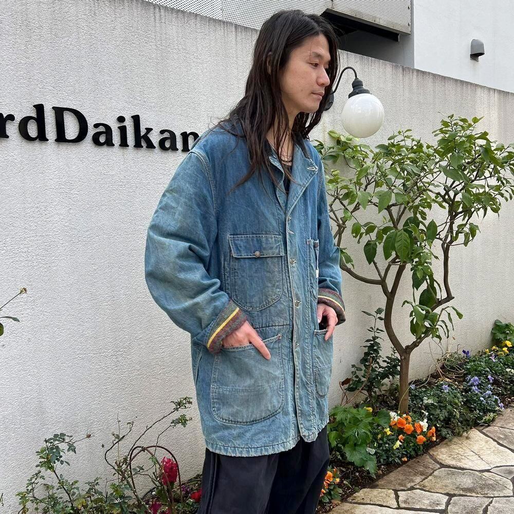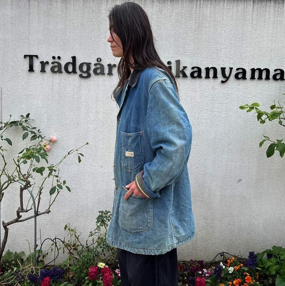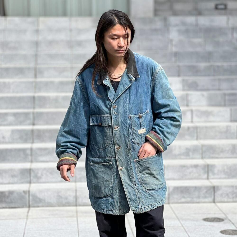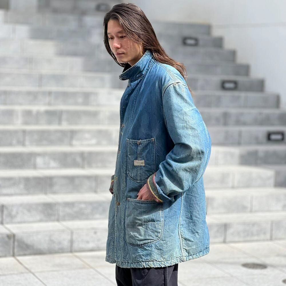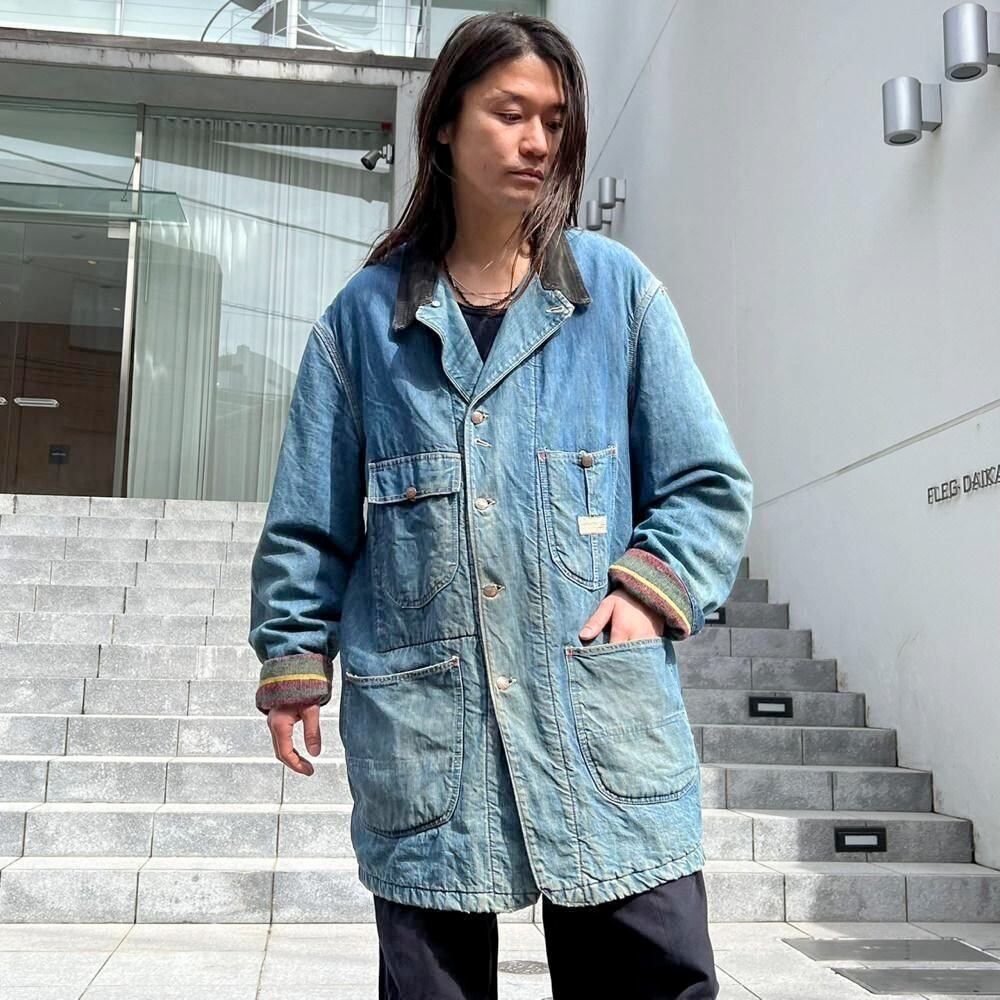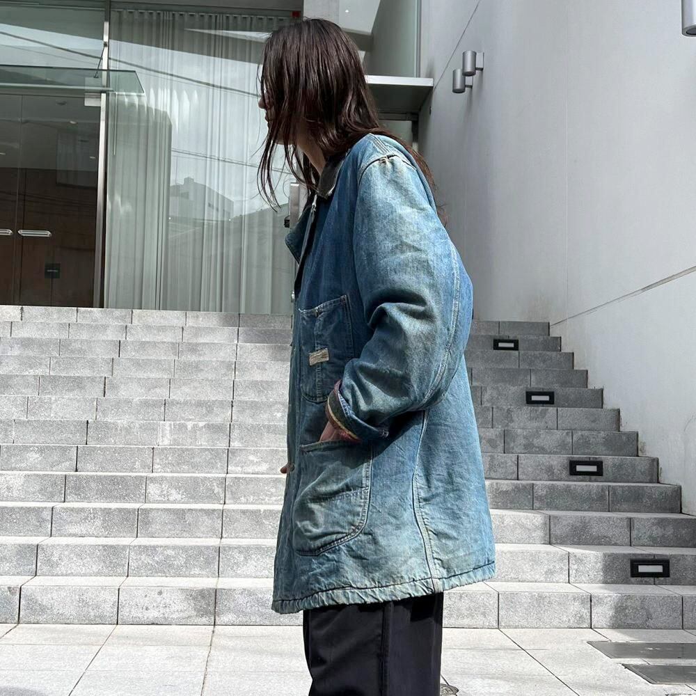This is a super fresh piece with a long silhouette and a half-coat-like length, likely in sizes 3XL to 4XL. The soft, aged denim texture and beautifully faded indigo color create a truly stylish look.