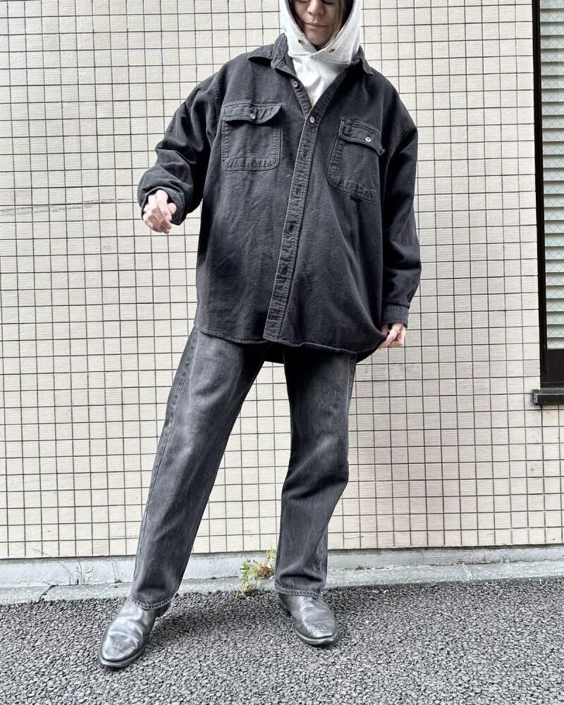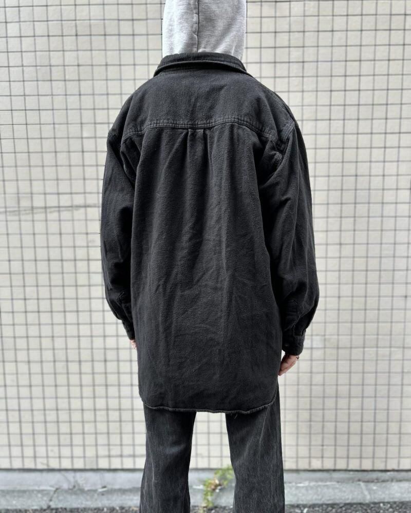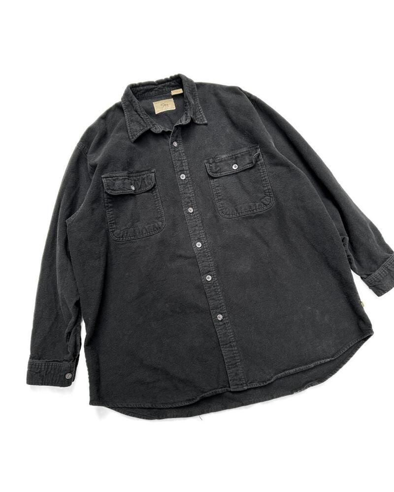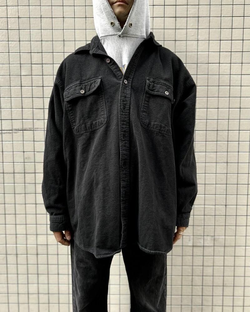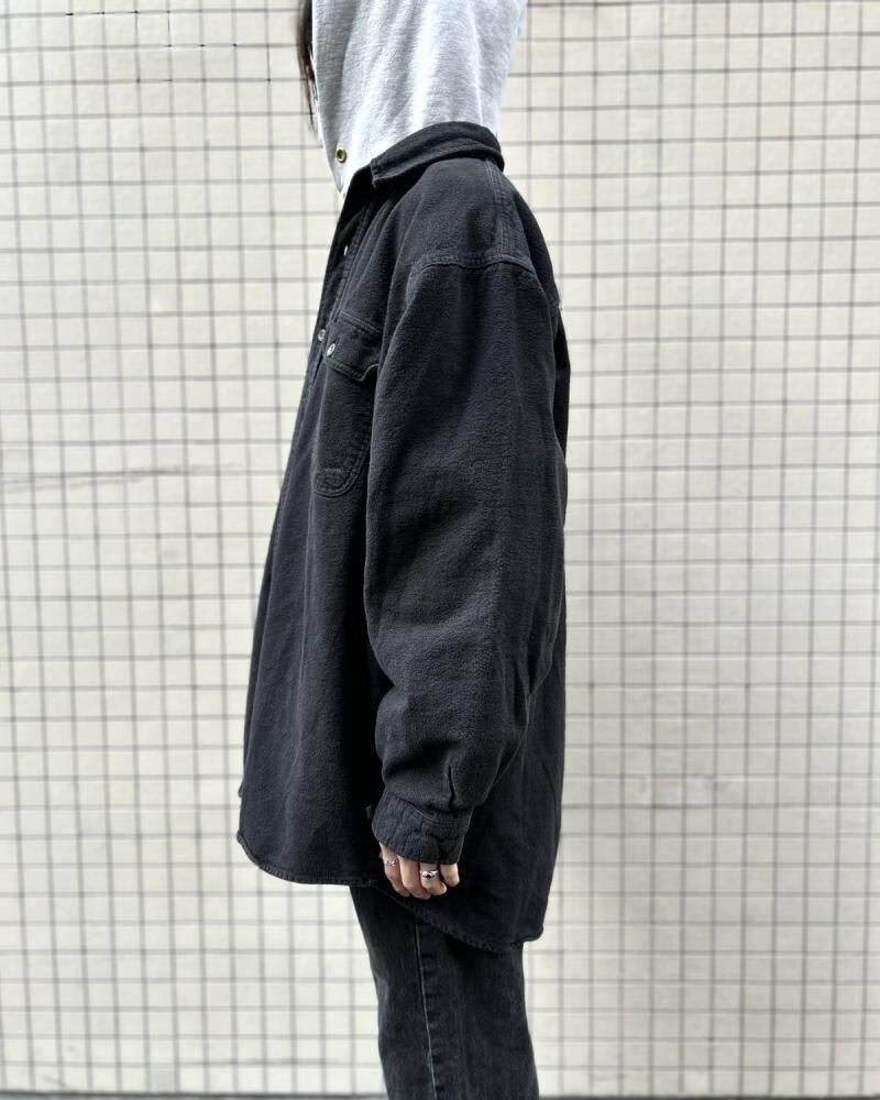 This cotton flannel shirt dates back to the 1990s. The tightly woven fabric and unusual all-black color create a masculine yet minimalist look. The oversized 2XL silhouette also lends it a relaxed feel, making it easy to wear. As this is an old item, there may be some slight fading over time. Please review the photos and understand the unique characteristics of vintage items before purchasing.