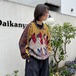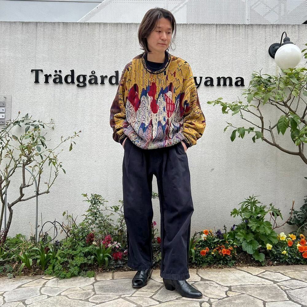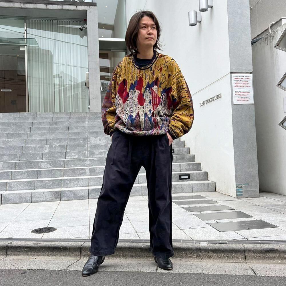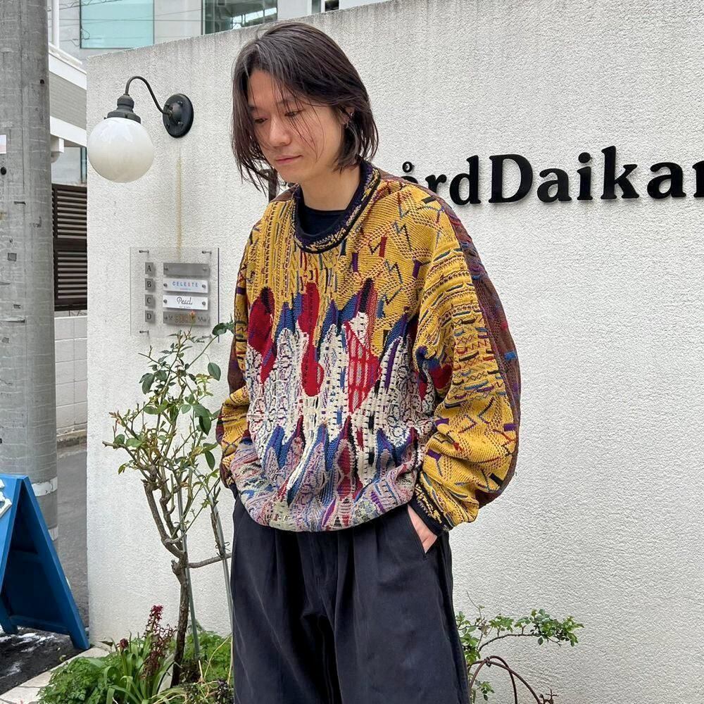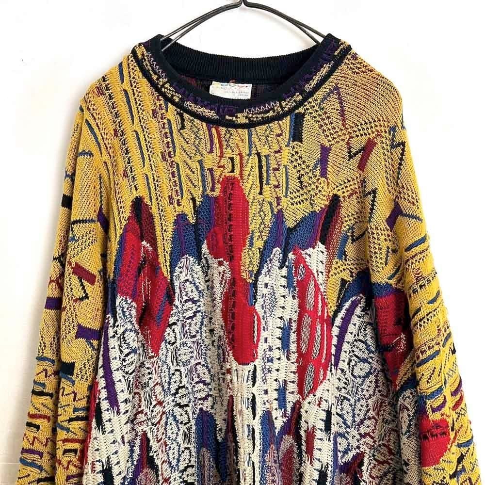 A crewneck sweater from the 90s by Coozy, featuring a rhythmic, wavy knit pattern. The front is mustard-colored, while the back is predominantly brown, creating a unique and playful color scheme that contrasts dramatically between the front and back.