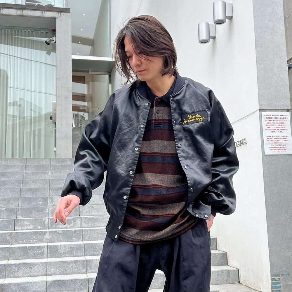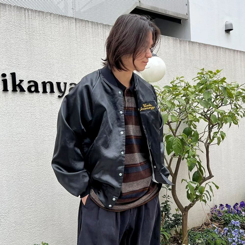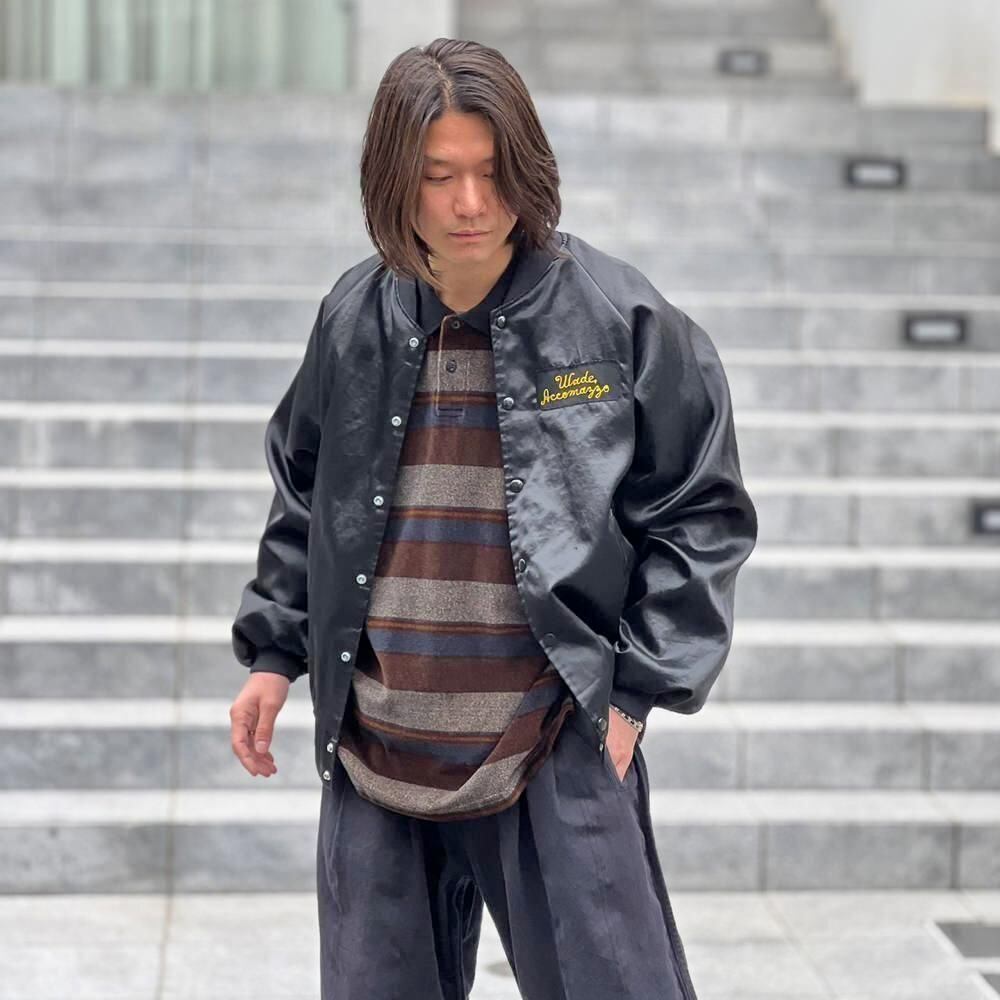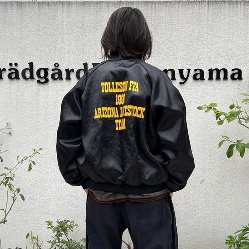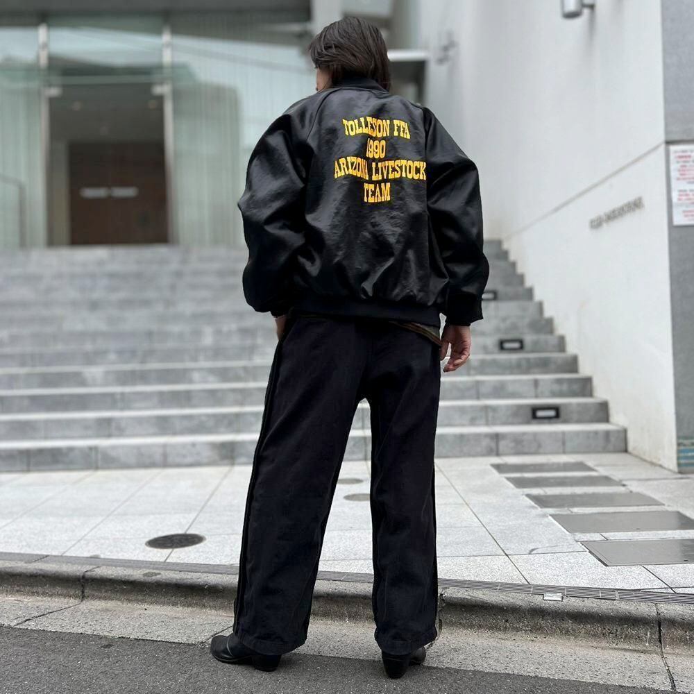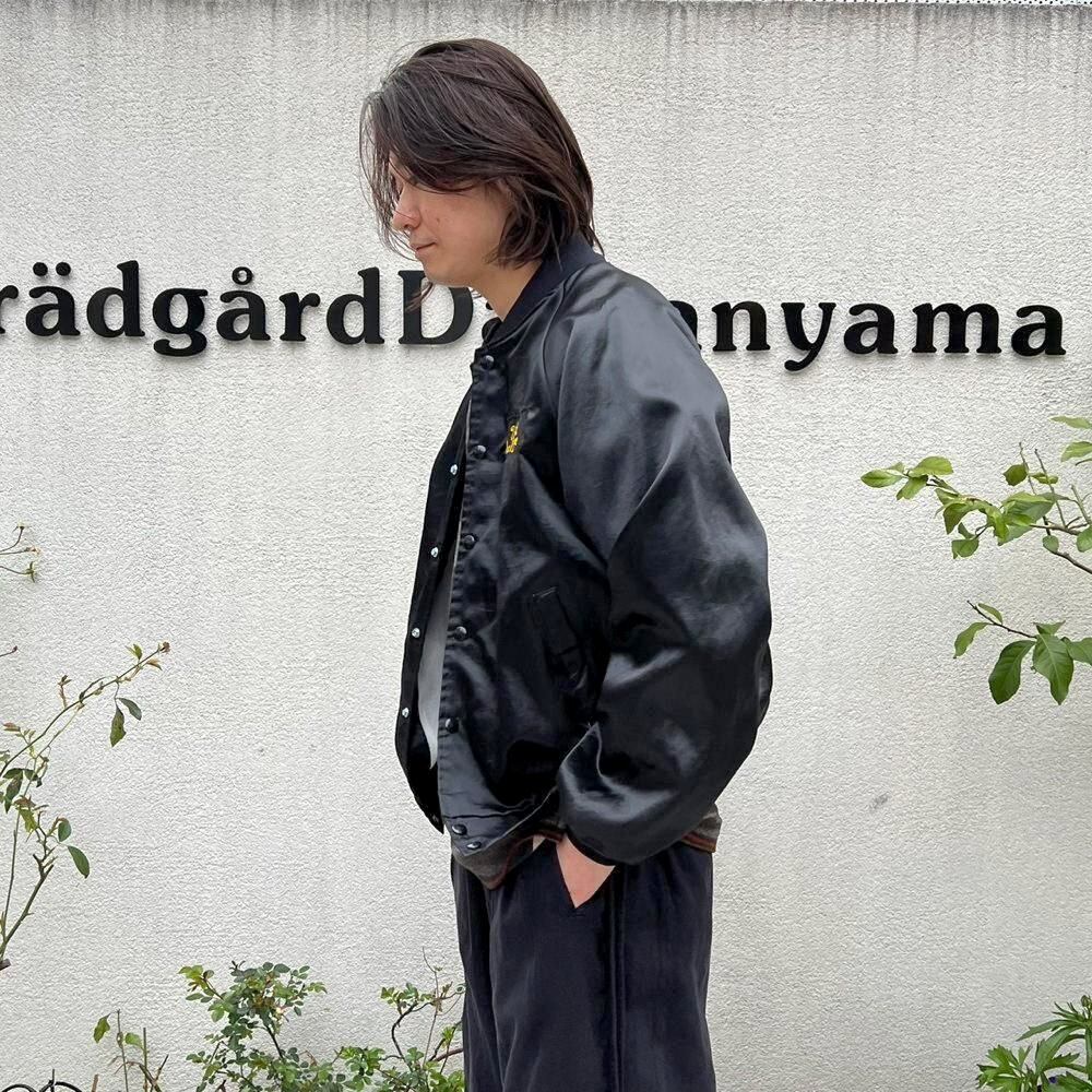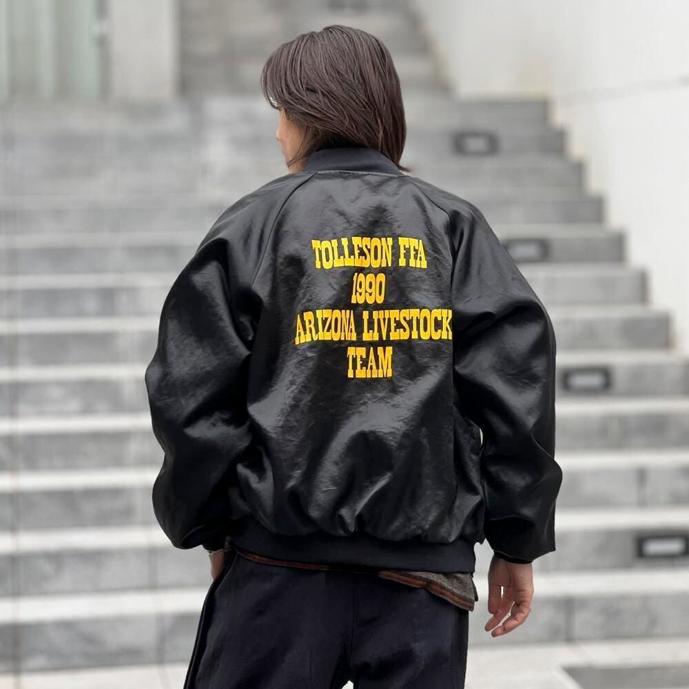 While FFA jackets are famously made of navy corduroy, this one is made of lightweight nylon. The yellow stitching on the name patch stands out against the black nylon satin fabric, and the print on the back gives it a great look. It has a comfortable, relaxed fit and is the perfect light outer layer for spring.