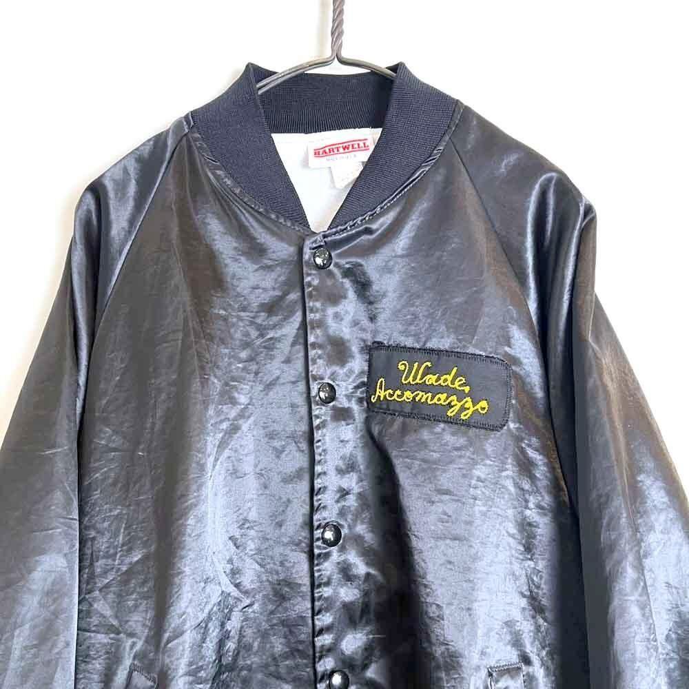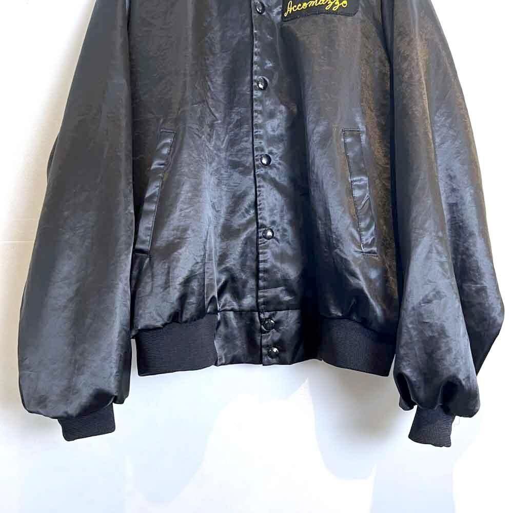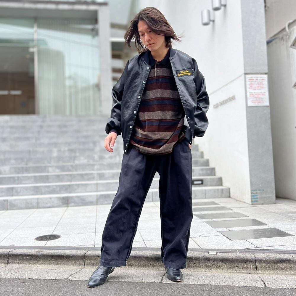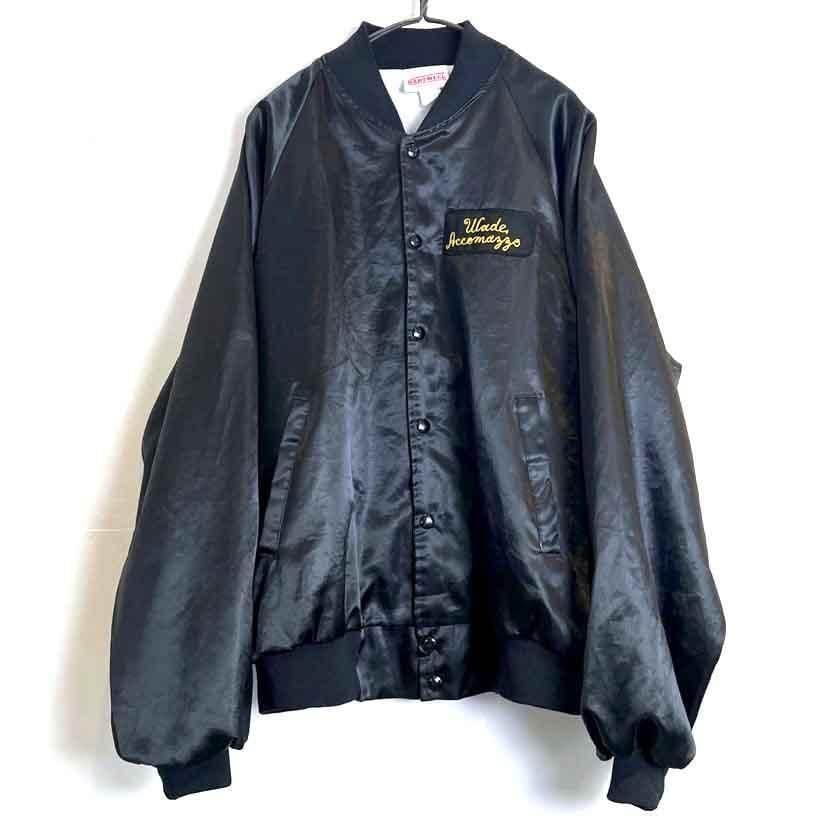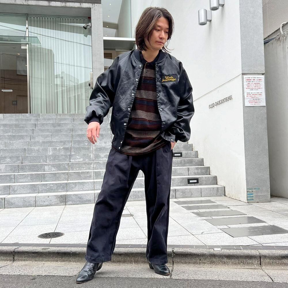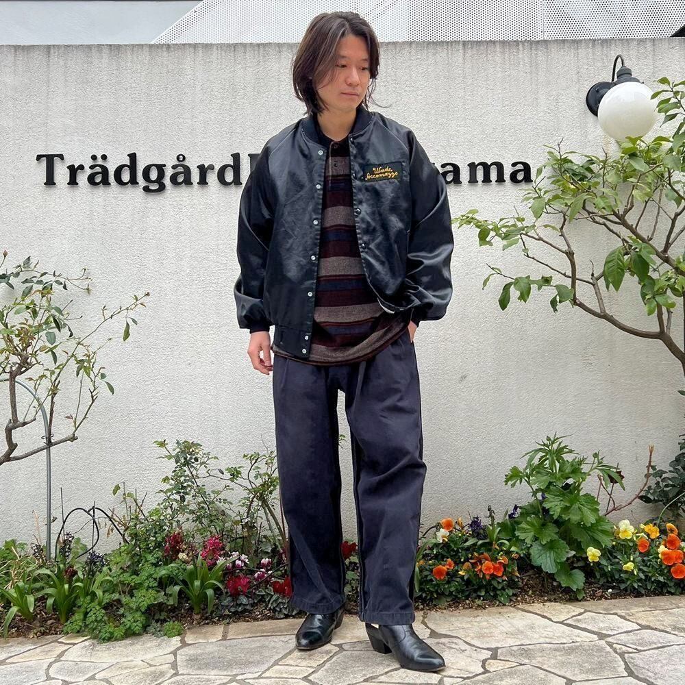 While FFA jackets are famously made of navy corduroy, this one is made of lightweight nylon. The yellow stitching on the name patch stands out against the black nylon satin fabric, and the print on the back gives it a great look. It has a comfortable, relaxed fit and is the perfect light outer layer for spring.