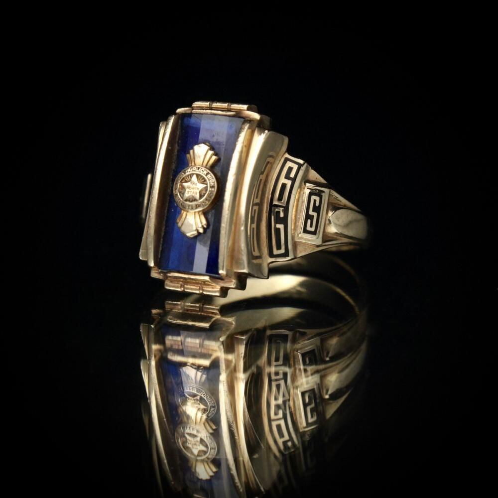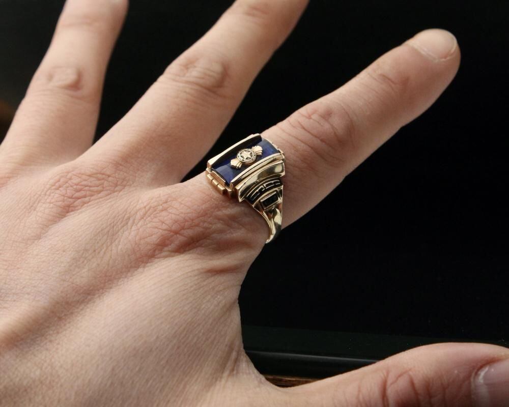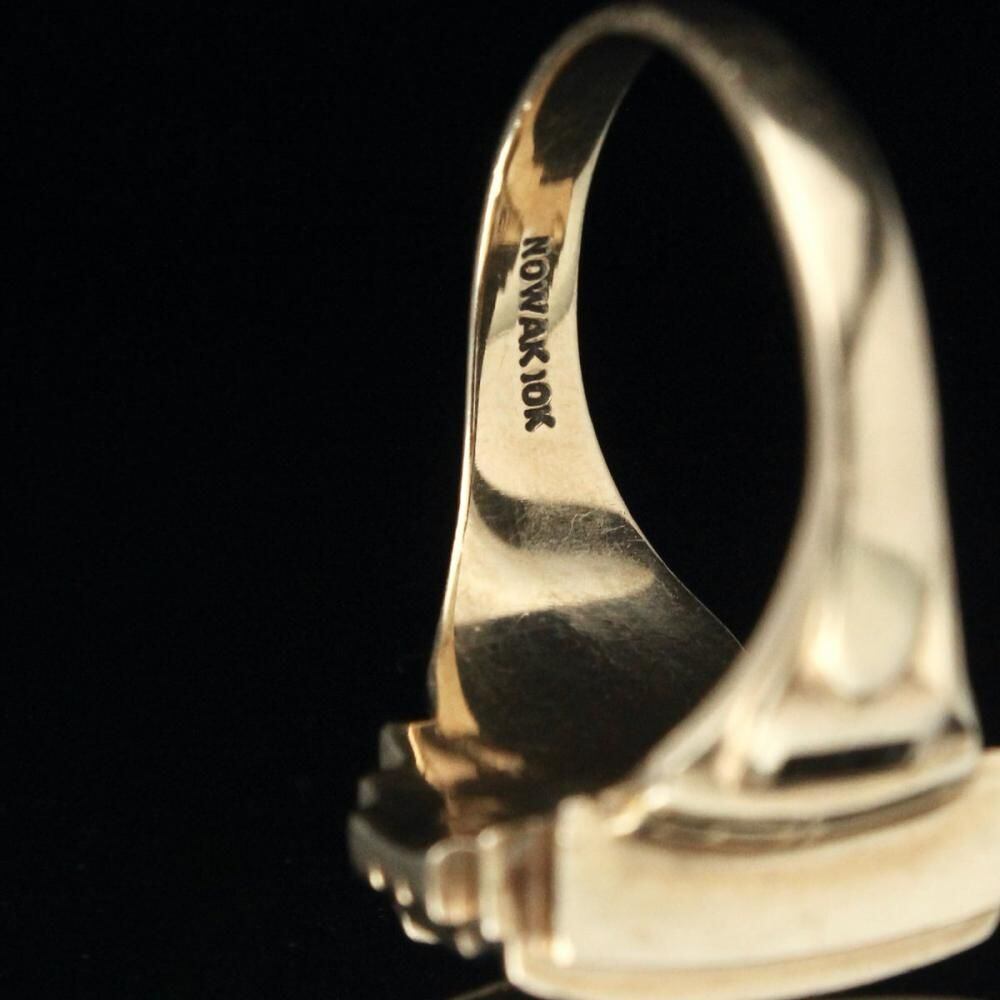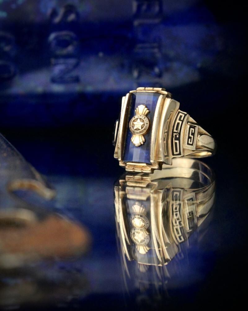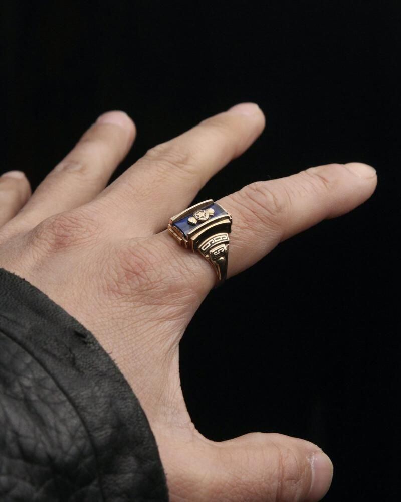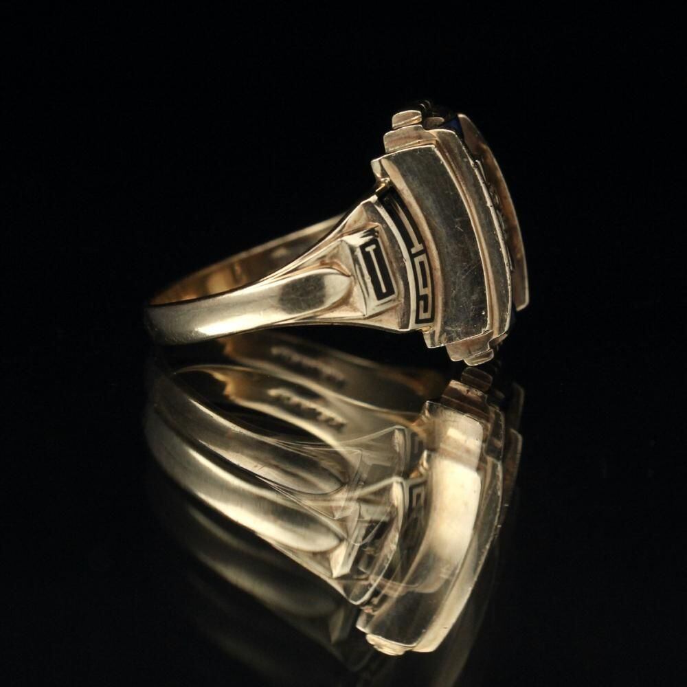 A vintage class ring from 1966. It retains the Art Deco influence with its angular silhouette, substantial medium-sized top, and striking top stone. The star emblem on the top is also a memorable design element. Made by NOMAK, stamped with 10kt gold. There is a slight chip on the onyx. Please check the condition in the photos and understand the characteristics of vintage items before purchasing.